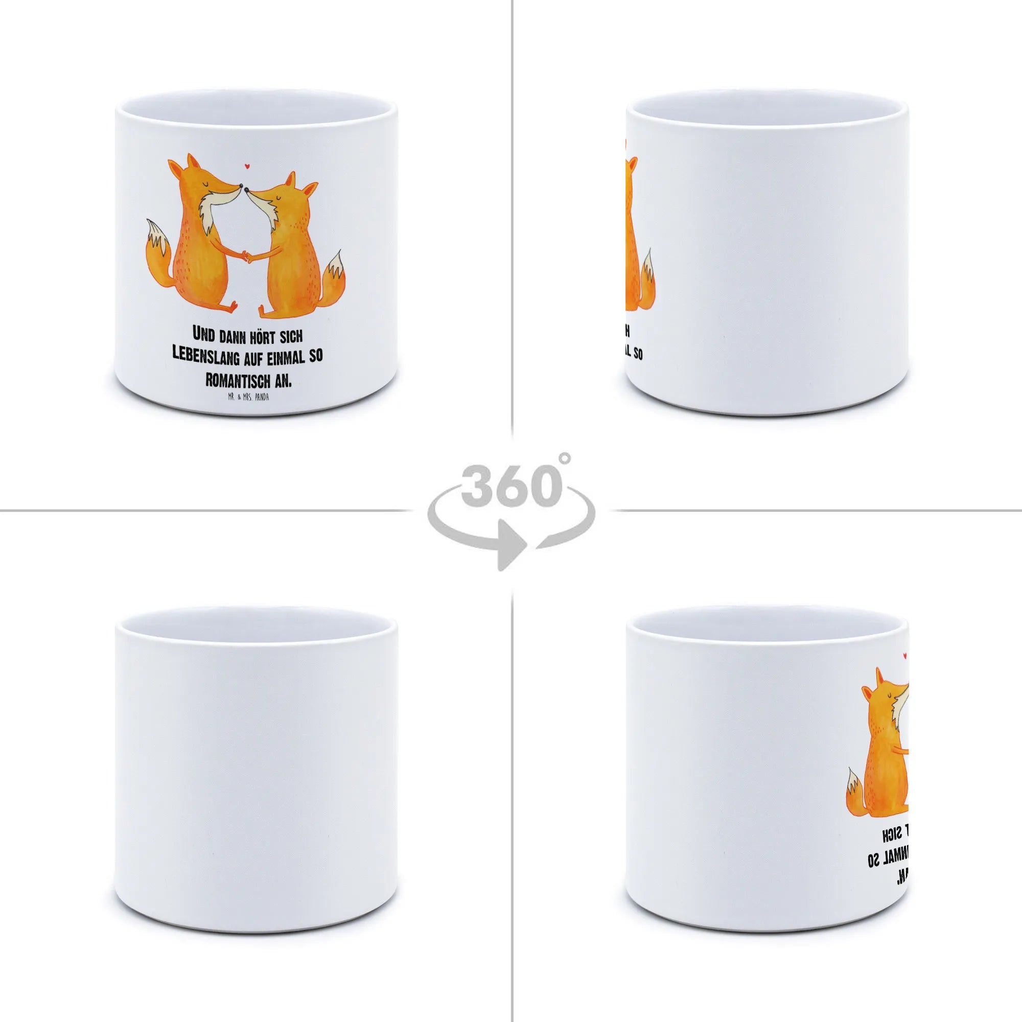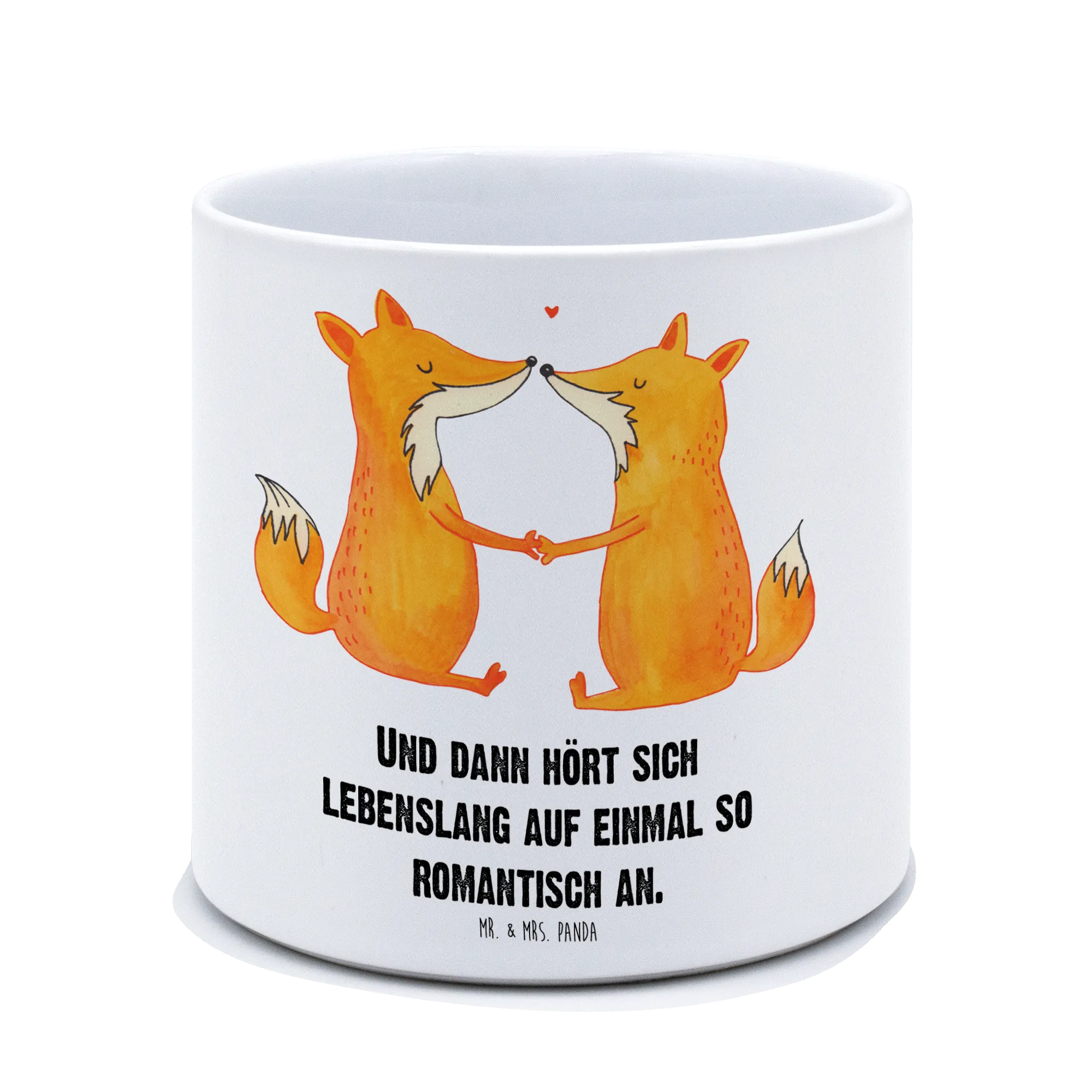 Der XL Blumentopf Füchse Liebe aus der Kollektion Fuchs von Mr. & Mrs. Panda ist das perfekte Geschenk für alle, die die Liebe in ihren vier Wänden zum Ausdruck bringen möchten. Dieser wunderschöne Blumentopf aus glänzender Keramik begeistert mit seinem einzigartigen Design, das zwei süße Füchse zeigt, die Händchen halten. Der Spruch "Und dann hört sich lebenslang auf einmal so romantisch an." verleiht dem Topf eine zauberhafte Note, die Herzen höher schlagen lässt.