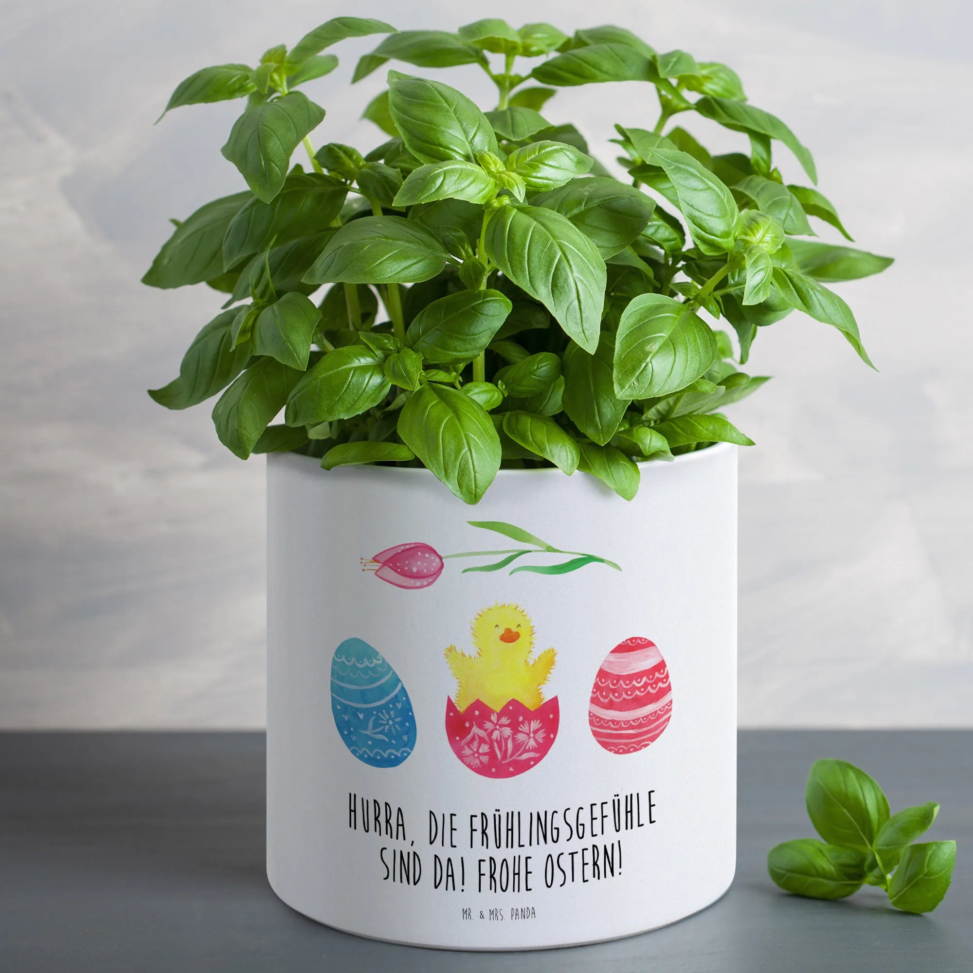 Der Blumenkübel hat ein entzückendes Kükenmotiv, das liebevoll aus einem Ei schlüpft und mit dem Spruch "Hurra, die Frühlingsgefühle sind da! Frohe Ostern!" begeistert.