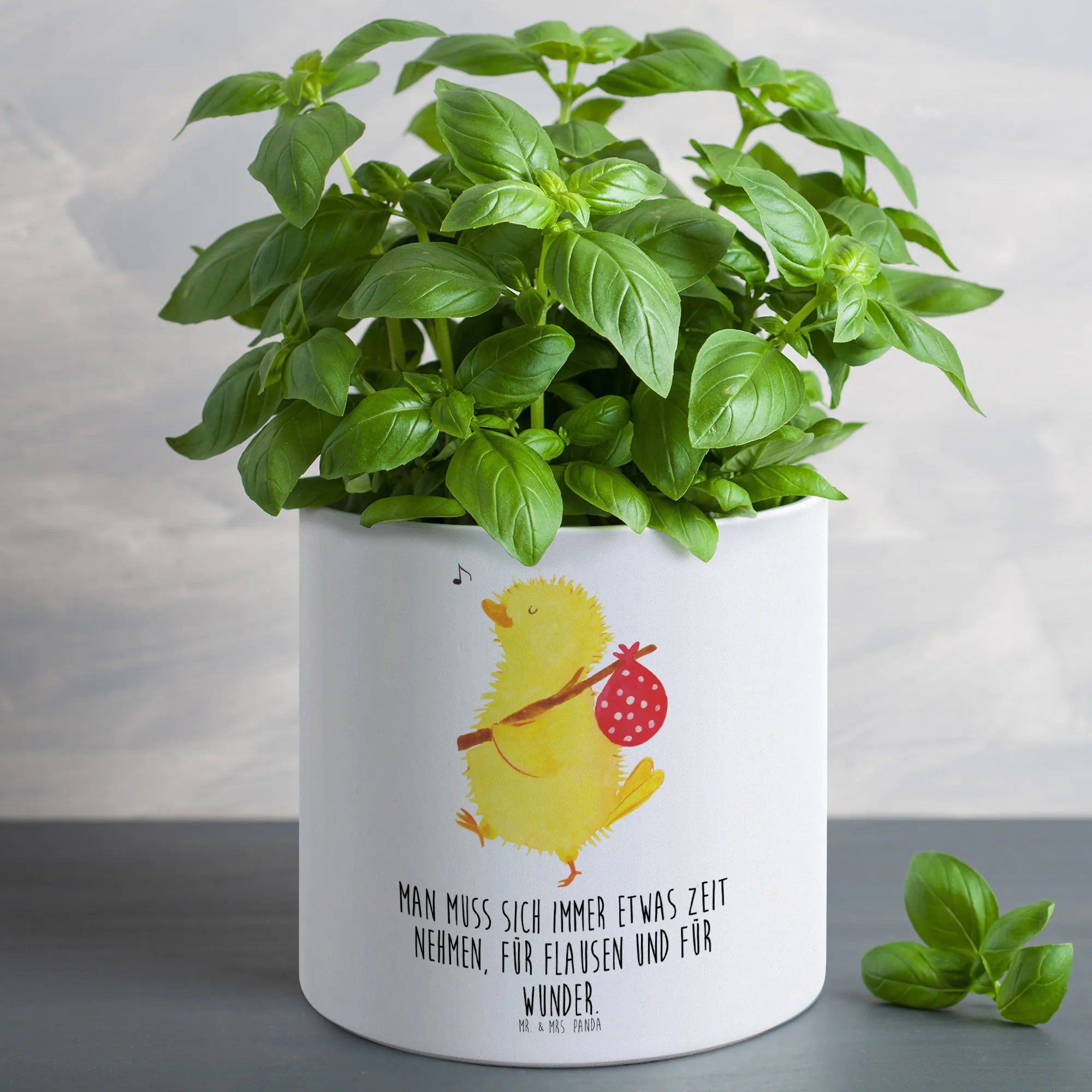 Das besondere Design zeigt ein süßes Küken, das mit einem kleinen Beutel stolz unterwegs ist, begleitet von dem liebevollen Spruch: „Man muss sich immer etwas Zeit Nehmen, für Flausen und für Wunder.“ Dieses kreative Motiv und der liebevolle Slogan machen den Blumentopf zu einem perfekten Geschenk für Ostern oder als eine besondere Überraschung für Deine Freunde und Familie.