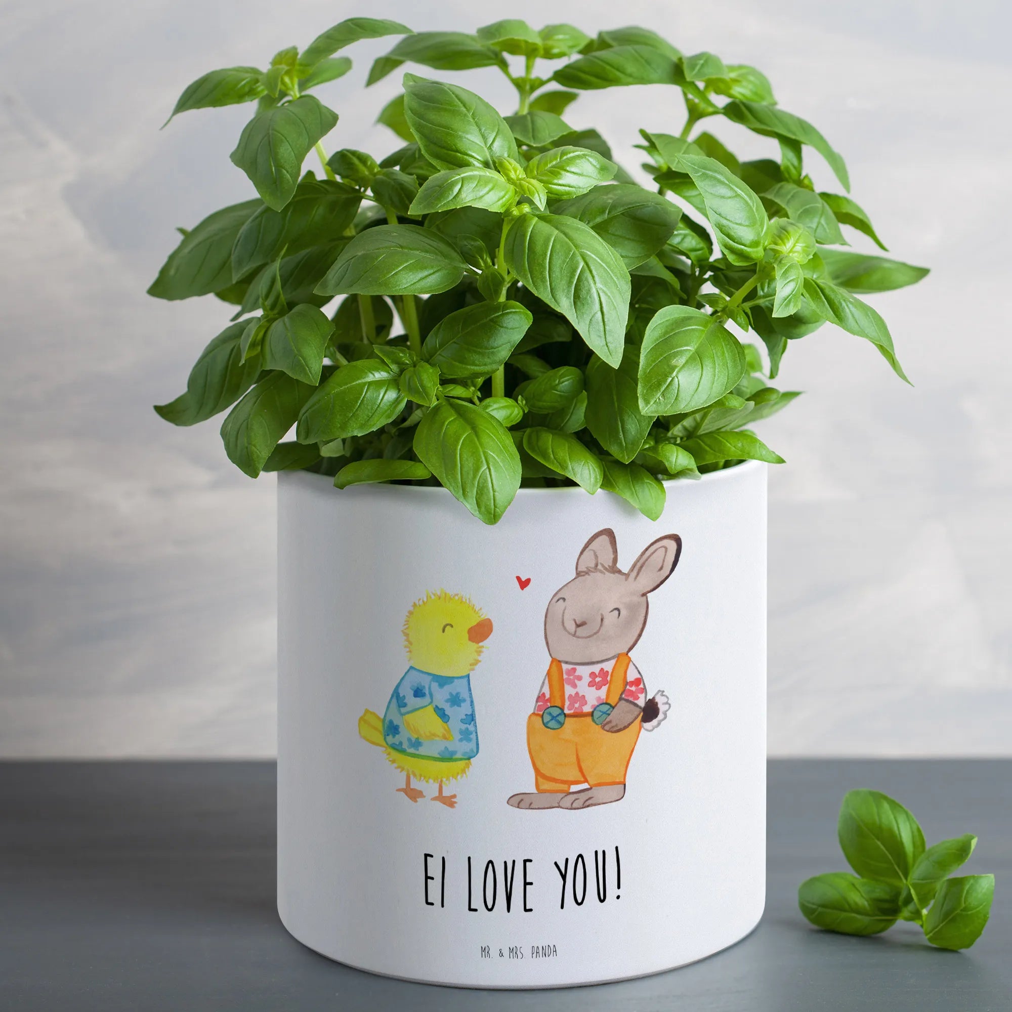 Das Design ist nicht nur hübsch, sondern auch praktisch: Der Pflanztopf hat ein Entwässerungsloch, sodass du dir keine Sorgen um Staunässe machen musst. Ideal für den Innen- und Außeneinsatz, passt dieser Blumentopf perfekt zu deiner Osterdeko oder als Geschenk zu Ostern für Familie und Freunde. Du kannst ihn mit frischen Kräutern oder bunten Blumen füllen und damit Freude an die Menschen verschenken, die dir am Herzen liegen. Der Spruch "Ei love you!" bringt einen liebevollen Touch hinzu, der perfekt zu den Gefühlen passt, die man an Ostern teilt.
