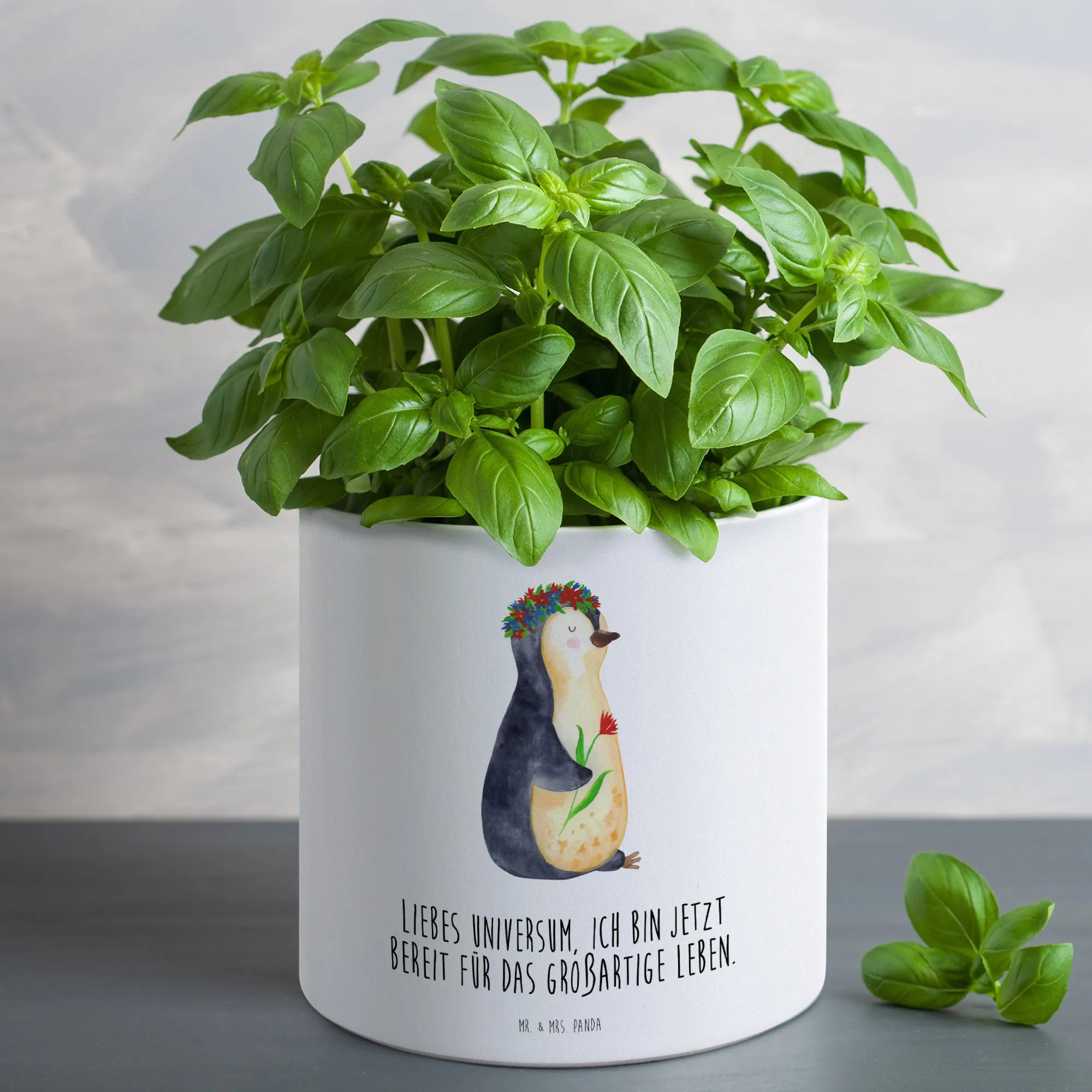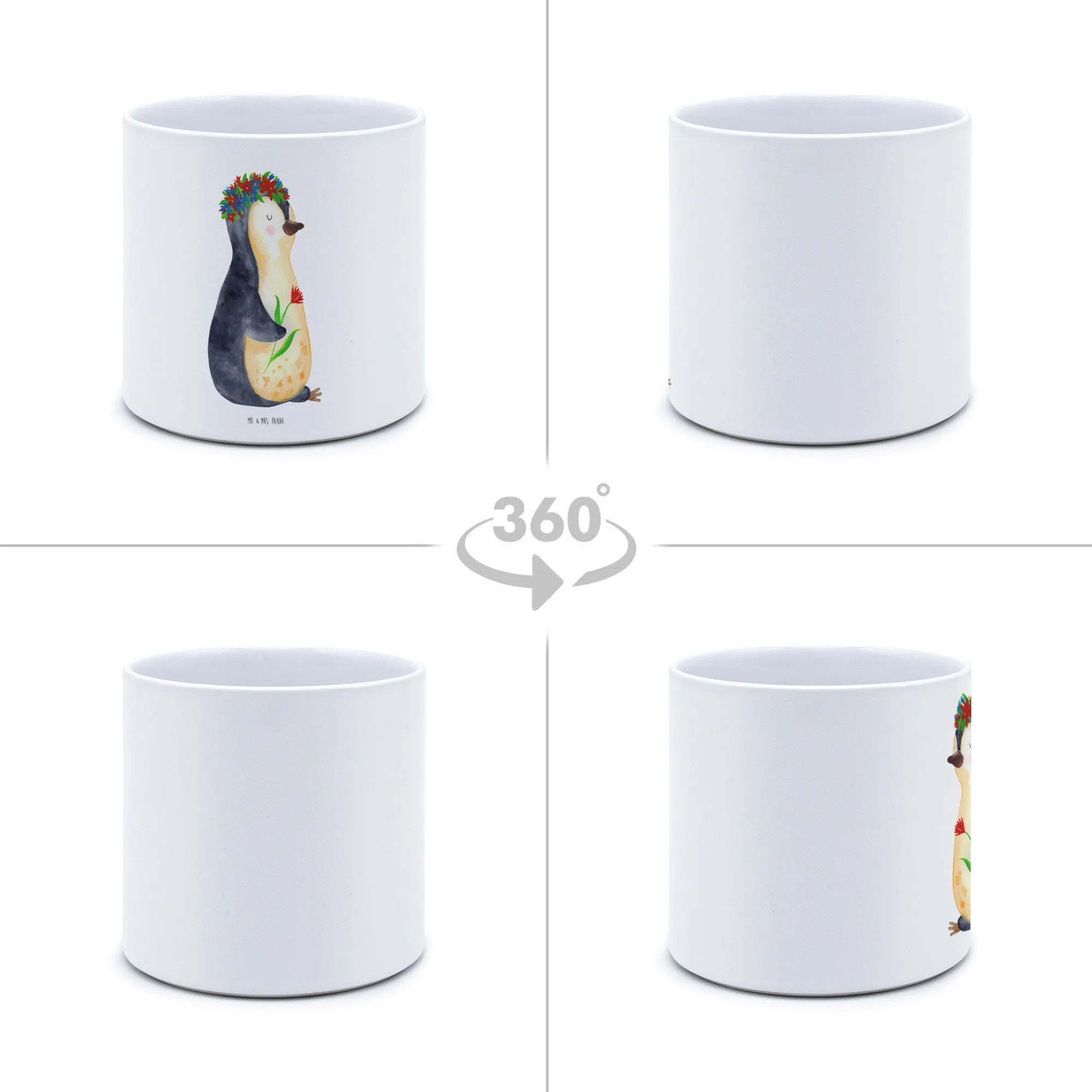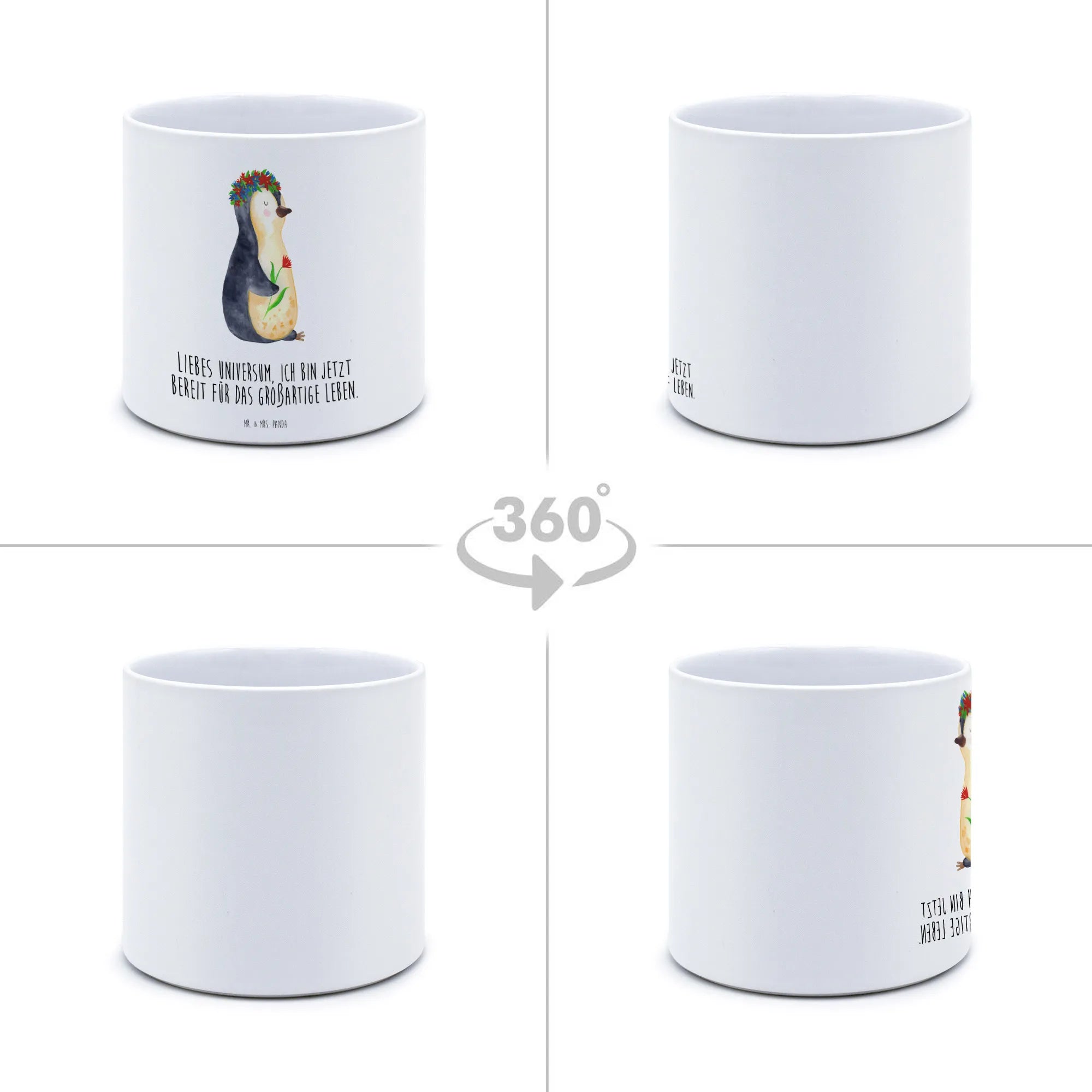 Der XL Blumentopf mit dem süßen Pinguin Blumenkranz aus der Mr. & Mrs. Panda Kollektion ist das ideale Geschenk für Pflanzenliebhaber und jeden, der das Leben liebt. Mit seinem charmanten Motiv bringt dieser Keramiktopf nicht nur Farbe in dein Zuhause, sondern auch Freude. Der niedliche Pinguin mit einem Blumenkranz auf dem Kopf und einer Blume in der Hand verkörpert Lebenslust und Motivation.