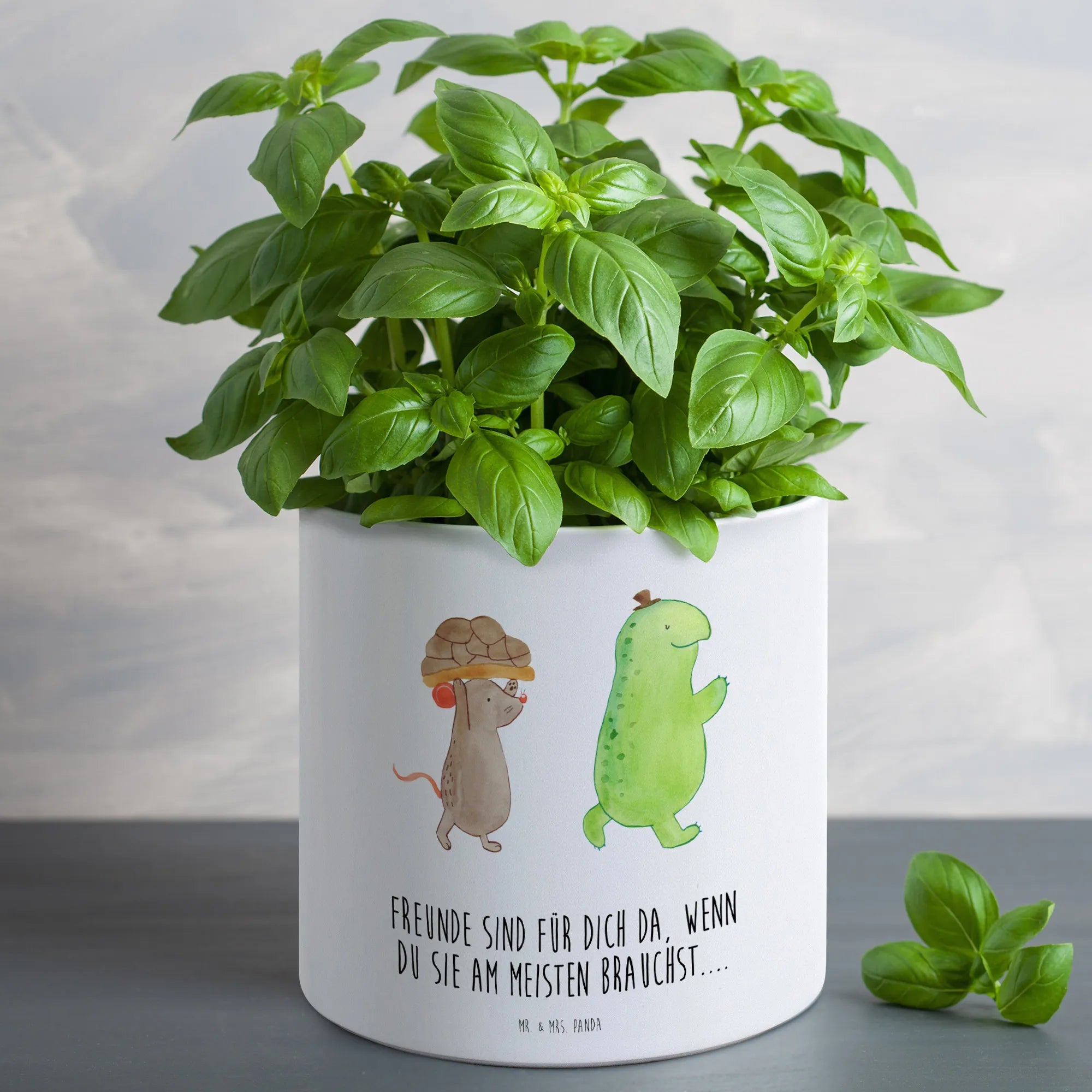 Das Design zeigt die Schildkröte, die ihrem kleinen Freund, der Maus, hilft, ihren Panzer zu tragen. Eine wunderbare Erinnerung daran, dass wahre Freunde immer füreinander da sind. Mit dem Spruch 'Freunde sind für dich da, wenn du sie am meisten brauchst...' wird jeder Blick auf diesen Topf zu einer kleinen Aufforderung an die Freundschaft in unserem Leben.