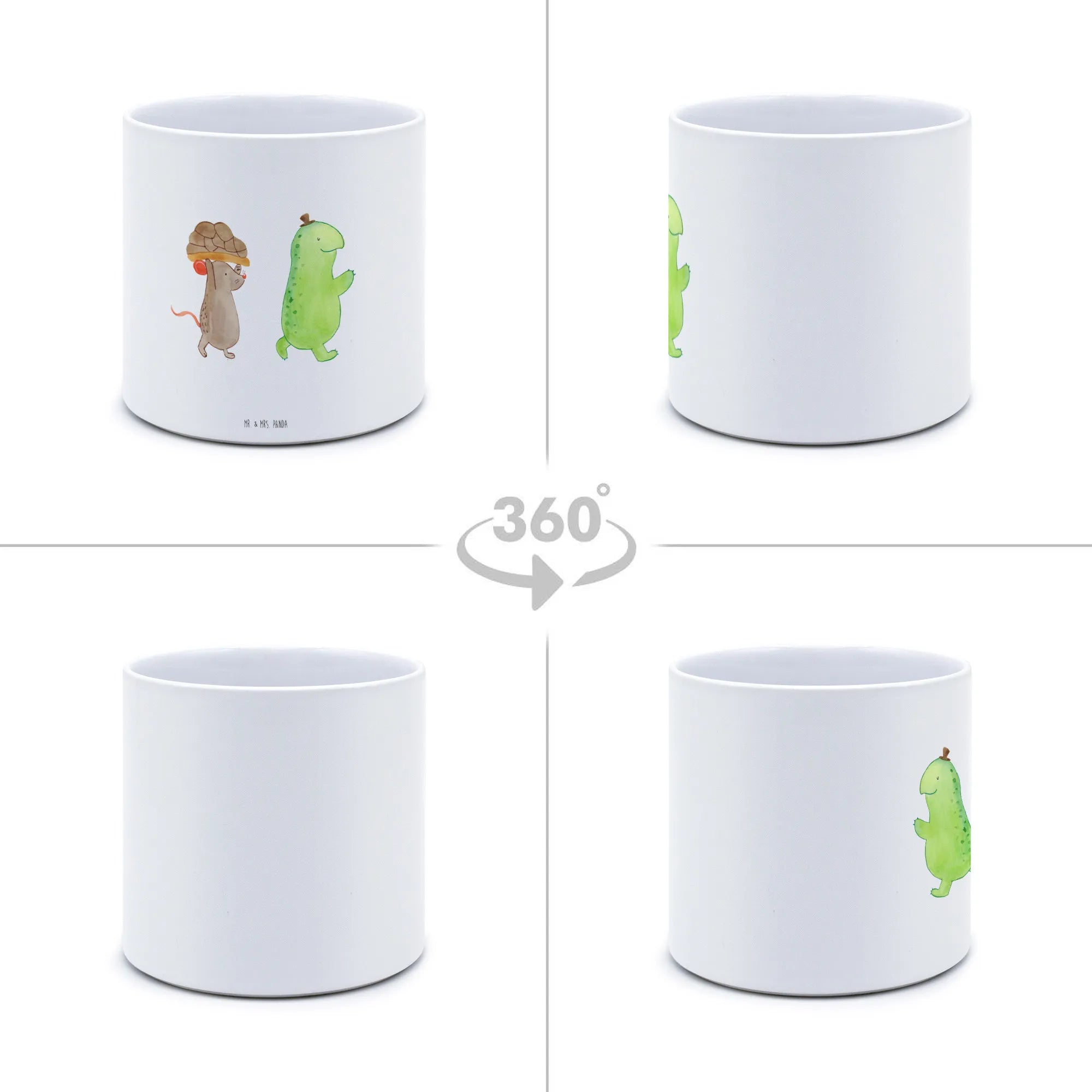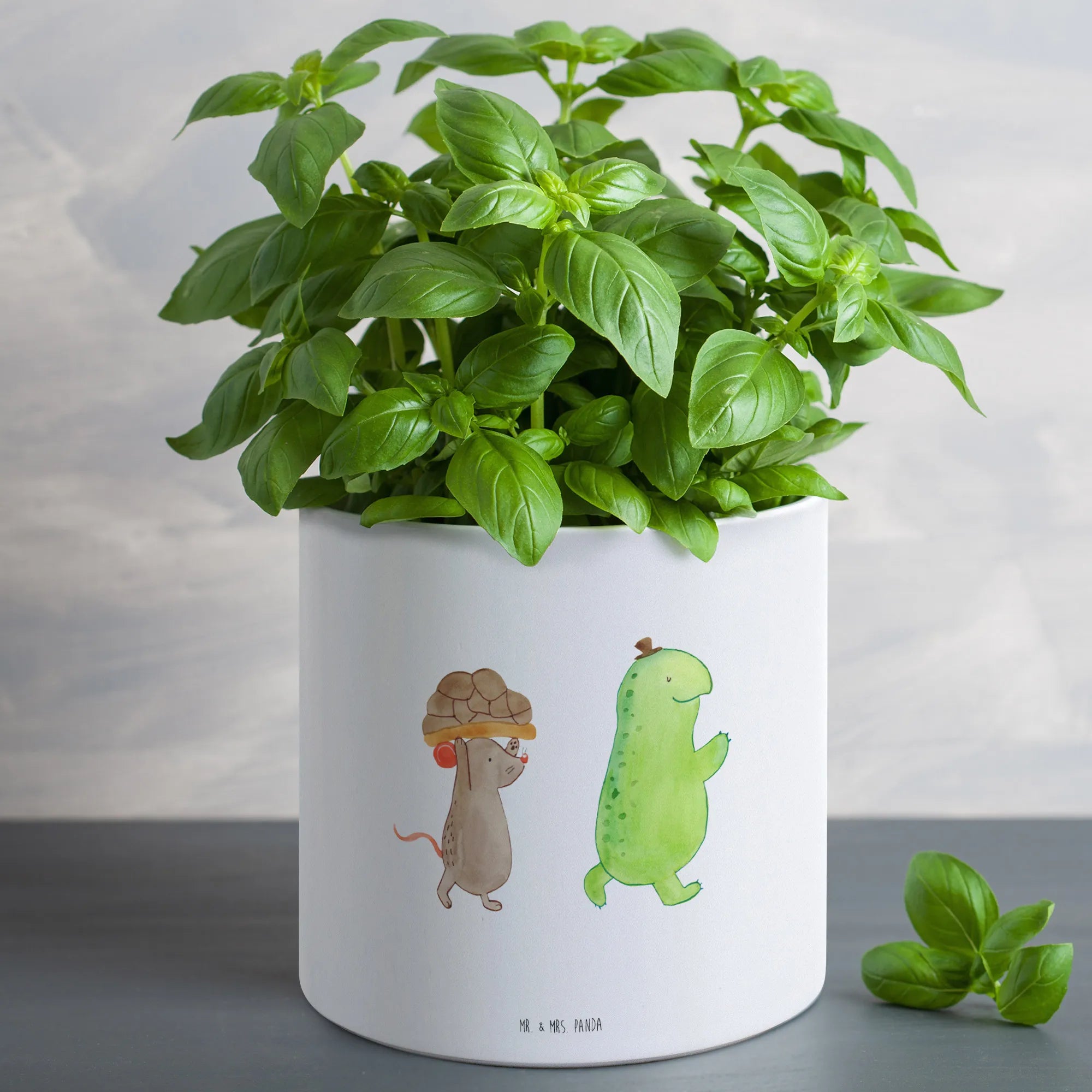 Aus hochwertiger, glänzender Keramik gefertigt, bringt dieser Blumentopf nicht nur Farbe in dein Zuhause, sondern bietet auch die perfekte Umgebung für deine Lieblingspflanzen. Der Blumentopf hat ein besonderes Design, das von Mr. & Mrs. Panda liebevoll handgezeichnet wurde. Die fröhliche Schildkröte, die mutig voranschreitet, und die kleine Maus, die ihren Panzer trägt, zaubern dir mit Sicherheit ein Lächeln ins Gesicht.
