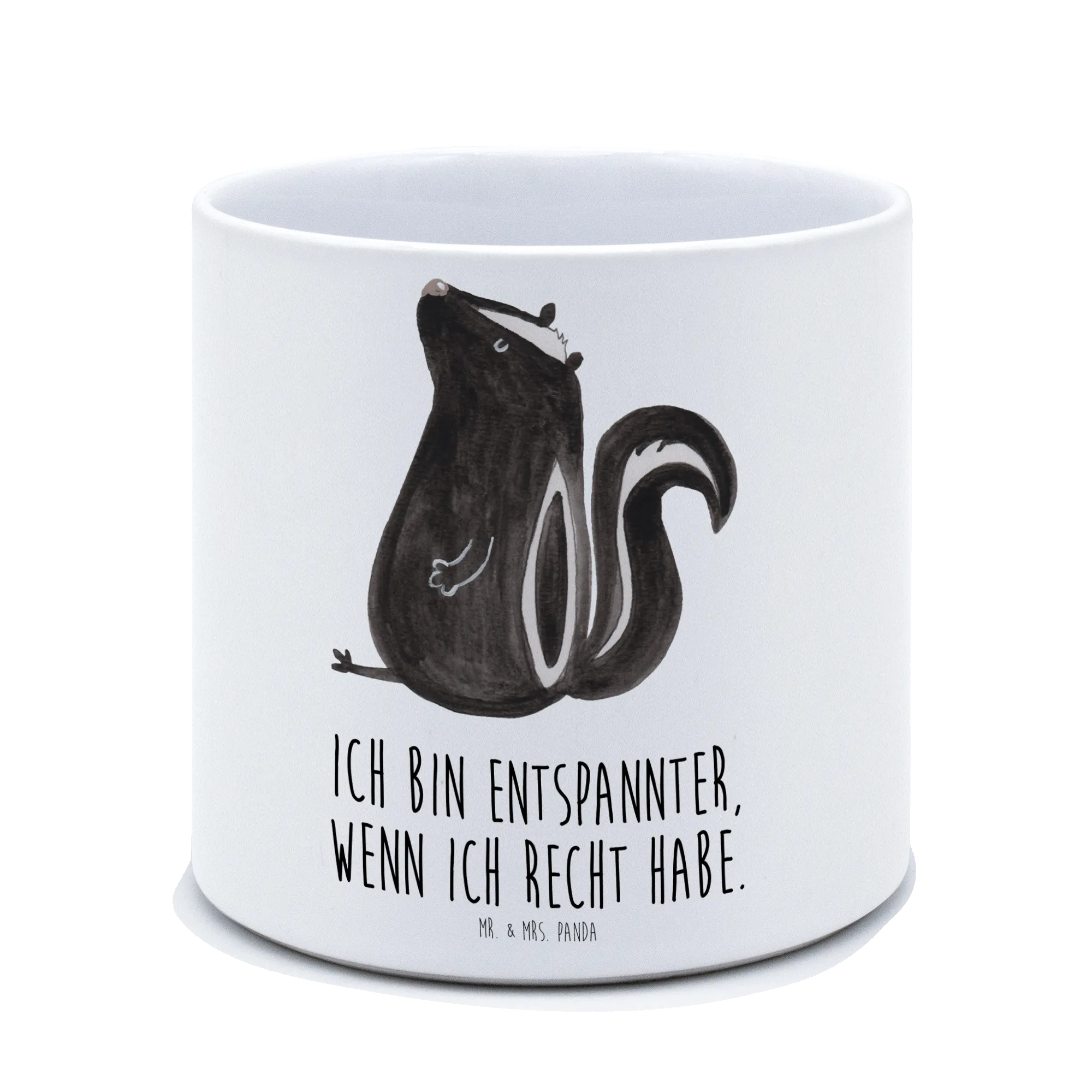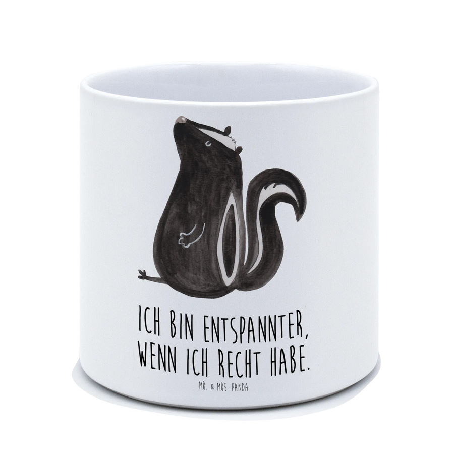 Die liebevoll handgezeichnete Aquarellgrafik eines entspannten Stinktiers mit dem Spruch "Ich bin entspannter, wenn ich Recht habe" ist nicht nur ein echter Hingucker, sondern bereitet auch beim Gießen der Pflanzen ein Lächeln. Zudem haben wir bei der Gestaltung an alles gedacht: ein Entwässerungsloch sorgt dafür, dass keine Staunässe entsteht. Pflegeleicht ist der Blumentopf außerdem spülmaschinenfest! 🧼
