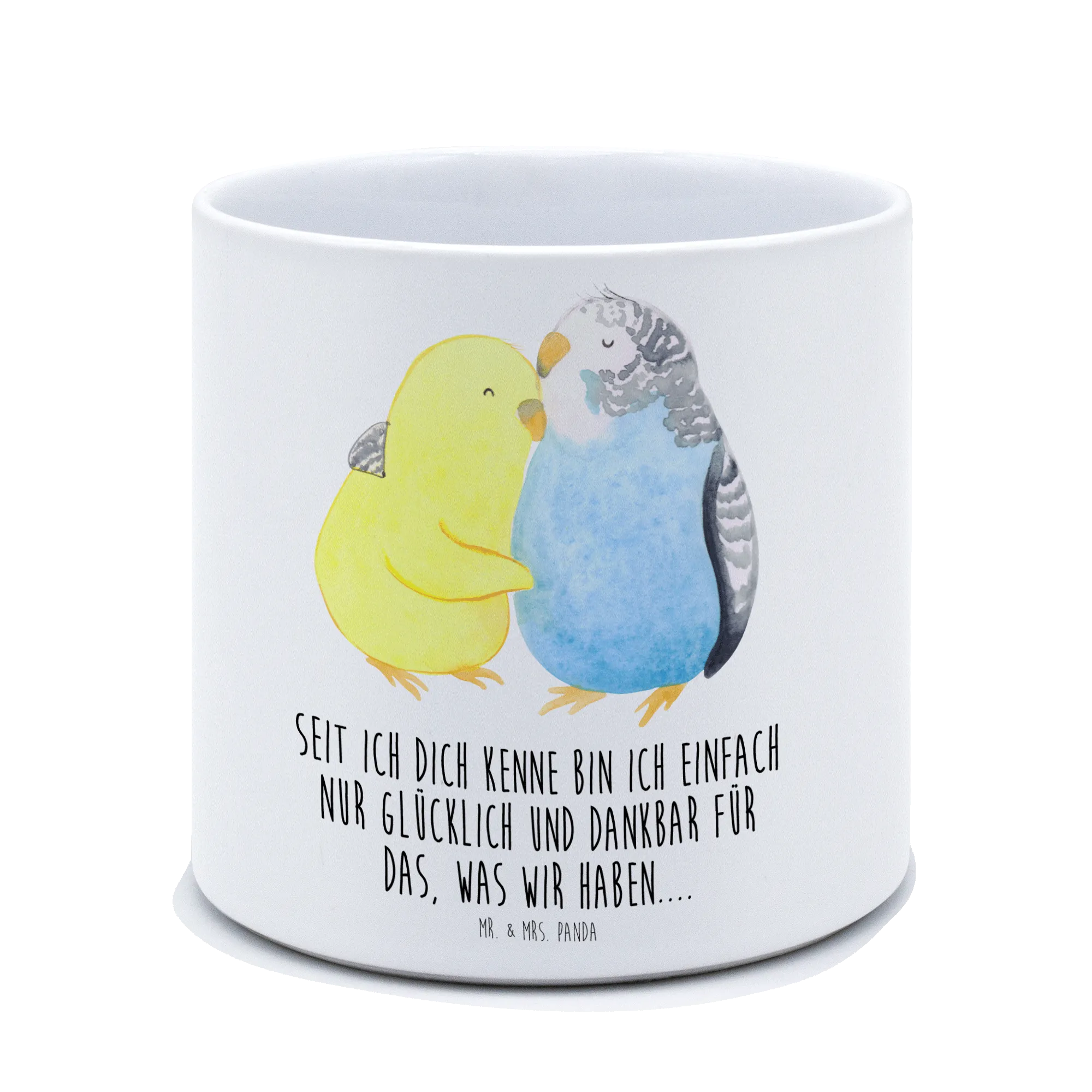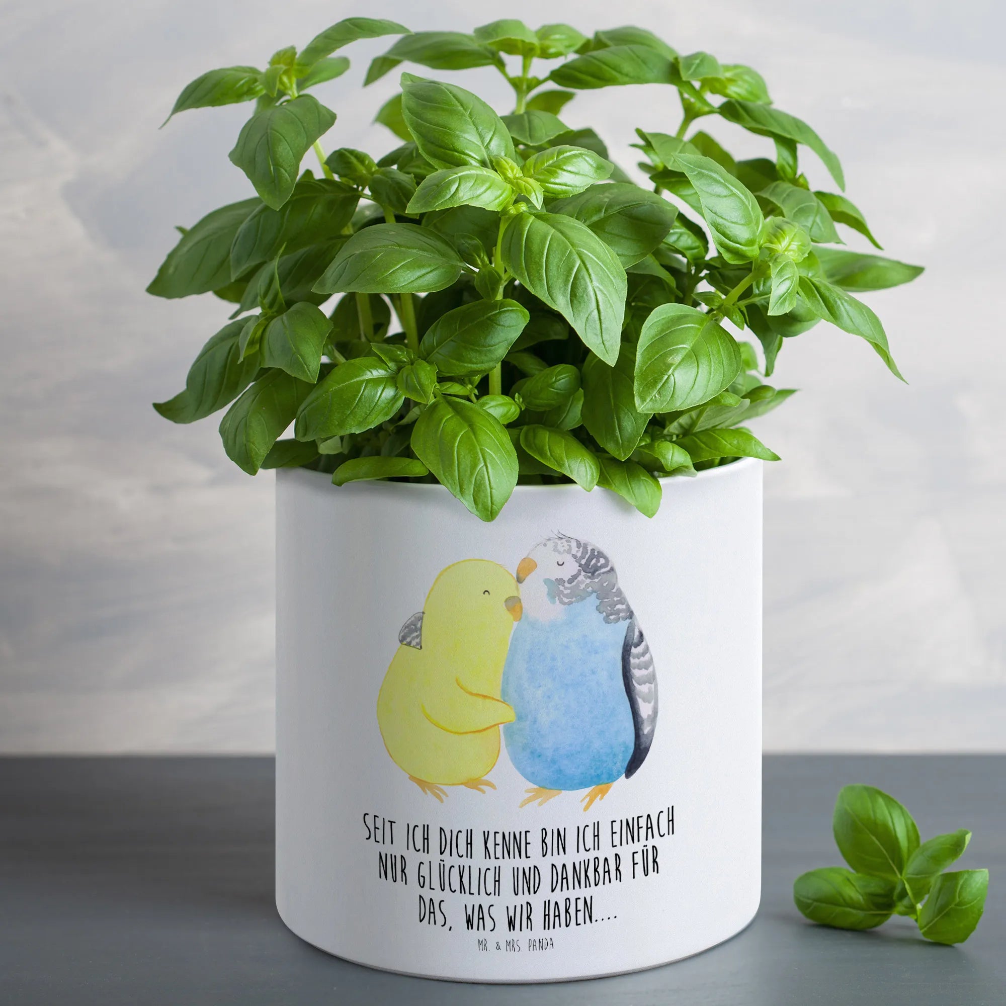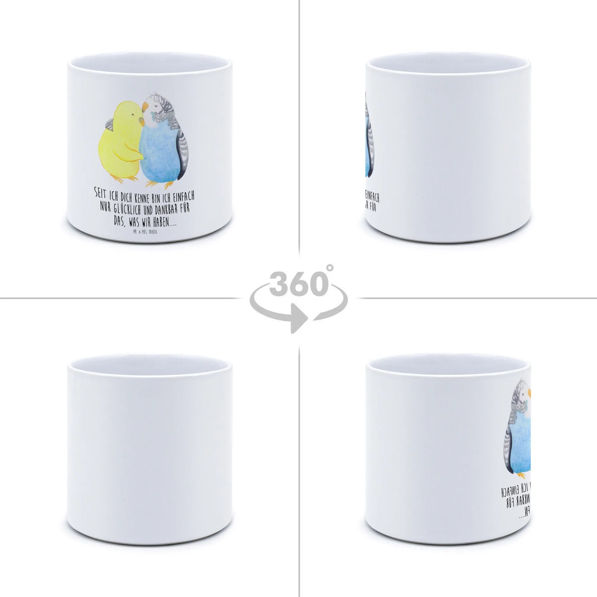 Der XL Blumentopf mit dem bezaubernden Motiv 'Wellensittich Liebe' von Mr. & Mrs. Panda ist nicht nur ein fantastisches Wohnaccessoire, sondern auch ein Ausdruck Deiner tiefen Zuneigung. Wenn Du auf der Suche nach einem liebevollen Geschenk für Deinen Partner, Deine Partnerin oder einen guten Freund bist, dann ist dieser farbenfrohe und eindrucksvolle Blumentopf genau das Richtige!
