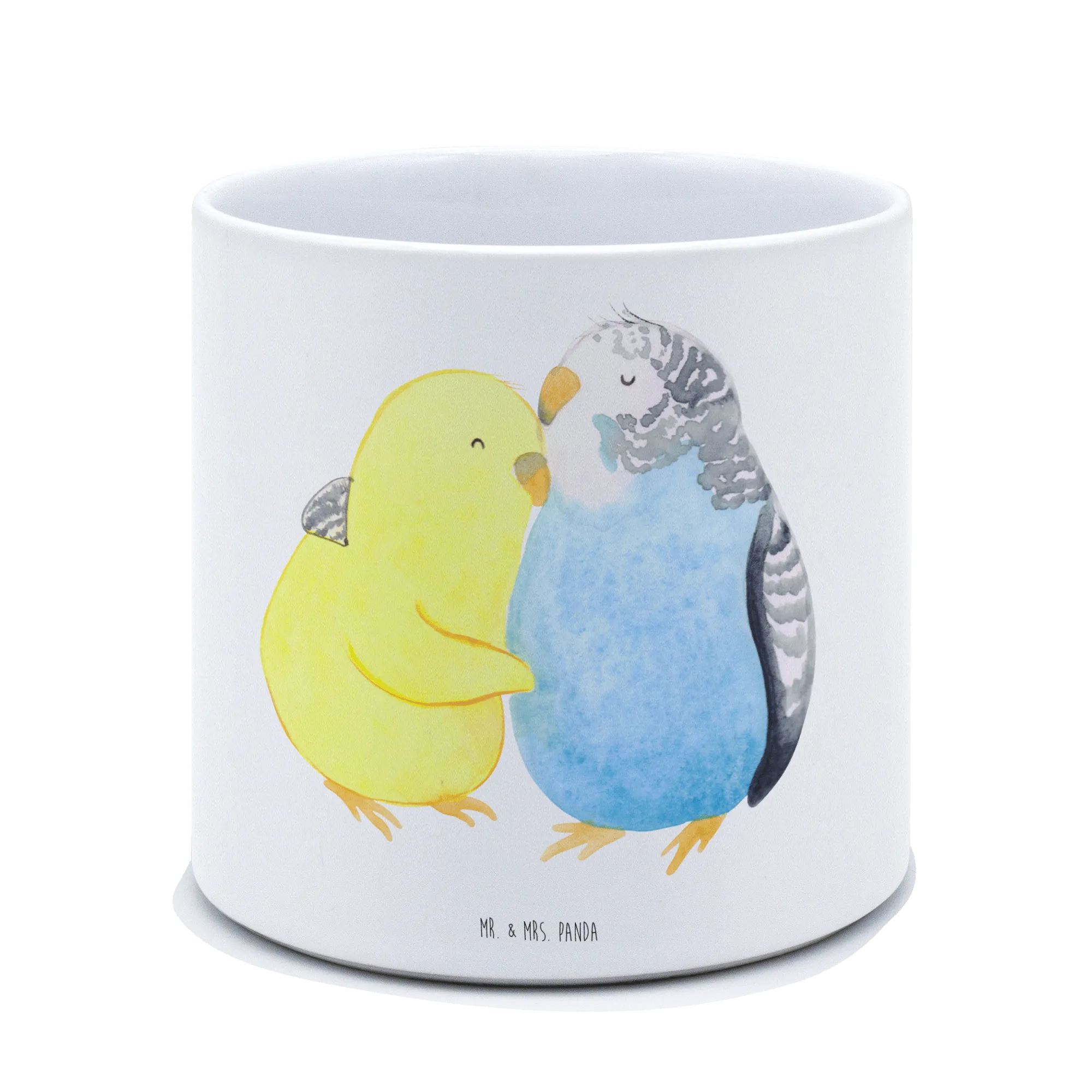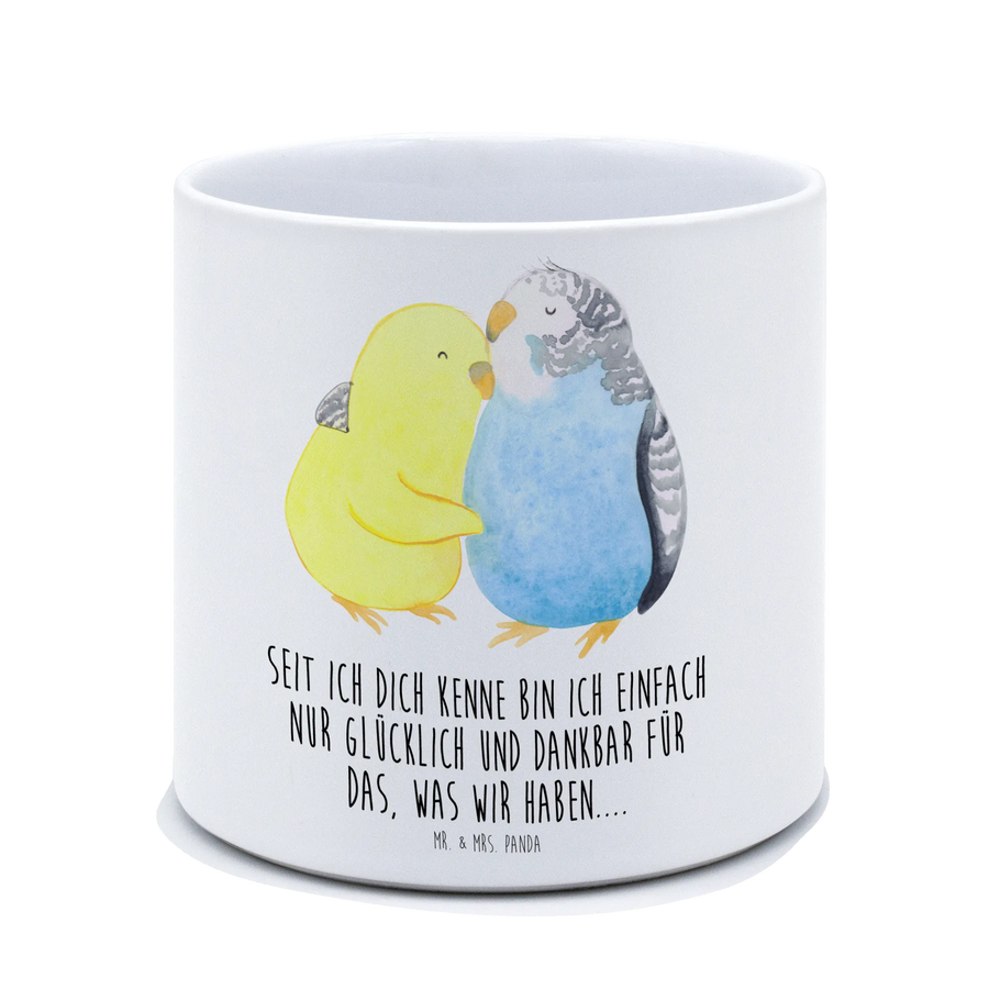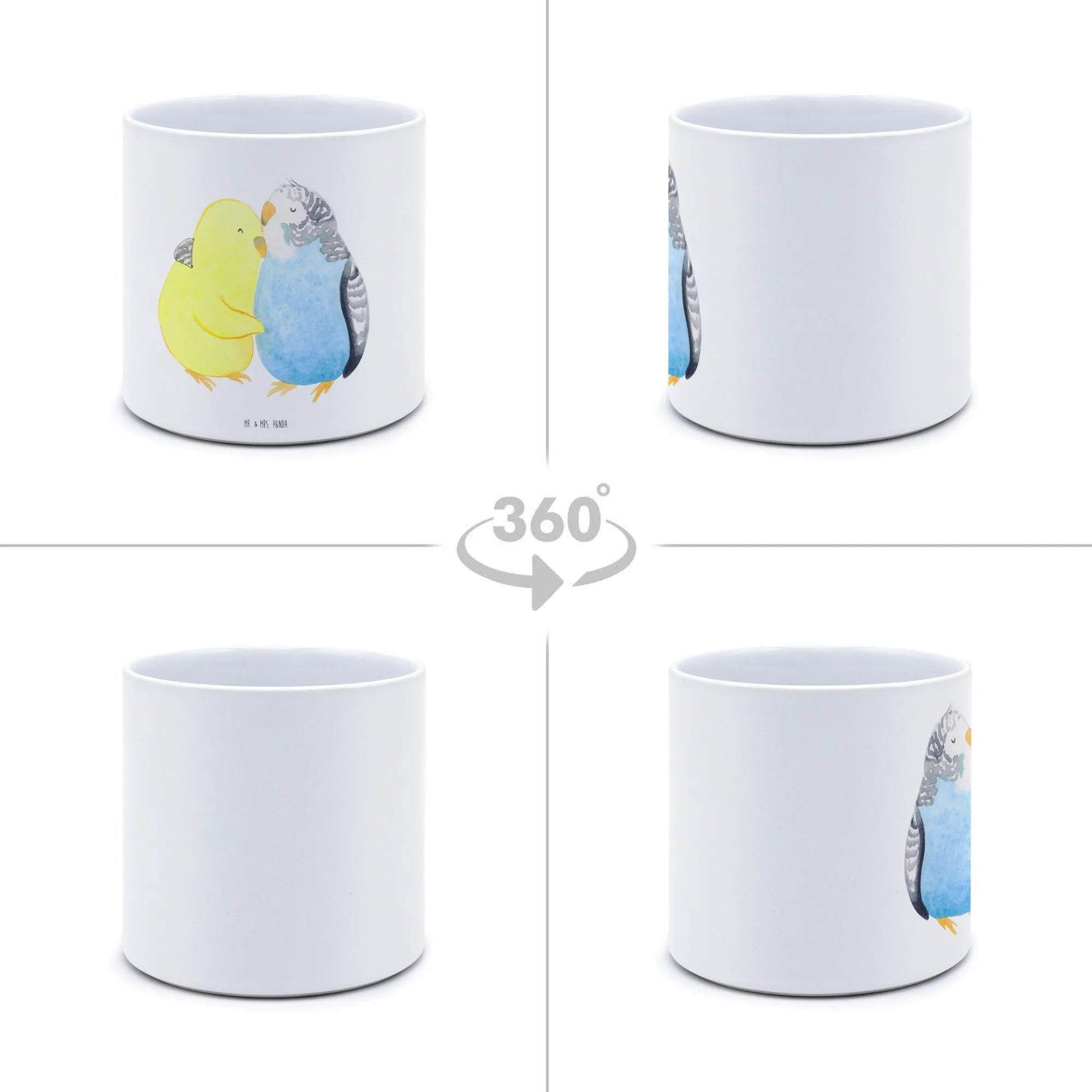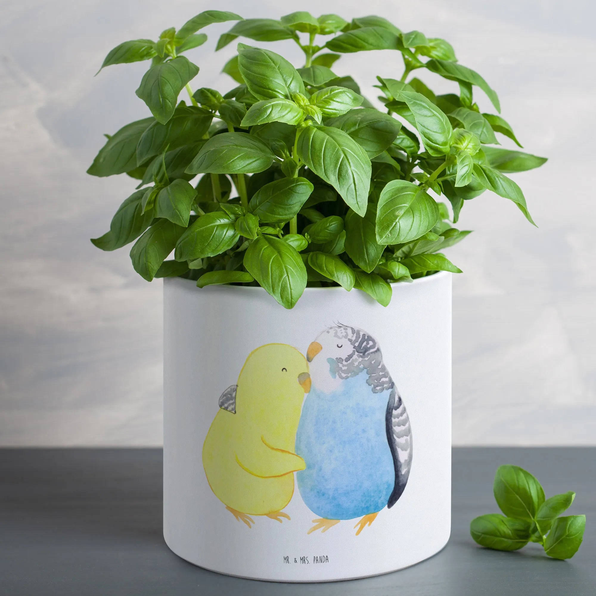 Der XL Blumentopf mit dem bezaubernden Motiv 'Wellensittich Liebe' von Mr. & Mrs. Panda ist nicht nur ein fantastisches Wohnaccessoire, sondern auch ein Ausdruck Deiner tiefen Zuneigung. Wenn Du auf der Suche nach einem liebevollen Geschenk für Deinen Partner, Deine Partnerin oder einen guten Freund bist, dann ist dieser farbenfrohe und eindrucksvolle Blumentopf genau das Richtige!