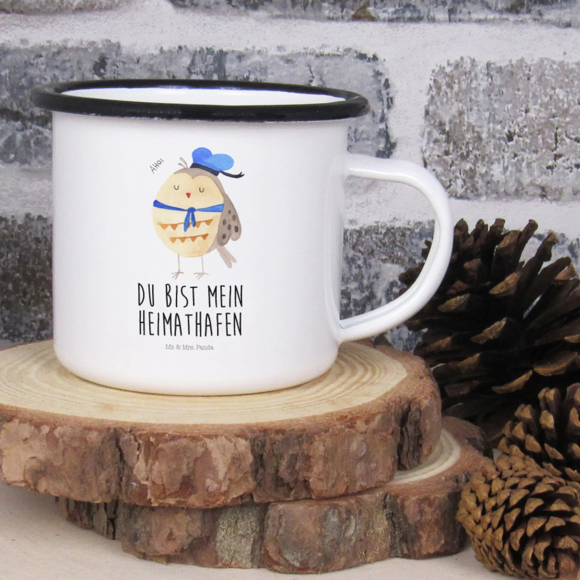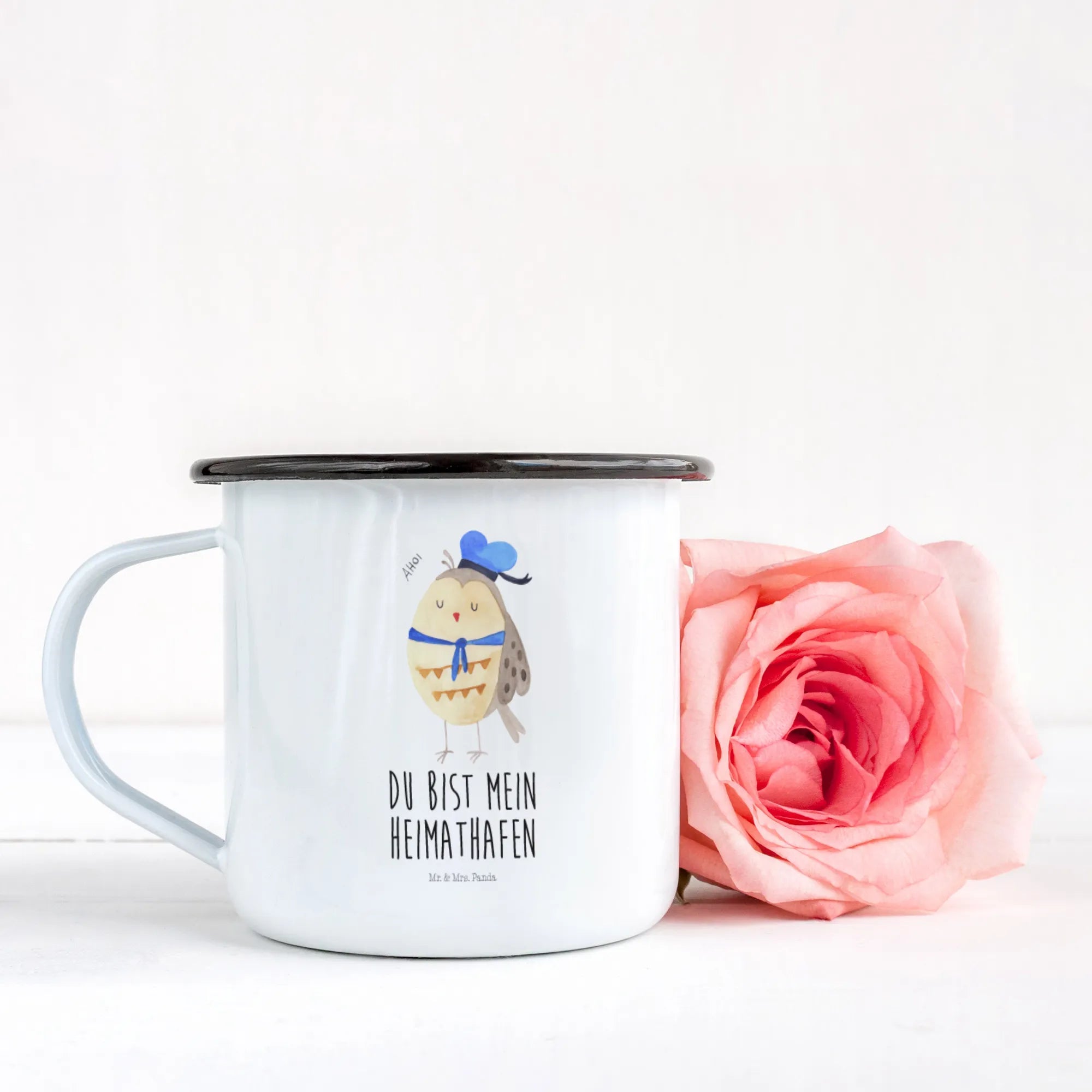 Die XL Emaille Tasse Eule Matrosen von Mr. & Mrs. Panda ist das perfekte Geschenk für alle, die die Freiheit und die Schönheit der Natur lieben. Mit ihrem charmanten Design und dem witzigen Spruch "Du bist mein Heimathafen" gibt sie dir ein warmes Gefühl von Geborgenheit, egal ob du am Lagerfeuer sitzt, auf einem Campingausflug bist oder einfach nur deinen Morgenkaffee genießt.