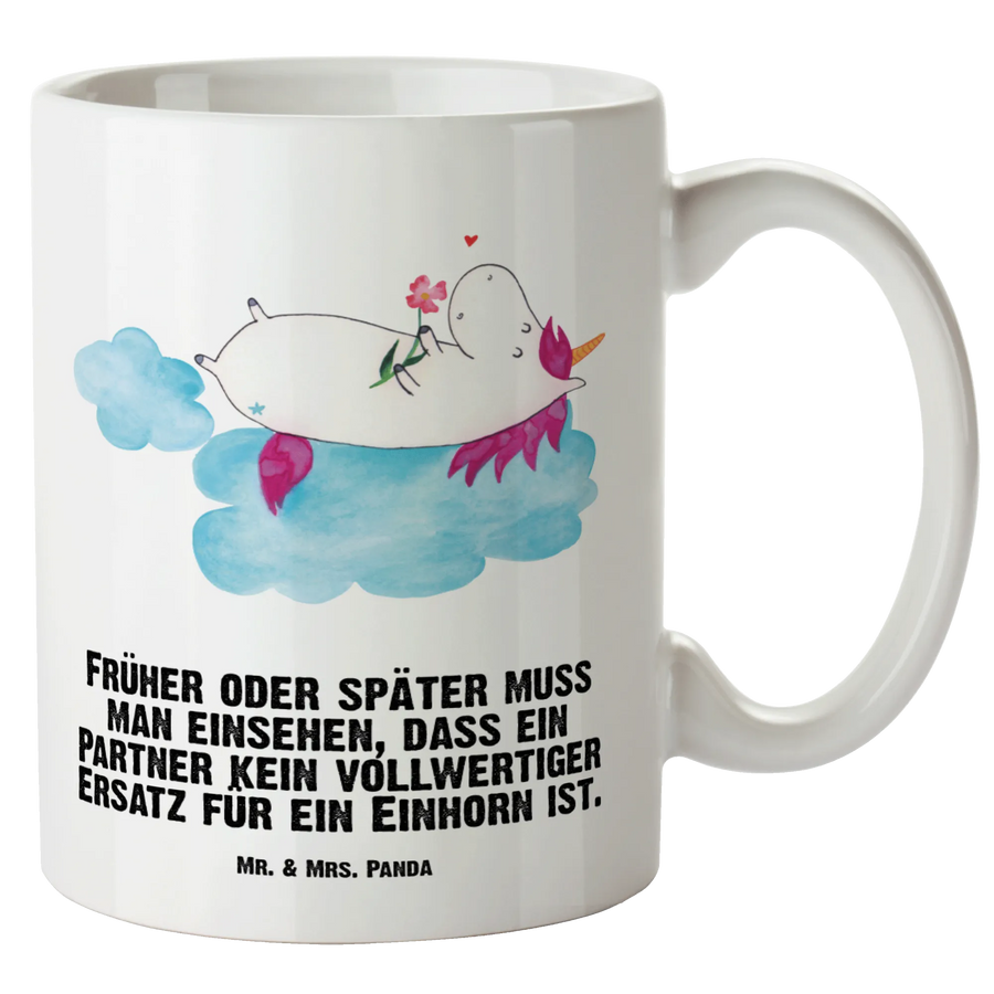 Herzlich willkommen in der magischen Welt von Mr. & Mrs. Panda mit unserer bezaubernden XL Tasse "Einhorn verliebt auf Wolke"! Diese besondere Kaffeetasse ist nicht nur ein wunderschönes Accessoire für Deine morgendliche Routine, sondern auch das perfekte Geschenk für all diejenigen, die Einhörner und kleine Liebesbeweise schätzen.