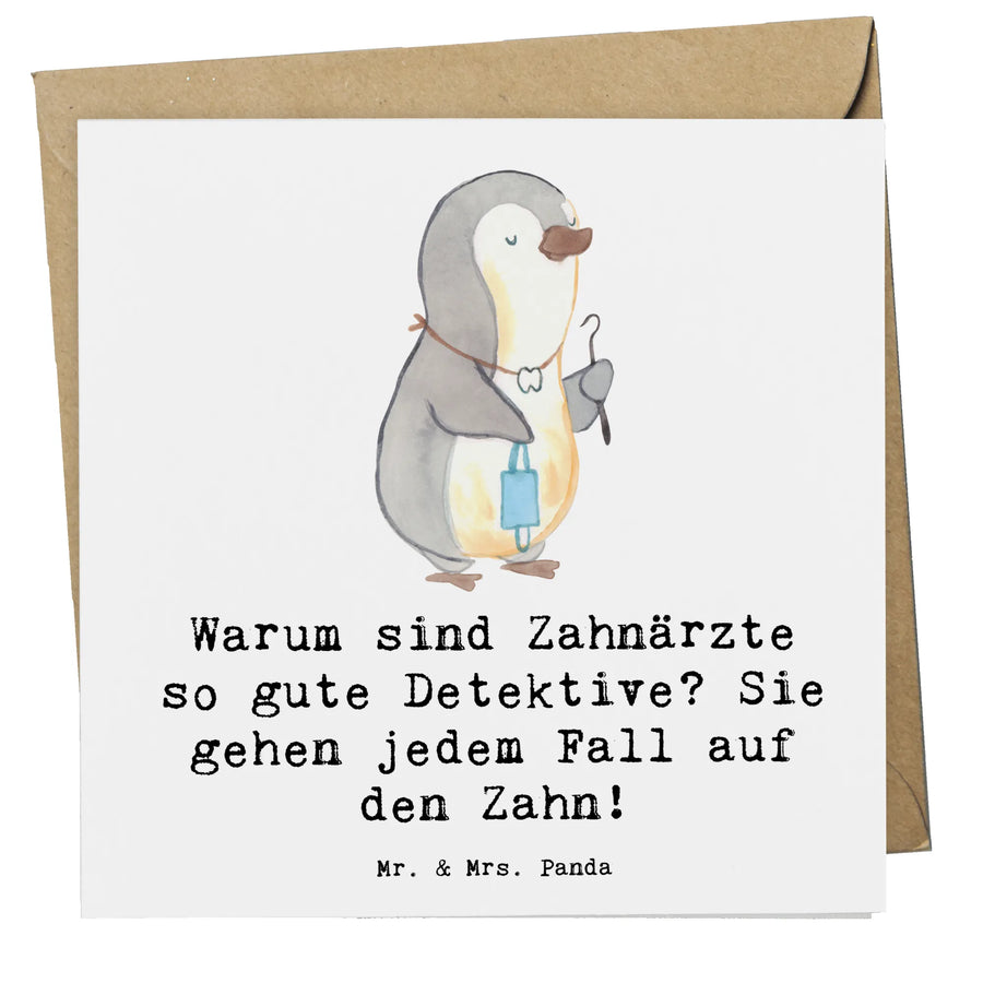Verschenke ein herzhaftes Lächeln mit der Deluxe Karte „Zahnarzt“ aus der Berufe-Kollektion von Mr. & Mrs. Panda. Auf der Vorderseite steht der freche Spruch: „Warum sind Zahnärzte so gute Detektive? Sie gehen jedem Fall auf den Zahn!“ – ein liebevoller, humorvoller Gruß für alle, die im zahnärztlichen Beruf arbeiten.