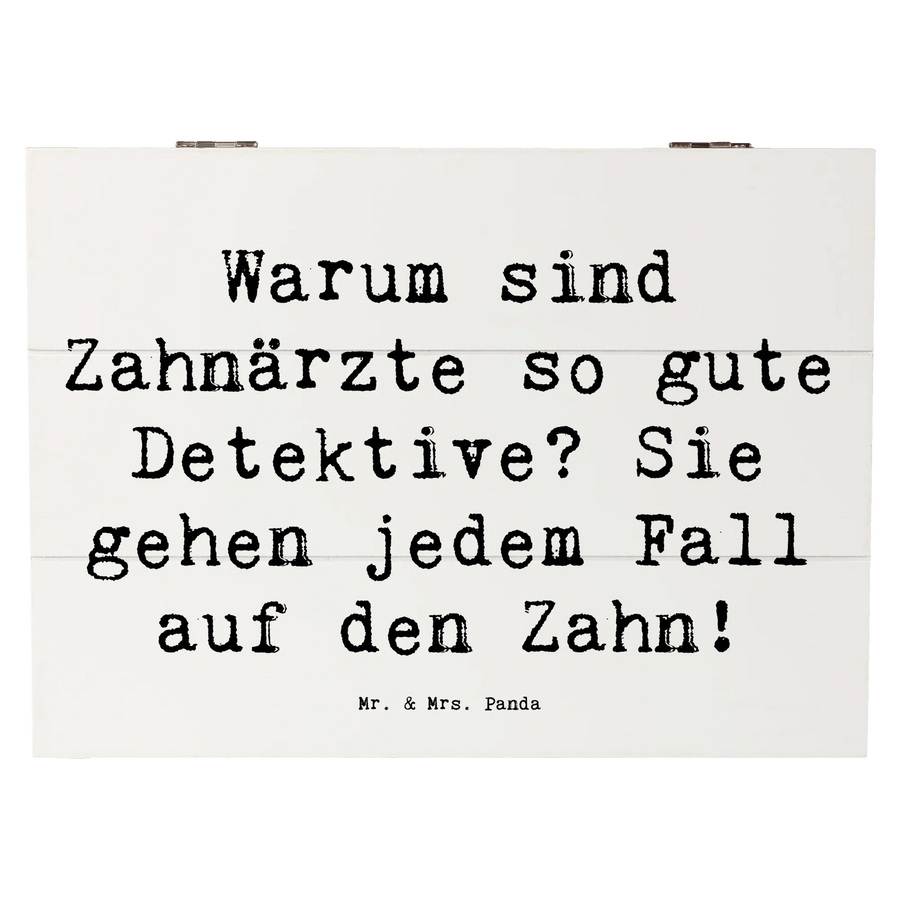 Entdecke die zauberhafte Holzkiste von Mr. & Mrs. Panda – die perfekte Geschenkidee für Zahnärzte und Zahnärztinnen! Mit dem niedlichen Spruch "Warum sind Zahnärzte so gute Detektive? Sie gehen jedem Fall auf den Zahn!" ist diese Kiste nicht nur eine wunderschöne Aufbewahrung, sondern auch ein originelles Geschenk, das Freude bringt.
