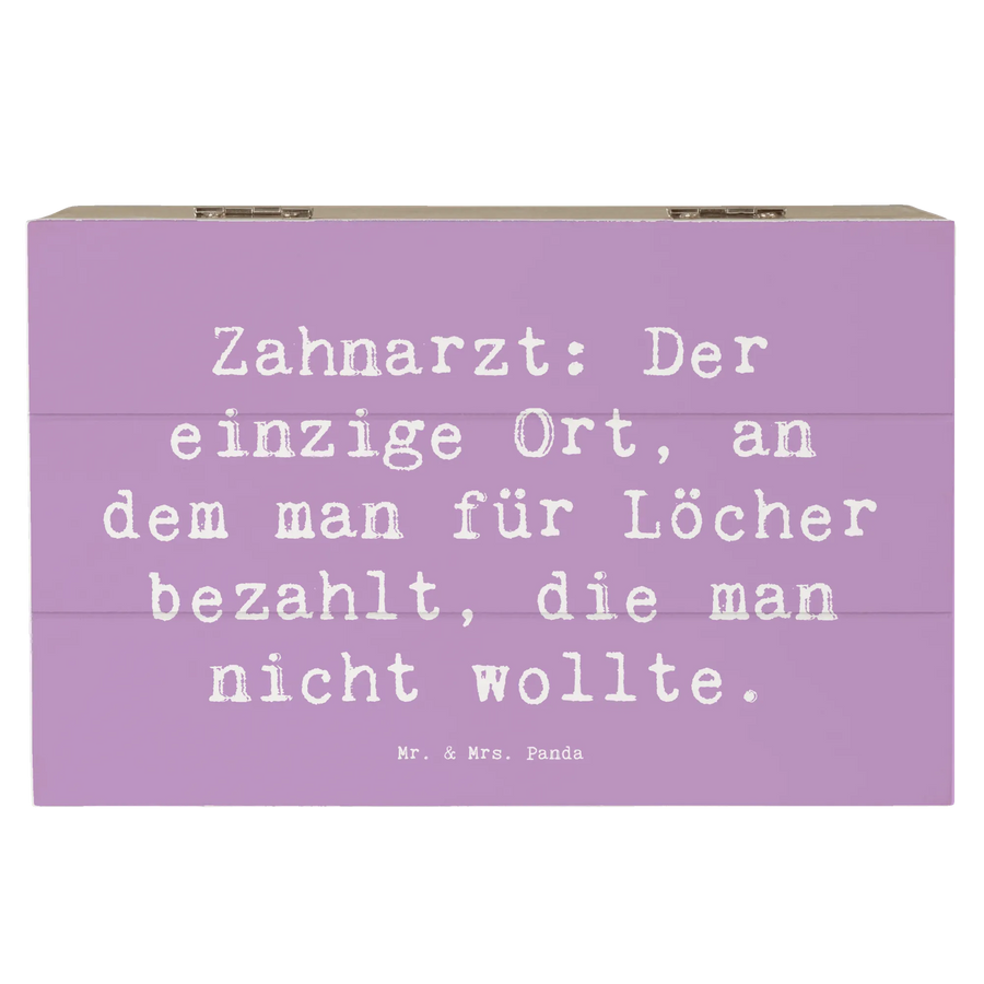 Entdecke die wunderschöne Holzkiste von Mr. & Mrs. Panda mit dem fröhlichen Motiv "Zahnarzt: Der einzige Ort, an dem man für Löcher bezahlt, die man nicht wollte." Diese bezaubernde Kiste ist nicht nur ein praktischer Aufbewahrungsort für all Deine Schätze, sondern auch ein einzigartiges Geschenk für den Zahnarzt in Deinem Leben oder für die Fans des Berufs!