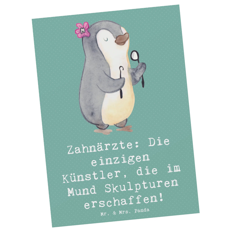 Entdecke die besondere Postkarte aus der bezaubernden Kollektion Berufe von Mr. & Mrs. Panda! Diese einzigartige Postkarte mit dem witzigen Motiv "Zahnärzte: Die einzigen Künstler, die im Mund Skulpturen erschaffen!" bringt einen Hauch von Humor in den Alltag jedes Zahnarztes oder zahnmedizinischen Fachangestellten. Ob zum Geburtstag, als Dankeschön für die tolle Arbeit oder einfach nur um ein Lächeln zu verschenken - diese Karte ist das perfekte Geschenk für jeden Anlaß.
