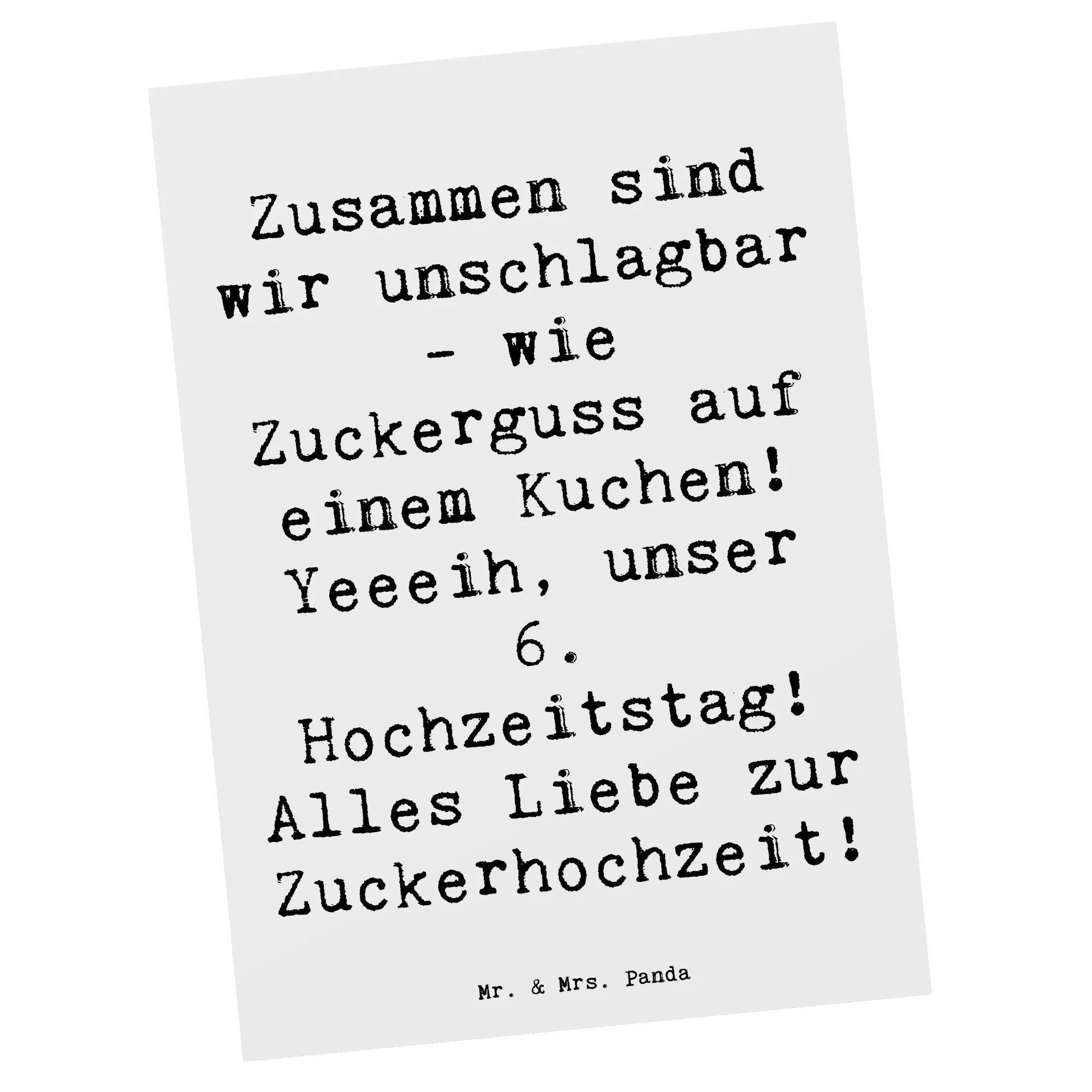 Die einzigartige Postkarte zum 6. Hochzeitstag von Mr. & Mrs. Panda ist das perfekte Geschenk für alle, die ihre Liebe in vollen Zügen feiern möchten. Mit dem niedlichen und liebevollen Motiv der Zuckerhochzeit bringt diese Karte ganz viel Freude und Wärme in die Herzen von frisch verheirateten Paaren und langjährigen Ehepartnern.