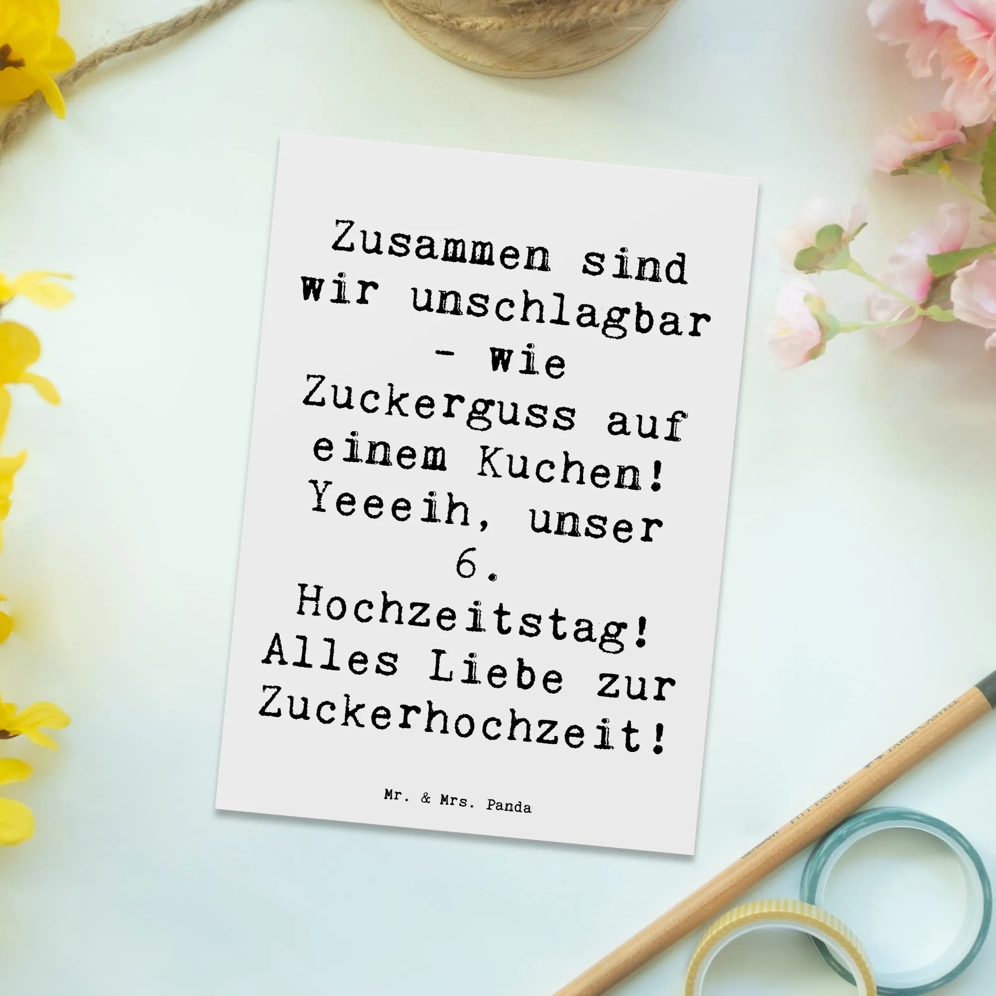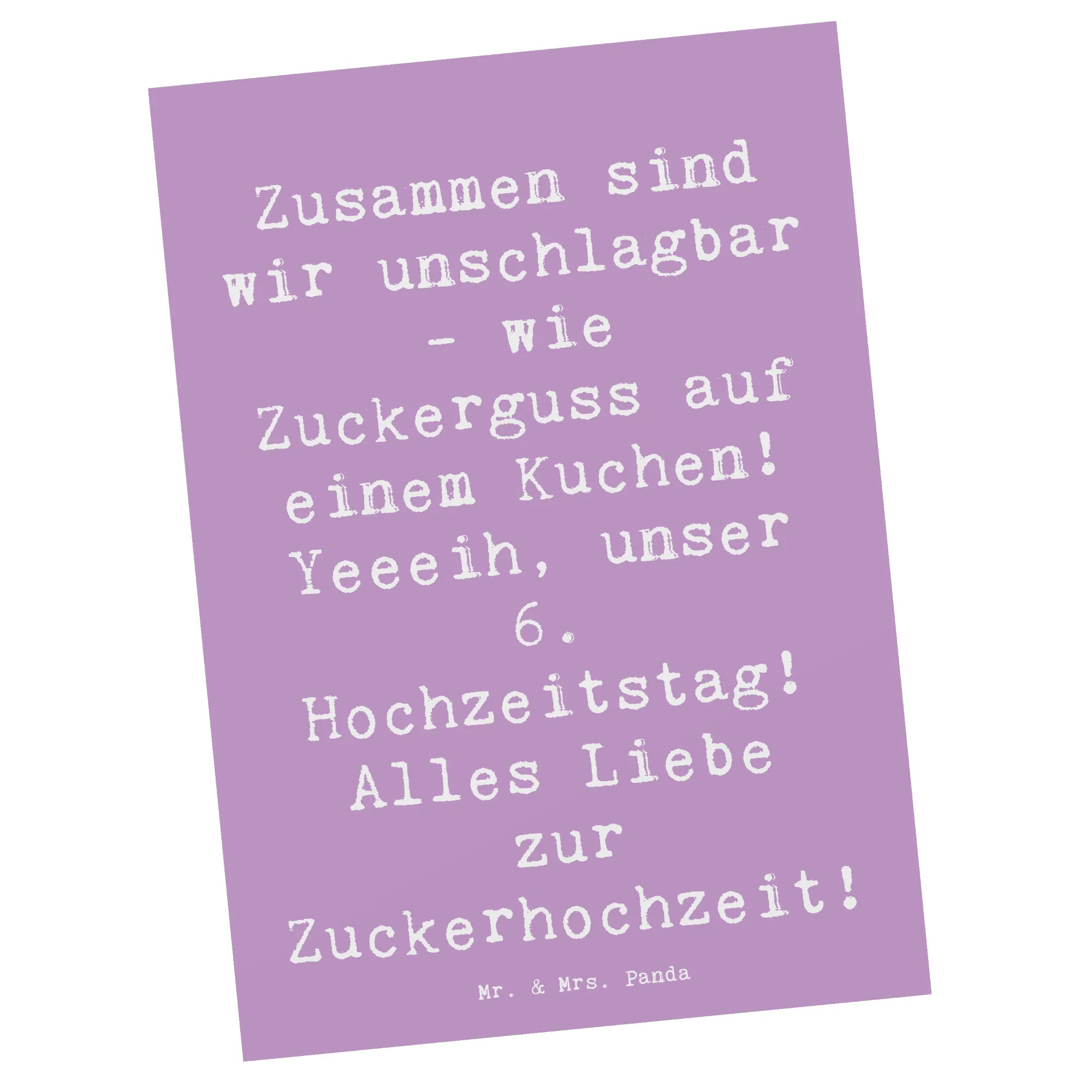 Die Postkarte zum 6. Hochzeitstag von Mr. & Mrs. Panda – einem einzigartigen Geschenk für Paare, die ihre Zuckerhochzeit feiern! Diese süße Karte ist mehr als nur ein simples Stück Papier; sie ist ein Ausdruck der Liebe und Dankbarkeit, den du deinem Partner oder Freunden schenken kannst.