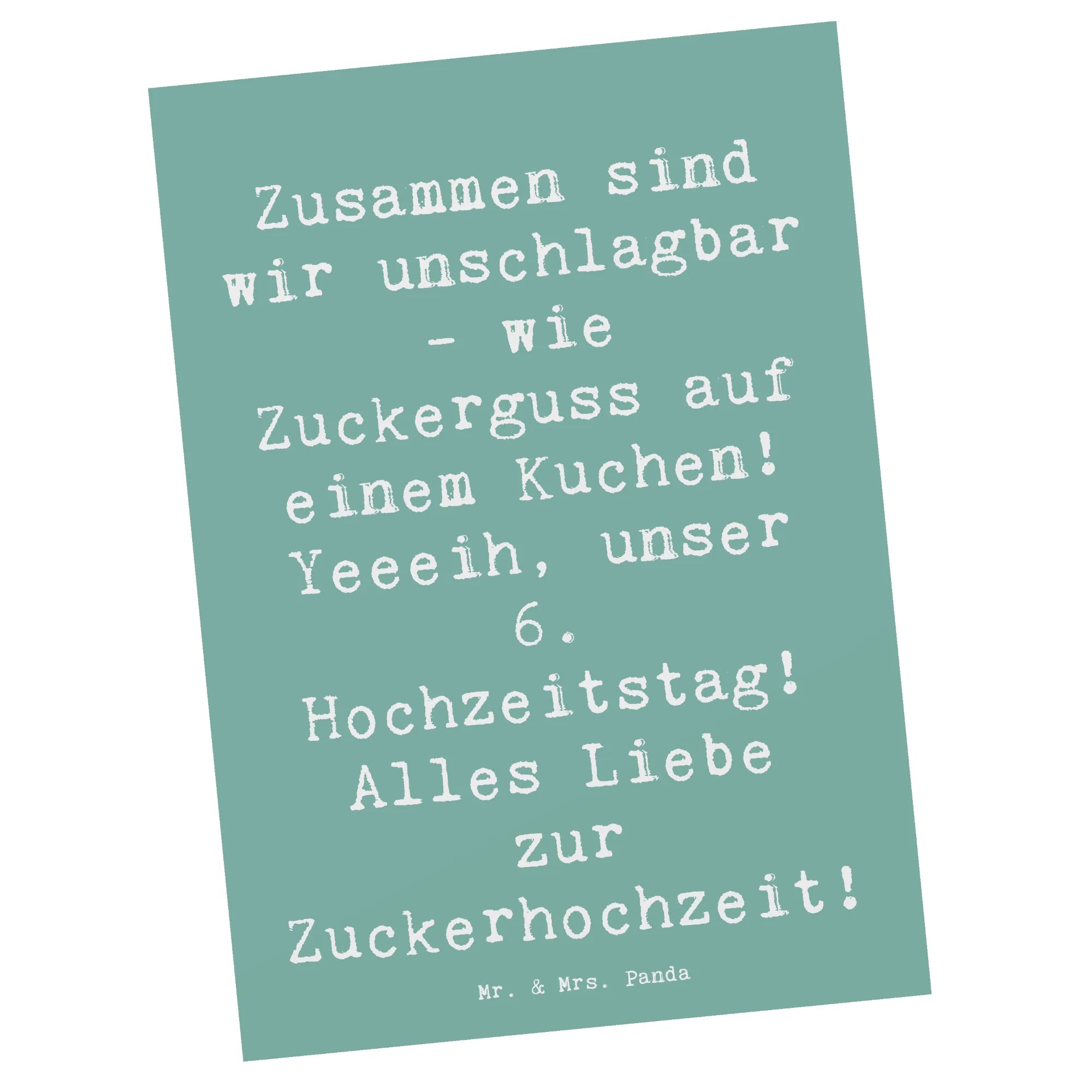 Du hältst ein kleines Meisterwerk in Händen, unsere einzigartige Postkarte von Mr. & Mrs. Panda. Diese Karte ist nicht nur eine einfache Grußkarte, sondern ein Symbol für Freude und Zuneigung. Auf der hochglänzenden Vorderseite findest du liebevolle Motive und den humorvollen Spruch: "Zusammen sind wir unschlagbar - wie Zuckerguss auf einem Kuchen! Yeeeih, unser 6. Hochzeitstag! Alles Liebe zur Zuckerhochzeit!"