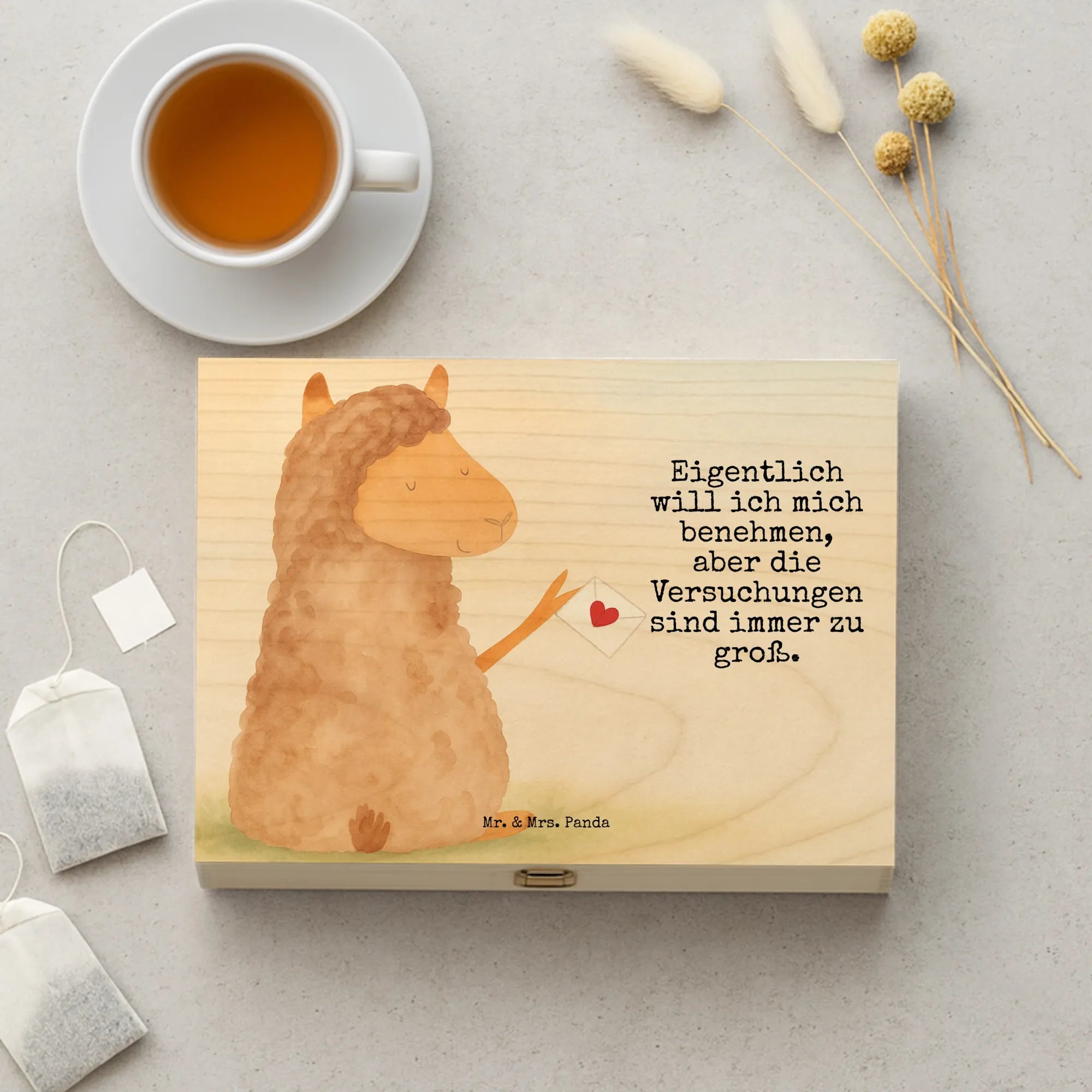 Imagine a cute alpaca holding a flag adorned with a heart, exuding a charm that’s simply irresistible. This delightful motif reminds us of the playful nature of life, where love and laughter lead the way. With the slogan, 'Eigentlich will ich mich benehmen, aber die Versuchungen sind immer zu groß,' we’re reminded that while we might aspire to behave, sometimes the sweetness of life’s little temptations calls us to indulge. The alpaca here invites you to embrace joy and let your heart soar—after all, life is too short not to enjoy every moment to the fullest!