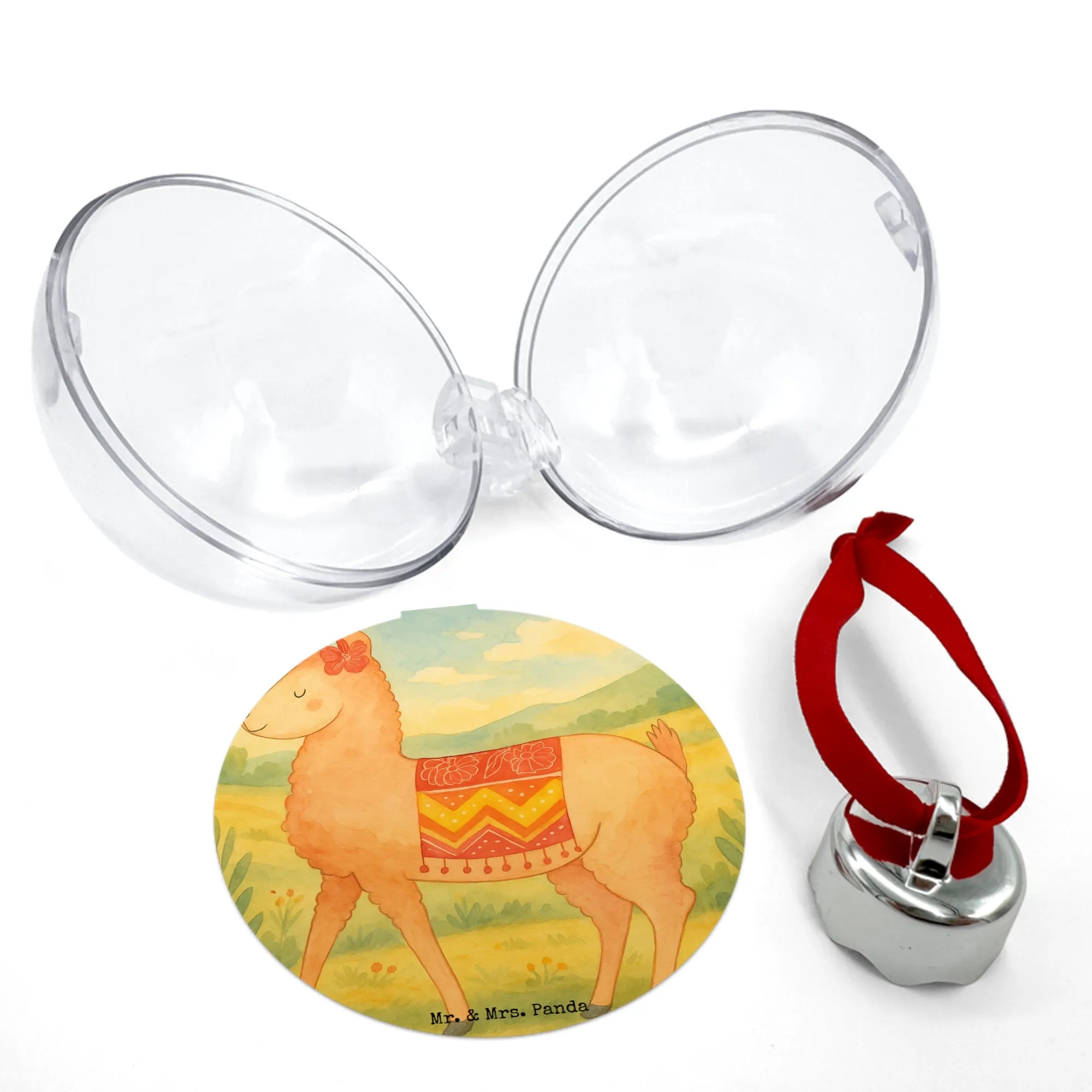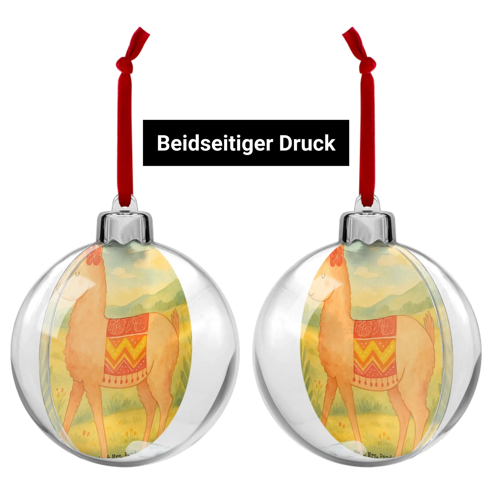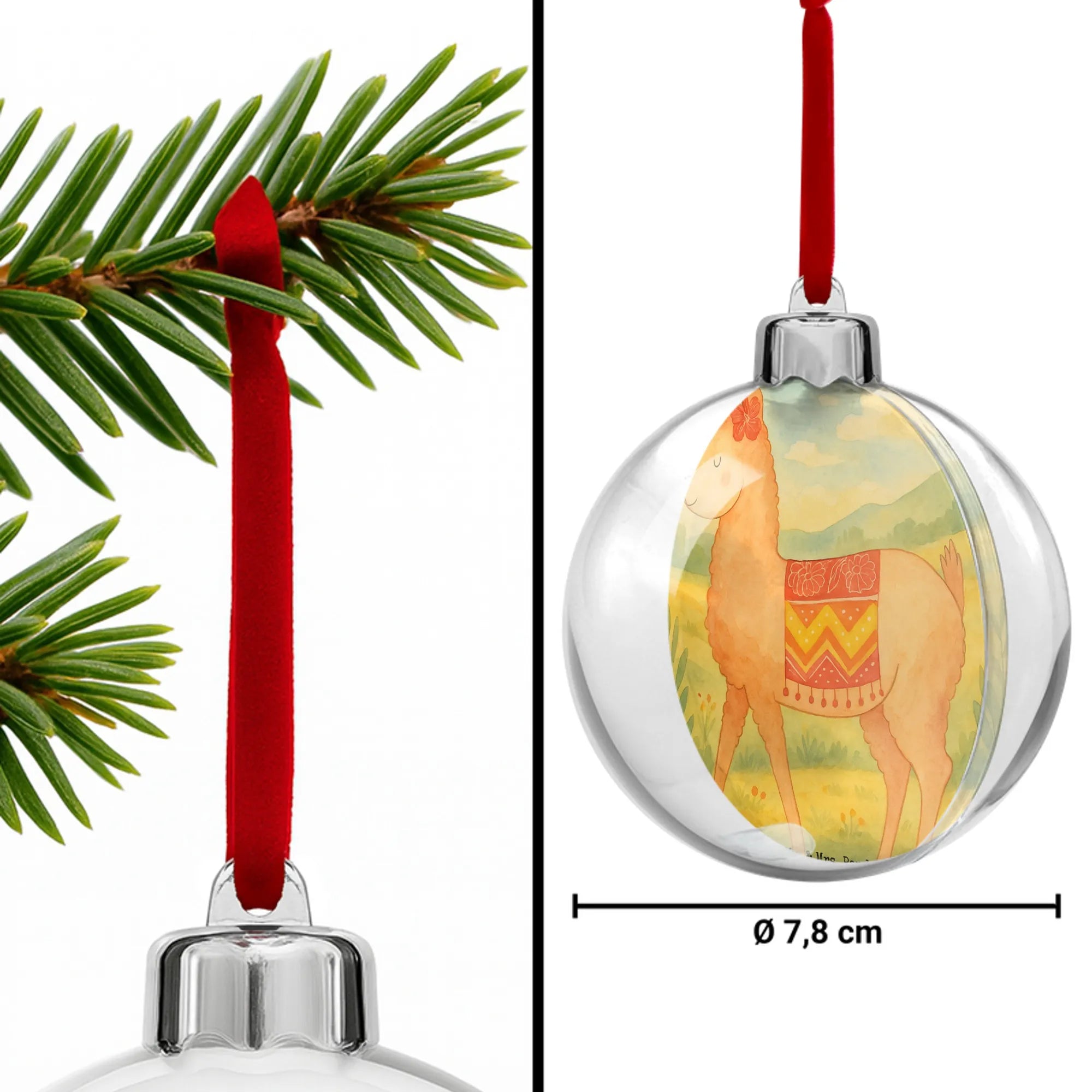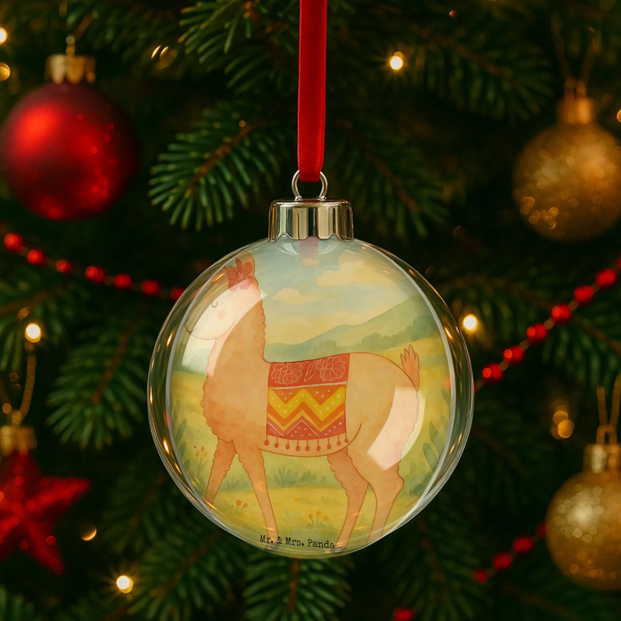 Suchst du eine besondere Weihnachtskugel? Die Mr. & Mrs. Panda Weihnachtskugel „Alpaka stolz“ bringt genau diese besondere Note in deinen Baum: ein niedliches, herausgeputztes Alpaka mit süßer Schleife, liebevoll von Mrs. Panda als Aquarell-Motiv gestaltet.