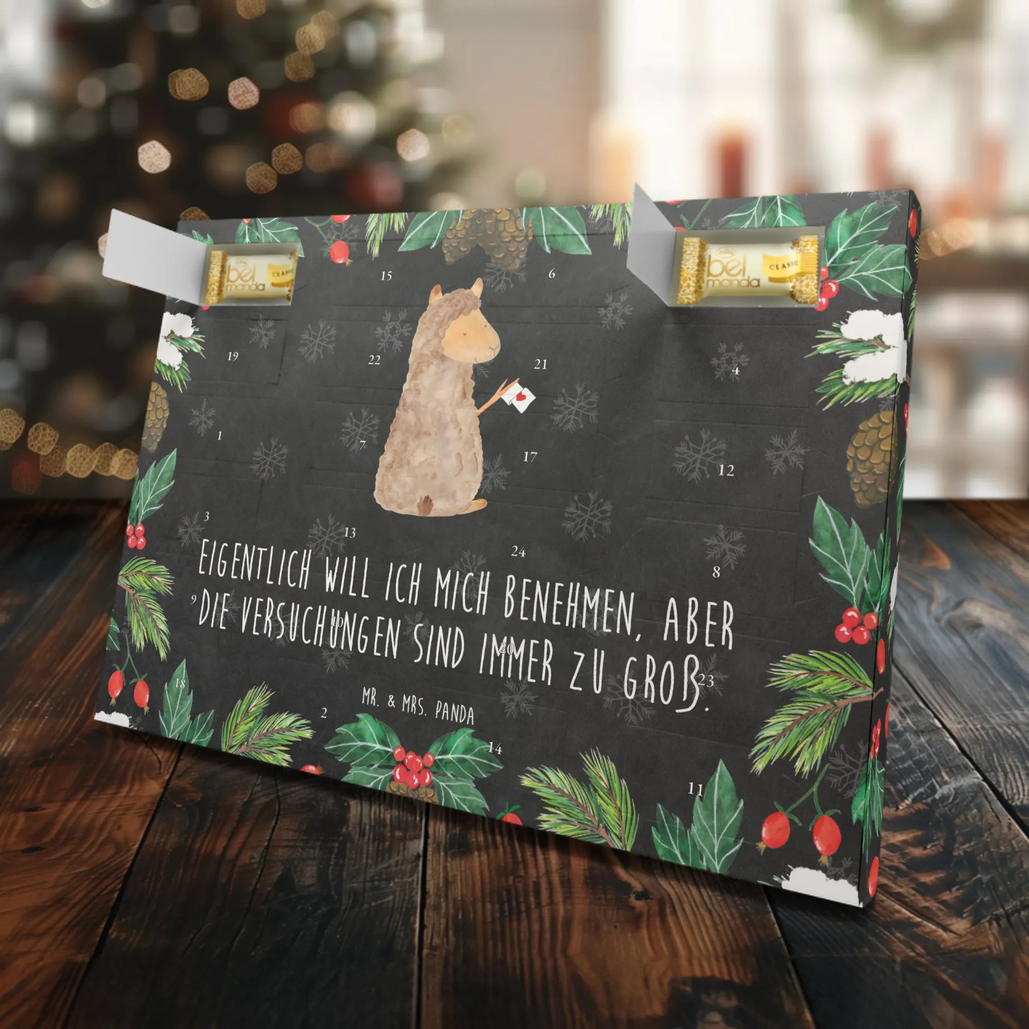 Mit einem einzigartigen Design, das freundlich lächelnde Alpakas zeigt, und dem herzlichen Spruch „Eigentlich will ich mich benehmen, aber die Versuchungen sind immer zu groß“, fördert dieser Adventskalender nicht nur das Zählen der Tage bis Weihnachten, sondern bringt auch ein Lächeln auf die Gesichter seiner Beschenkten. Die brillante Druckqualität auf 300 Gramm Karton macht ihn zu einem echten Hingucker, der sowohl aufgehängt als auch aufgestellt werden kann.