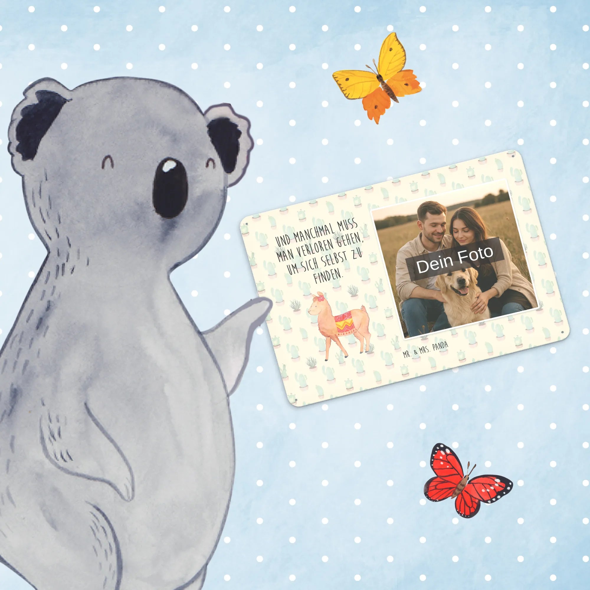 Suchst Du ein Geschenk, das persönlich, verspielt und gleichzeitig stilvoll ist? Unser personalisiertes Foto-Blechschild aus der Alpaka-Kollektion von Mr. & Mrs. Panda vereint ein handgezeichnetes Alpaka-Motiv mit Deinem Wunschfoto und dem liebevollen Spruch „Und manchmal muss man verloren gehen, um sich selbst zu finden.“ Ein echtes Highlight als Türschild mit Bild, Metallschild mit Wunschfoto oder als Dekoschild für Wohnzimmer und Küche.
