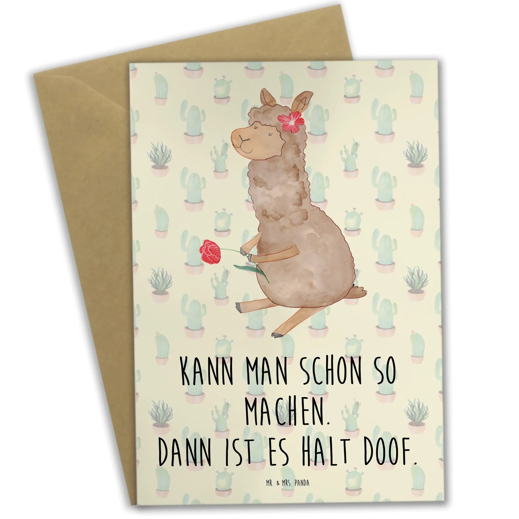 The front of the card showcases a whimsical illustration of a fluffy alpaca with a beautiful flower in its hair, adding a touch of nature’s beauty to every greeting. Whether it’s for a birthday, wedding, or just because, this card brings smiles and warmth wherever it goes!