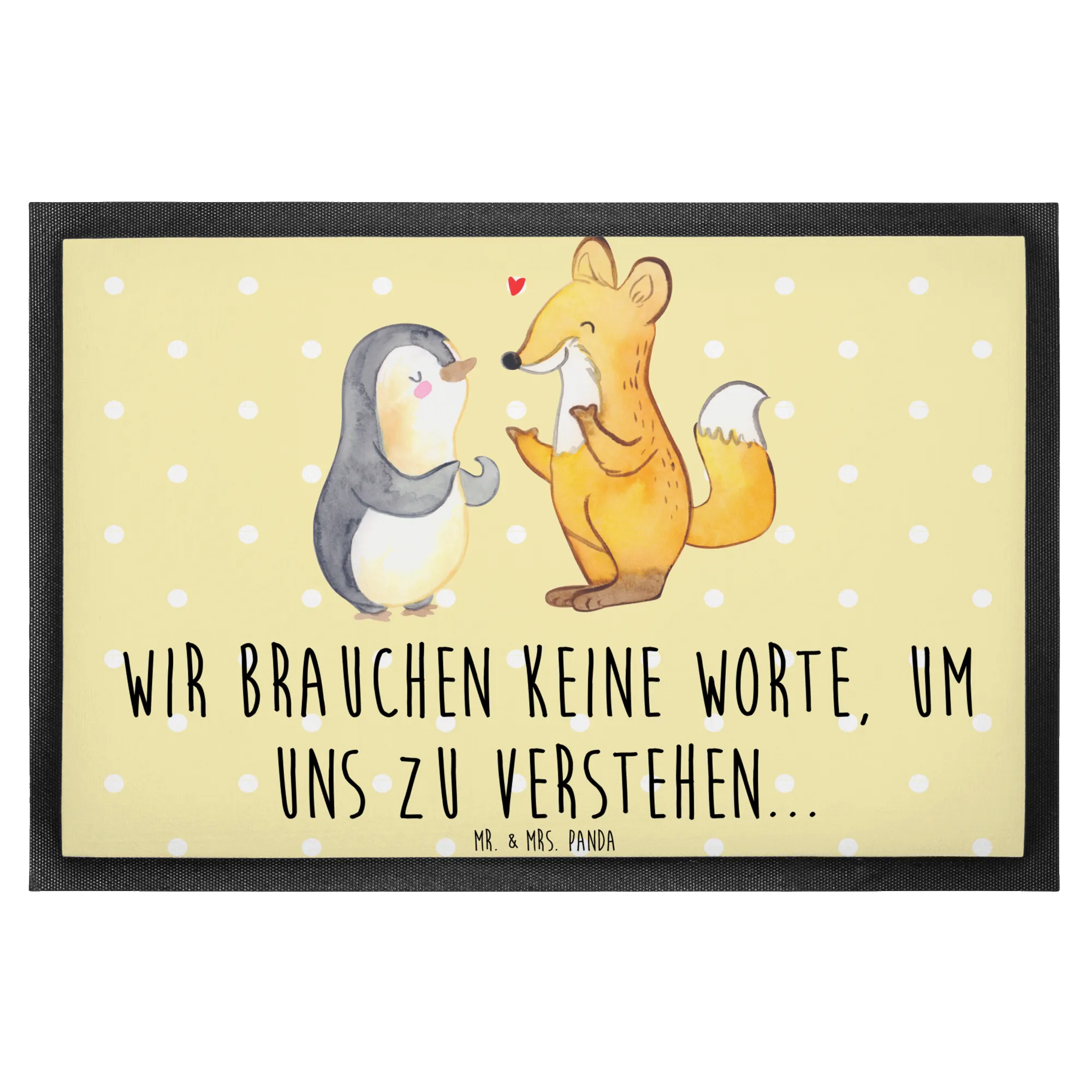 Entdecke die bezaubernde Fußmatte mit dem Motiv Fuchs & Pinguin, die Teil unserer besonderen Kollektion "Tiere mit Superkräften" ist. Diese wunderschöne und hochfunktionale Fußmatte von Mr. & Mrs. Panda bringt nicht nur Farbe in deinen Eingangsbereich, sondern setzt auch ein Zeichen der Inklusion für Menschen mit Hörbeeinträchtigung. Mit dem liebevollen Slogan "Wir brauchen keine Worte, um uns zu verstehen..." vermittelt sie eine starke Botschaft, dass Kommunikation über Worte hinausgeht.