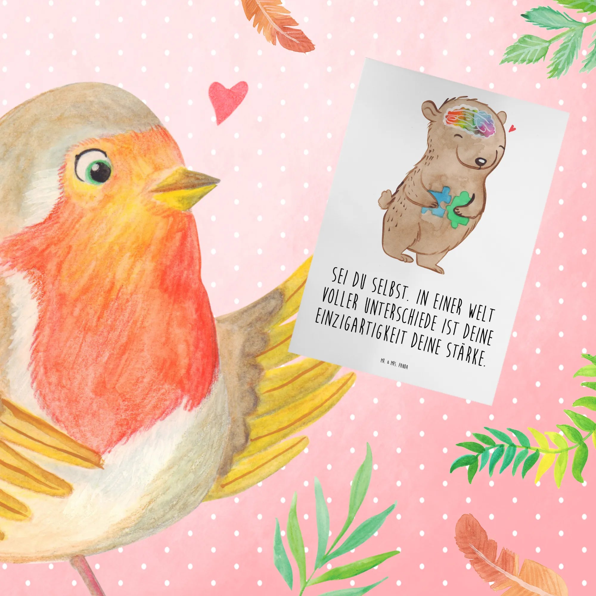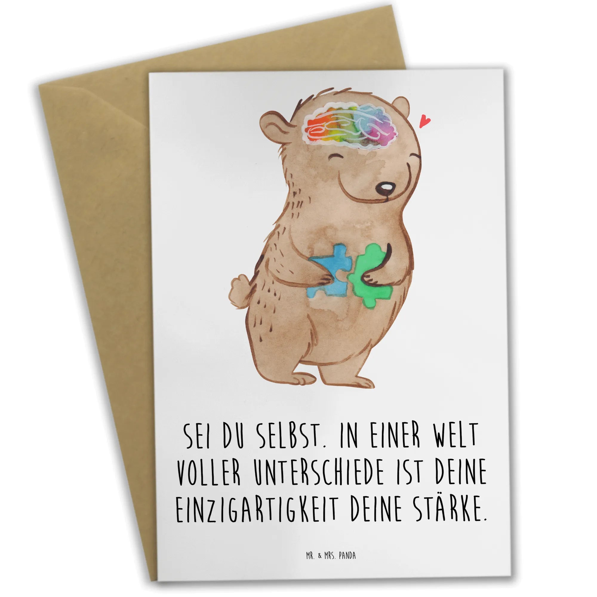 Introducing our Autism Bear, a heartwarming embodiment of individuality! Standing with a puzzle piece in its paw, the bear echoes the intricacies of the autism spectrum, where each piece fits together in its own unique way. The important message, 'Be yourself. In a world full of differences, your uniqueness is your strength,' shines like a beacon of hope and inspiration. This delightful motif serves as an inviting reminder to cherish ourselves and others just as we are. The Autism Bear encourages us to look beyond the surface, understanding the values that differences bring into our lives. Let's celebrate with joy and compassion that every unique soul contributes beautifully to the fabric of our community!