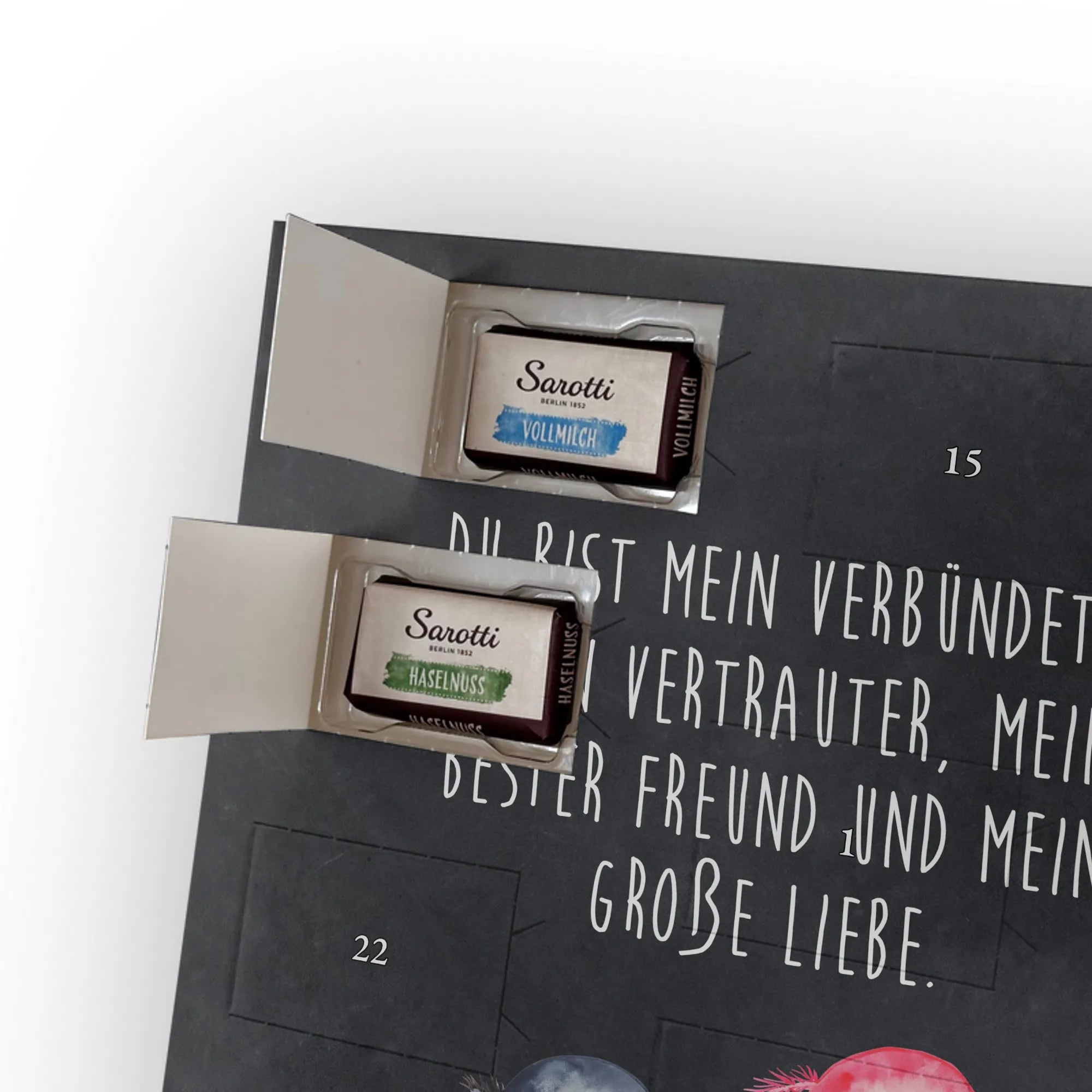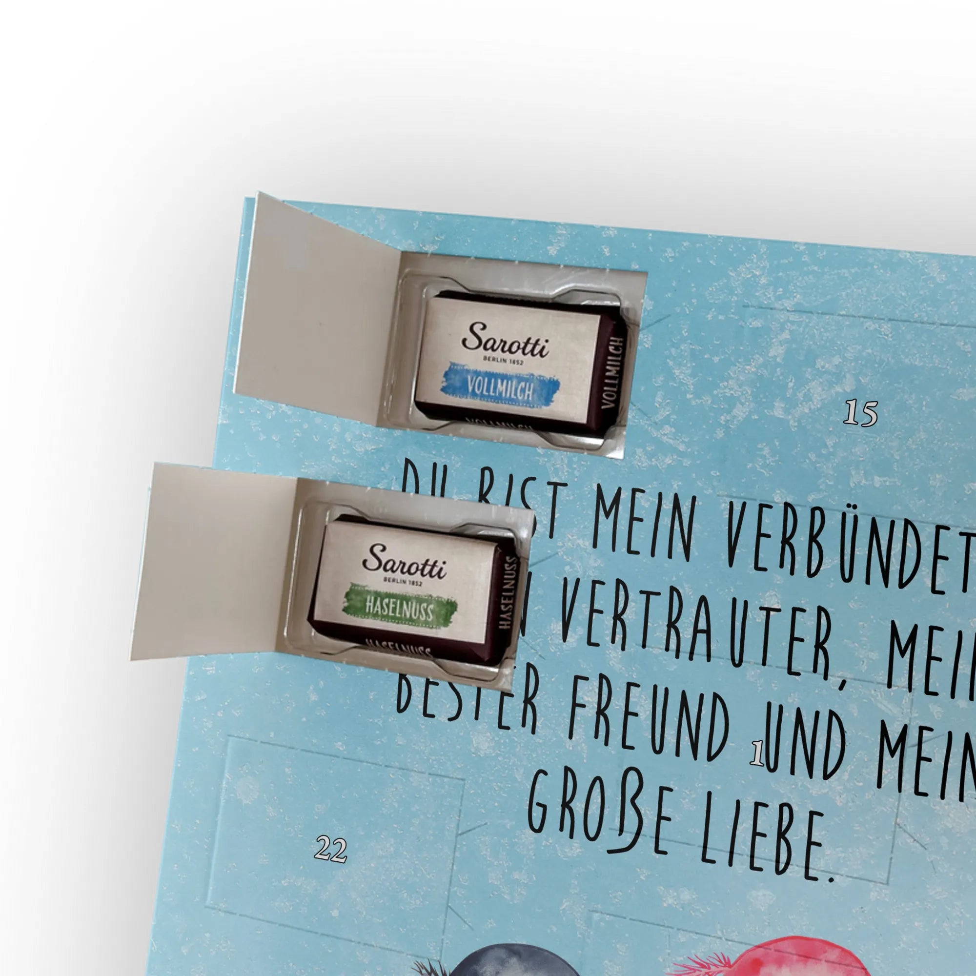 Personalisierter Schoko Foto Adventskalender – ein liebevoll gestaltetes Geschenk von Mr. & Mrs. Panda, perfekt für kuschelige Vorweihnachtszeiten! Dieser Adventskalender ist bedruckt mit wunderschönen Motiven und herzlichen Sprüchen von Mr. & Mrs. Panda und lässt sich ganz einfach mit deinem Lieblingsfoto personalisieren. Achte darauf, dass dein hochgeladenes Bild eine hohe Auflösung hat und der Bildausschnitt passt, damit das Druckergebnis klar und schön wird. Lade nur Fotos hoch, bei denen du die Rechte besitzt oder die Erlaubnis zur Nutzung hast, besonders bei Personenbildern. Der Kalender besticht durch brillante Druckqualität mit seidenmatter Oberflächenveredelung und bedruckten Seitenflächen. Maße: 355 mm x 245 mm x 11 mm – ideal zum Aufhängen oder Aufstellen. Besonderheit: Kann aufgehängt oder aufgestellt werden. Bitte beachte: Die Fotos werden weder aufbereitet noch zugeschnitten. Rücknahme bei personalisierten Foto Artikeln ist ausgeschlossen. Gefüllt mit hochwertiger Füllung aus 24 einzeln verpackten Schokoladentäfelchen in vier Geschmacksrichtungen (Sarotti® und Confiserie Heidel®). Insgesamt 107 g Markenschokolade von Sarotti® und Confiserie Heidel® in den Sorten Vollmilch, Nougat, Zartbitter und Haselnuss. Ein persönliches, süßes Highlight für Familie, Freunde oder deinen Schatz – mit viel Herz und den typischen Mr. & Mrs. Panda Motiven.