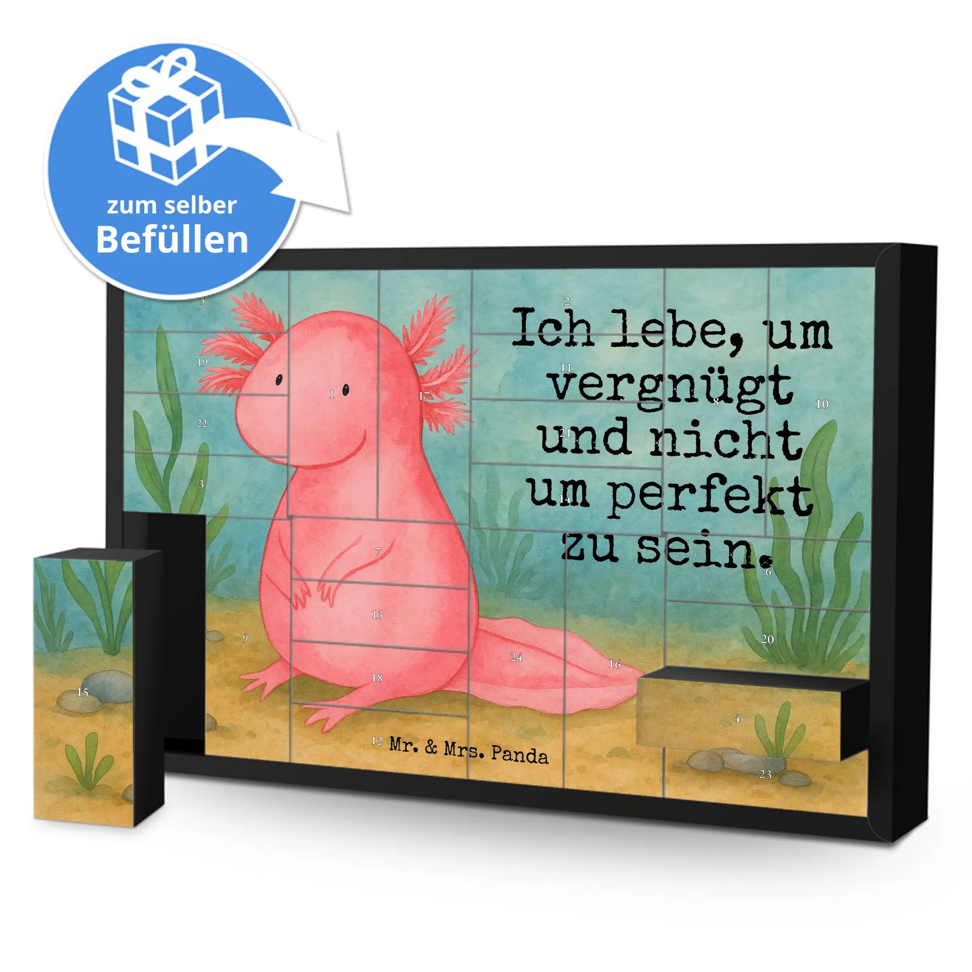 Unser Adventskalender zum Selbstbefüllen bringt Dir und Deinen Liebsten eine besondere Adventszeit: ein niedlicher, fröhlicher Axolotl, liebevoll von Mrs. Panda gezeichnet, begleitet von dem herzlichen Spruch „Ich lebe, um vergnügt und nicht um perfekt zu sein." Dieses Motiv aus der Axolotl-Kollektion steht für Lebensfreude, Zufriedenheit und Liebe – perfekt als Geschenk für Freundin, beste Freundin, Kinder oder alle Fans der Unterwasserwelt.