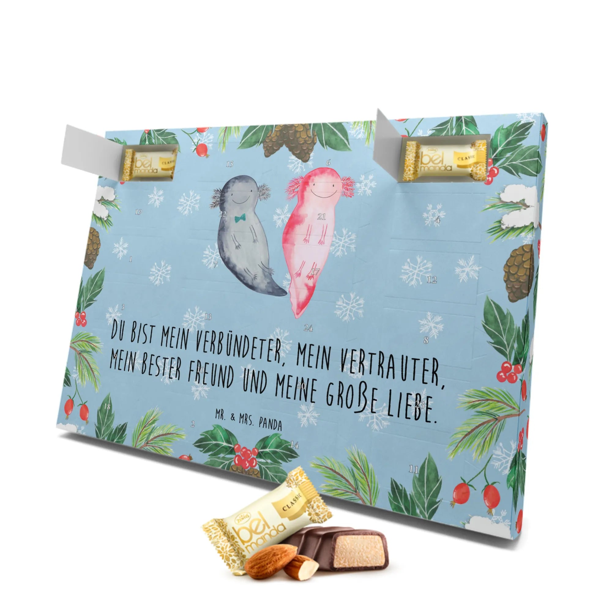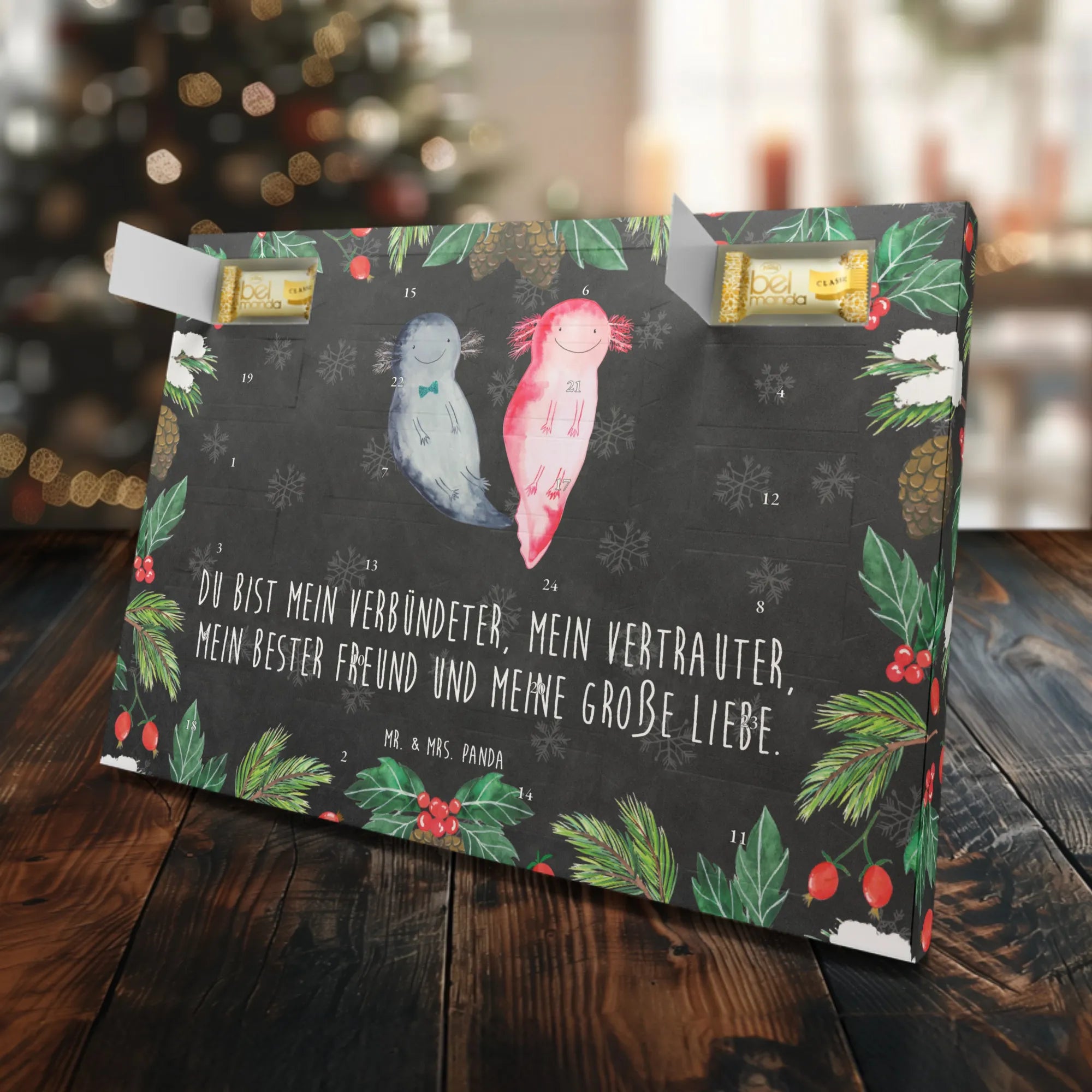 Der Marzipan Adventskalender Axolotl Axel+Lotte von Mr. & Mrs. Panda ist das ideale Geschenk für alle, die das Besondere lieben. Dieser bezaubernde Adventskalender im niedlichen Axolotl-Design wird nicht nur Deinen Advent versüßen, sondern bringt auch jede Menge Freude und Abenteuer in die Vorweihnachtszeit. Die süßen, handgezeichneten Axolotl Axel und Lotte schwimmen fröhlich in zarten Pastelltönen und laden Dich ein, mit ihnen in die magische Unterwasserwelt einzutauchen. Mit einem liebevollen Spruch „Du bist mein Verbündeter, mein Vertrauter, mein bester Freund und meine große Liebe.“ wird dieser Kalender zu einem liebevollen Liebesbeweis, perfekt für Deinen Freund, Verlobten oder Ehemann.