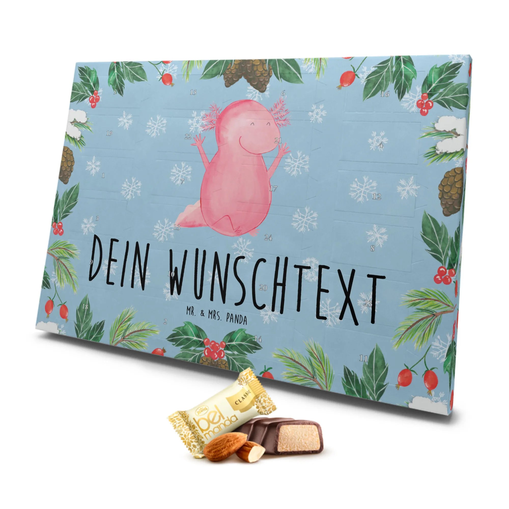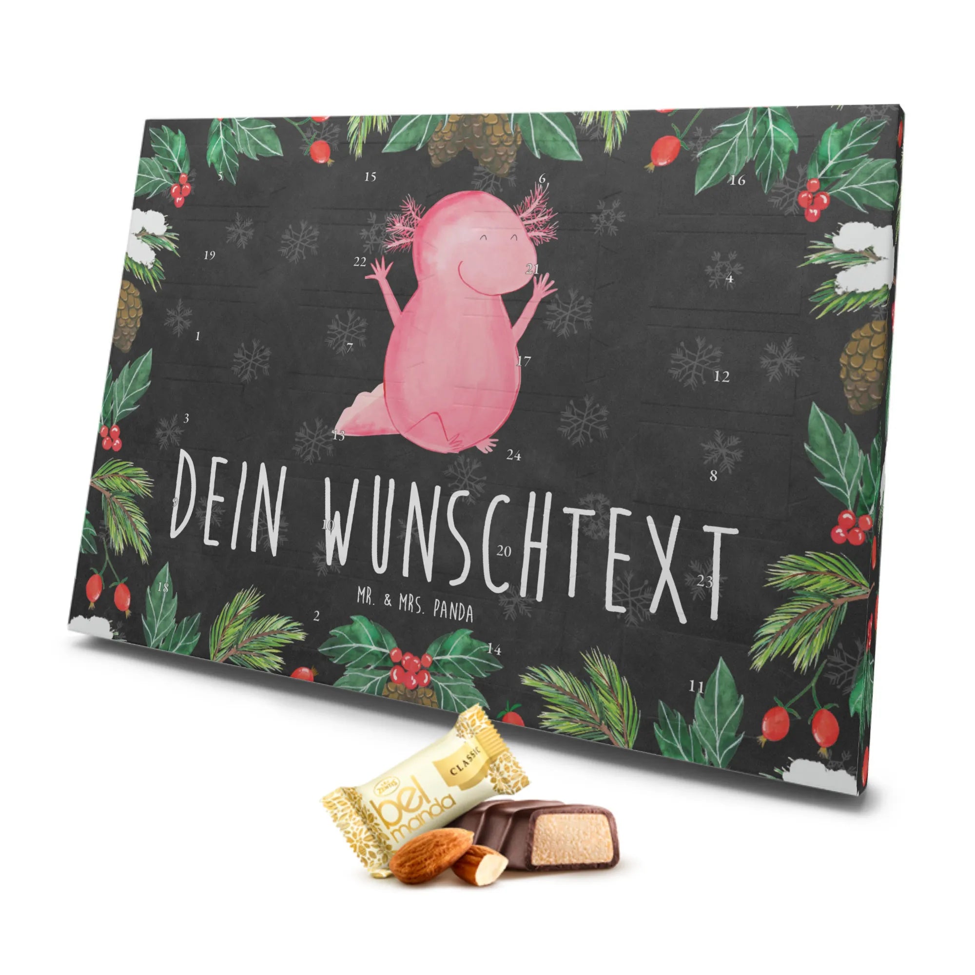 Jeder, der einen Axolotl liebt, wird sich über diesen Adventskalender freuen. Damit ein Geschenk nicht nur schön, sondern auch unvergesslich wird, ist dieser personalisierte Adventskalender genau das Richtige.