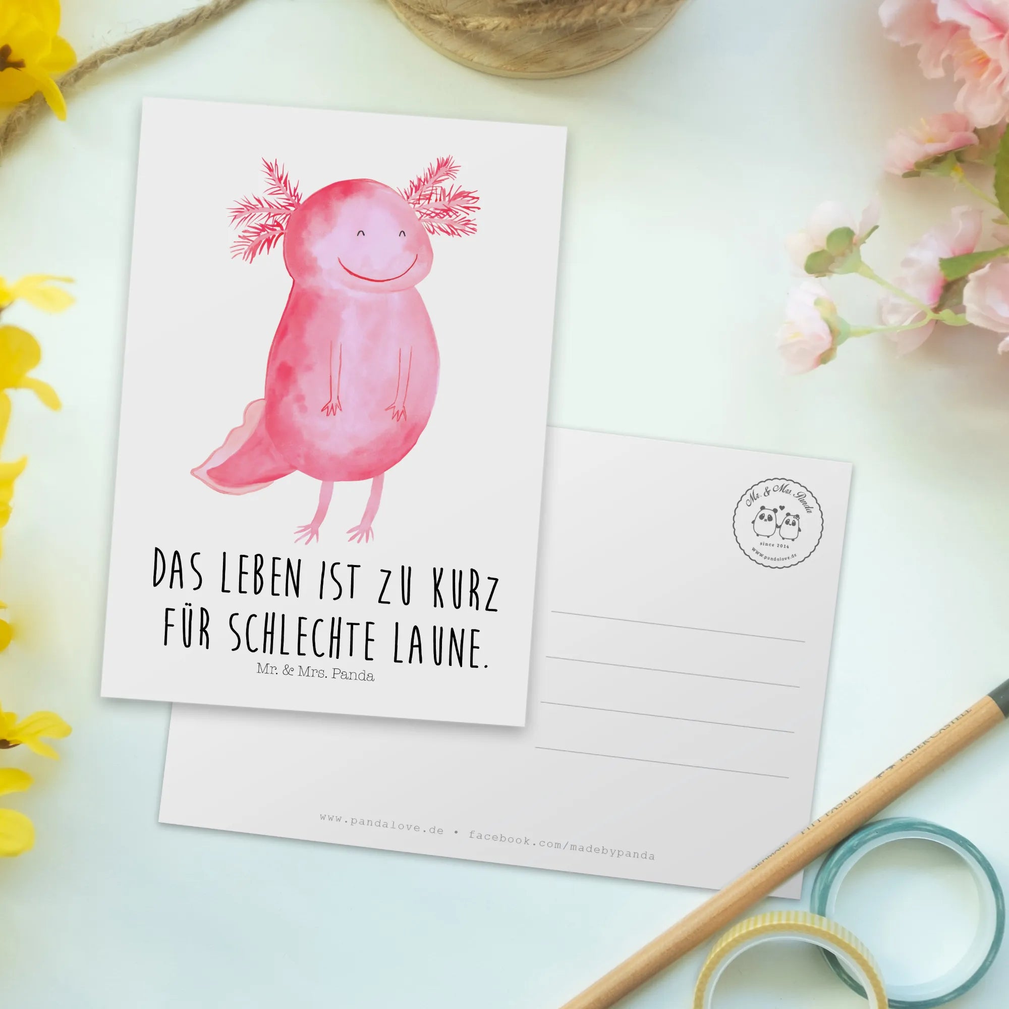 Whether you’re a fan of axolotls, amphibians, or simply want to share a motivational message about life, this postcard is sure to make an impact. It carries the uplifting slogan, "Life is too short to spend in a bad mood," reminding everyone to find joy in the little things and embrace happiness.