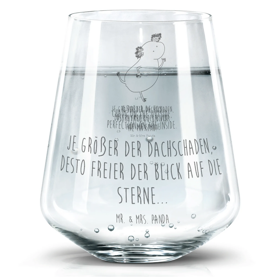 Mit dem Spruch „Je größer der Dachschaden, desto freier der Blick auf die Sterne...“ auf dem Glas, wird jeder, der daraus trinkt, an die schönen und verrückten Seiten des Lebens erinnert. Die besondere Axolotl-Kollektion von Mr. & Mrs. Panda umfasst viele weitere Produkte, die diesen kleinen, charmanten Schwanzlurch zum Thema haben.