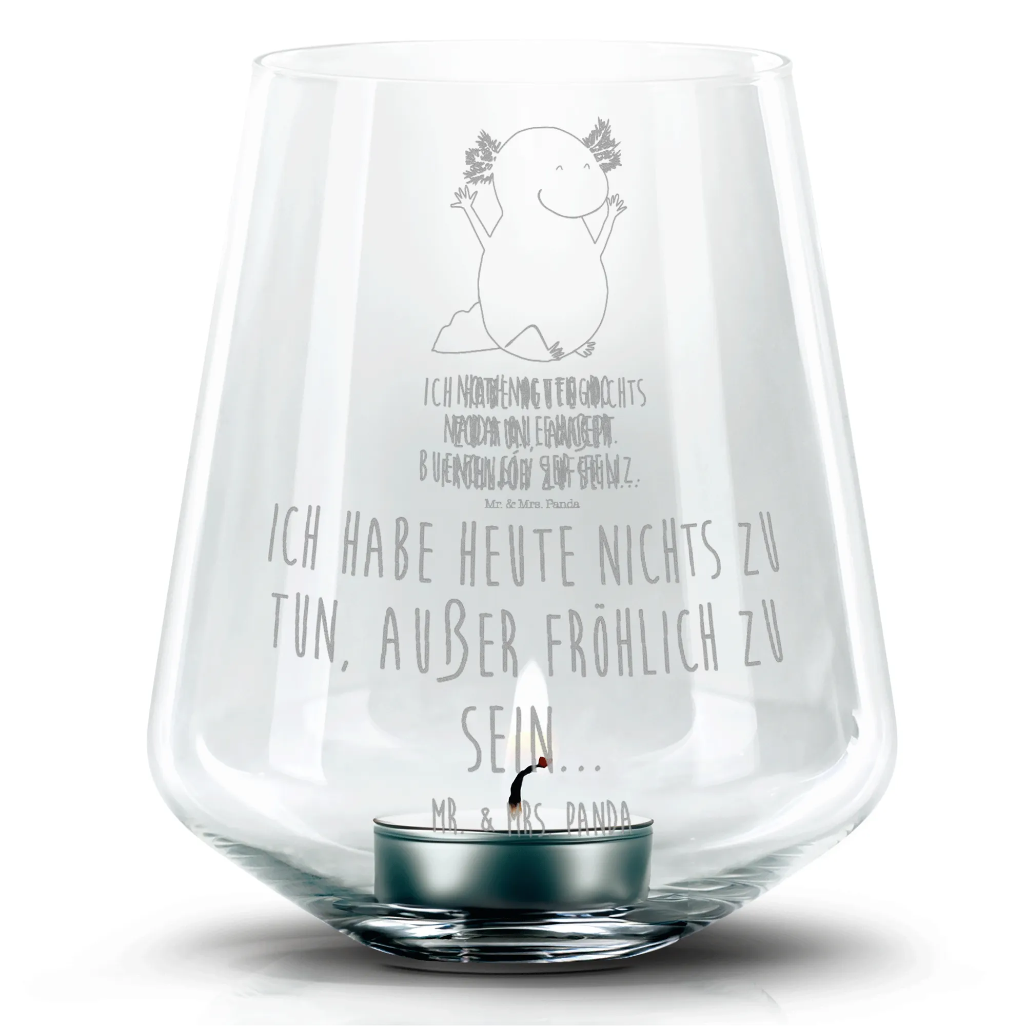 Windlicht Axolotl Hurra Windlicht aus Glas, Romatisches Windlicht, Teelicht, Teelichthalter, Gravur Windlicht, Axolotl, Molch, Lurche, Motivation, Lurch, Zufriedenheit, Freude, Schwanzlurch, Spaß, fröhlich, Axolot