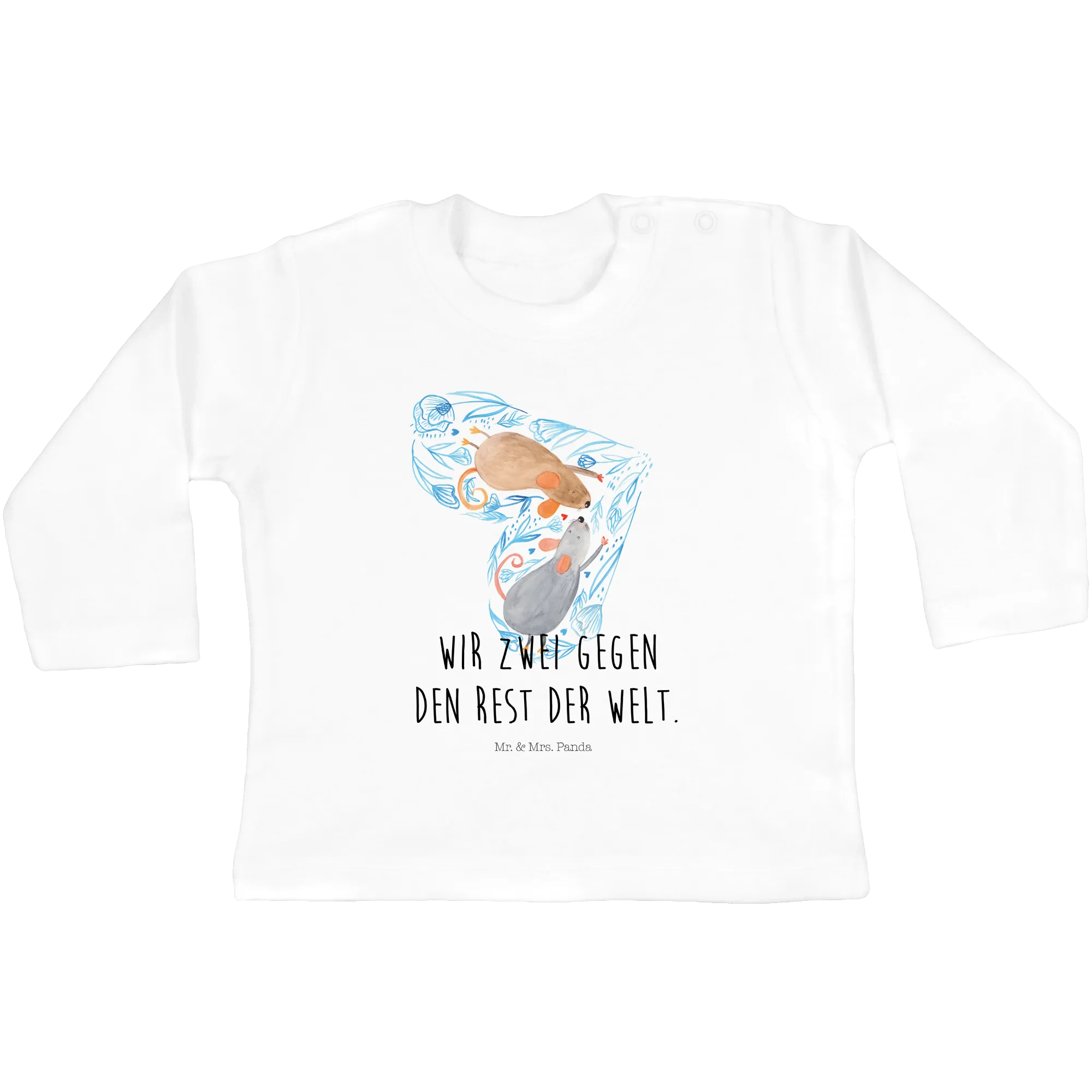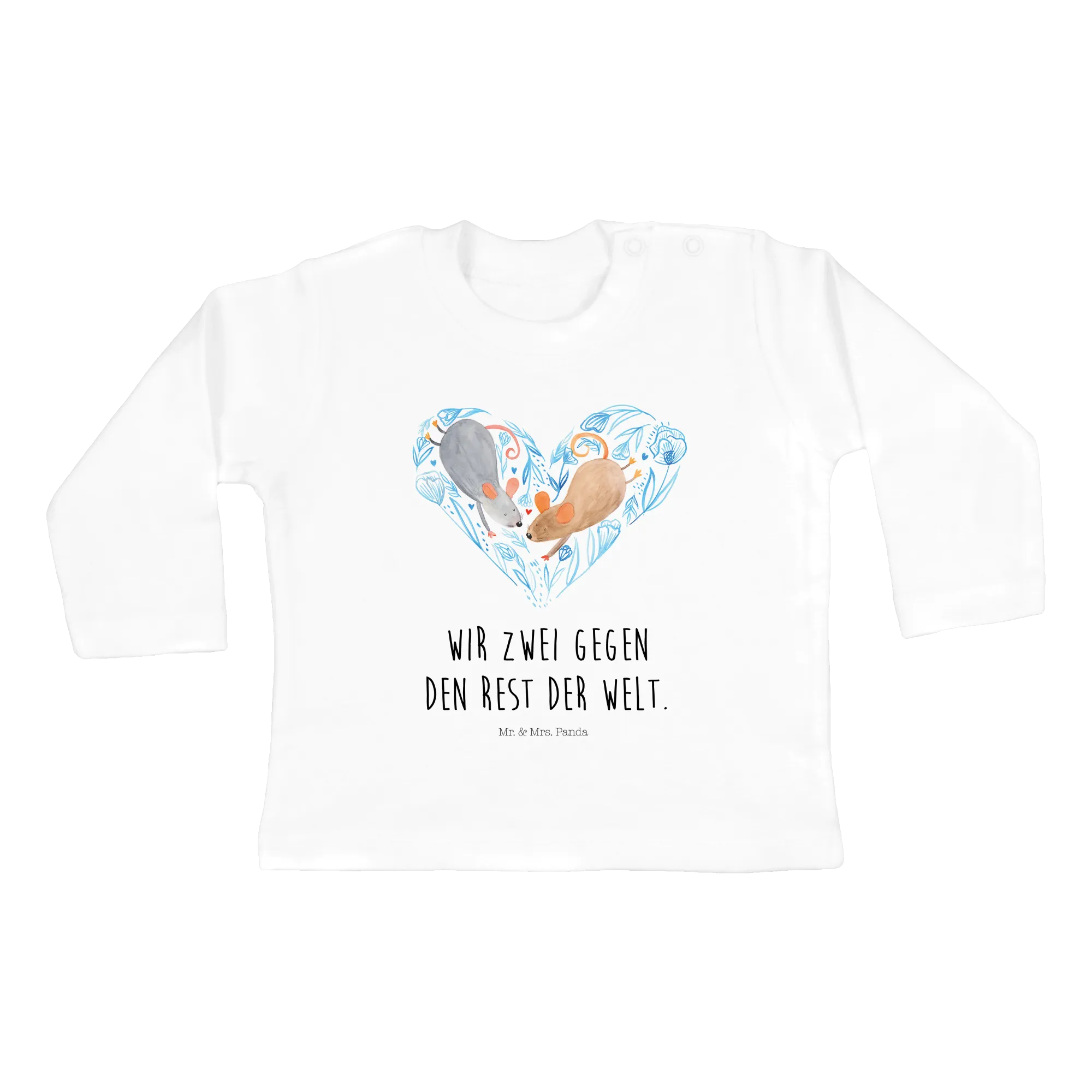 Our Mice Heart design features beautifully hand-painted watercolor illustrations, bringing to life a story of love and connection. The subtle gray and beige hues combined with delicate floral elements surrounding the heart create a serene and loving ambiance, ideal for any baby’s wardrobe. This captivating motif conveys a powerful love message: "How wonderful it is to walk through life together!" It's perfect for parents who wish to celebrate their relationship and the joy of parenthood in a meaningful way.