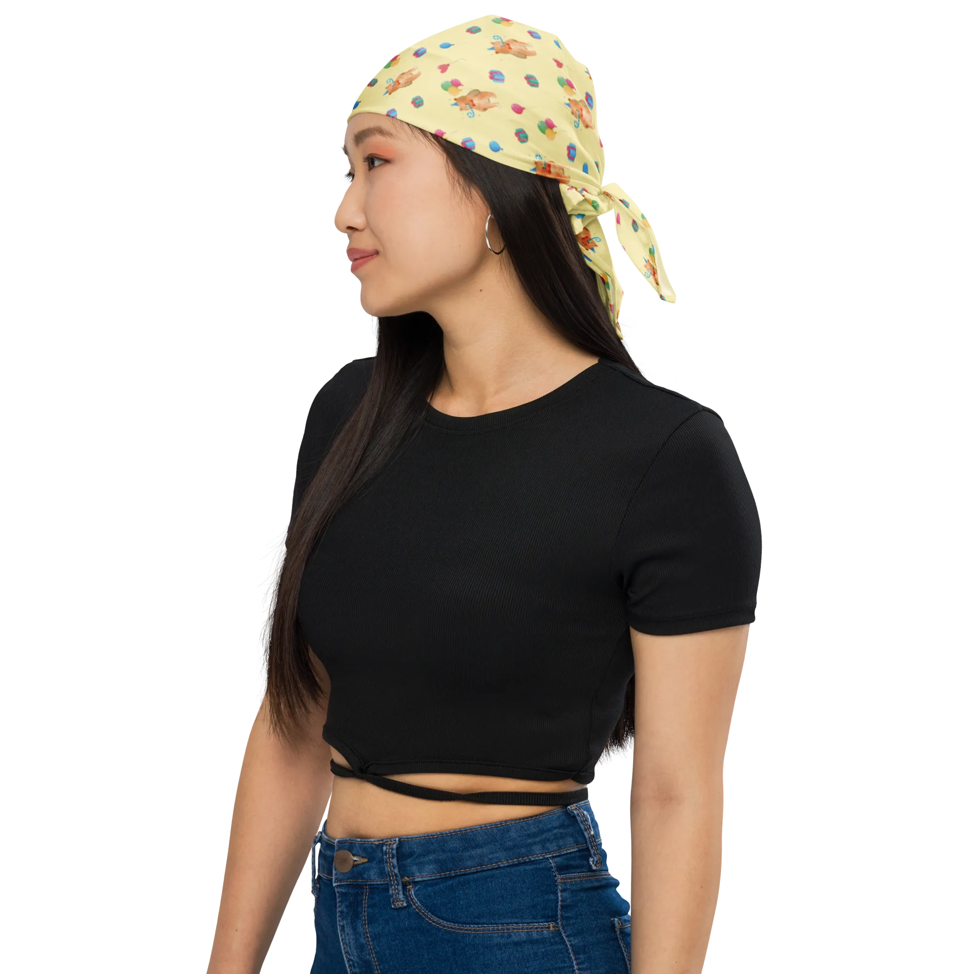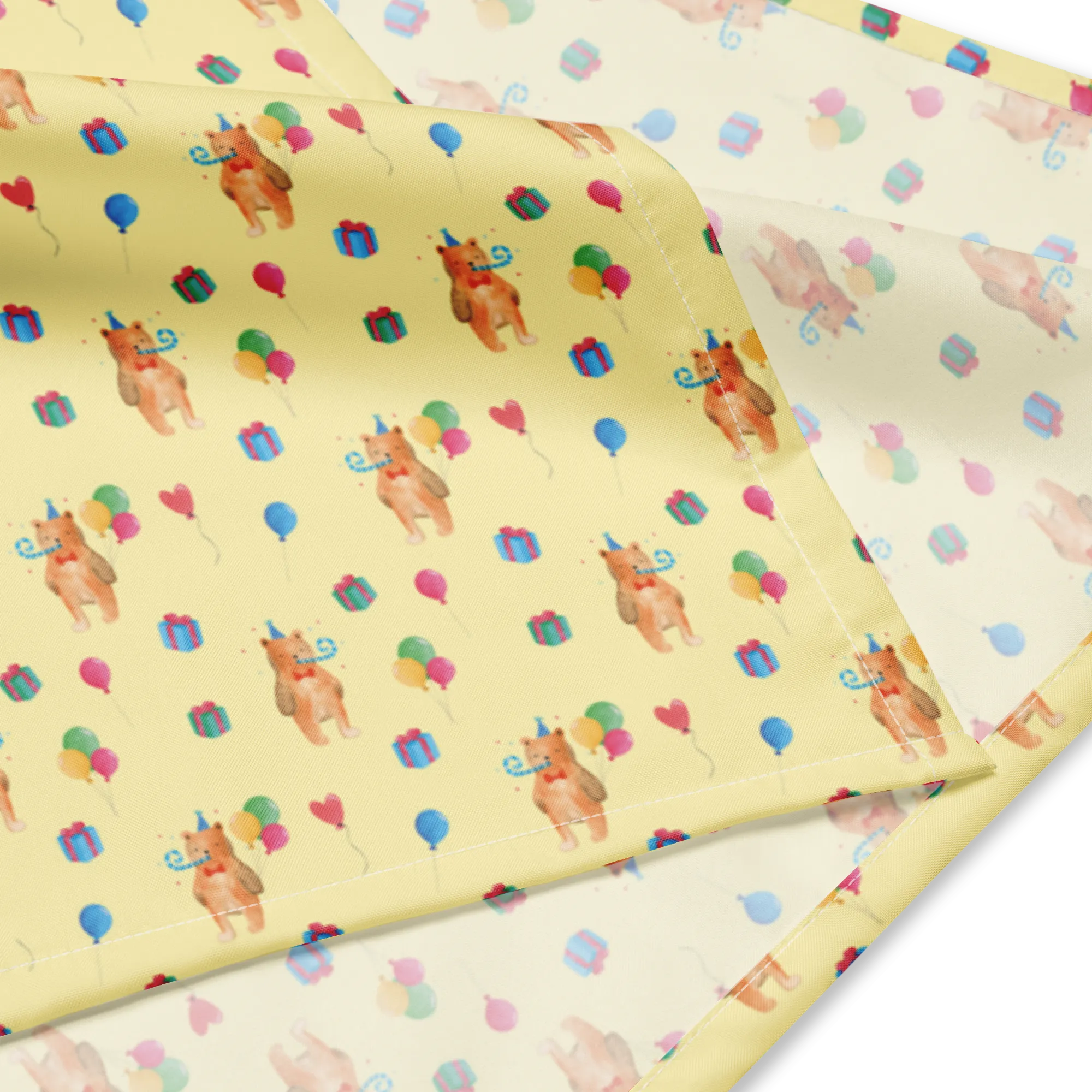 With its cheerful motif featuring a lovely bear in festive attire, it's ideal for birthday parties, outdoor adventures, or simply lounging around with friends and family. Measuring at 21 inches by 21 inches, this bandana is perfectly sized for both kids and adults.