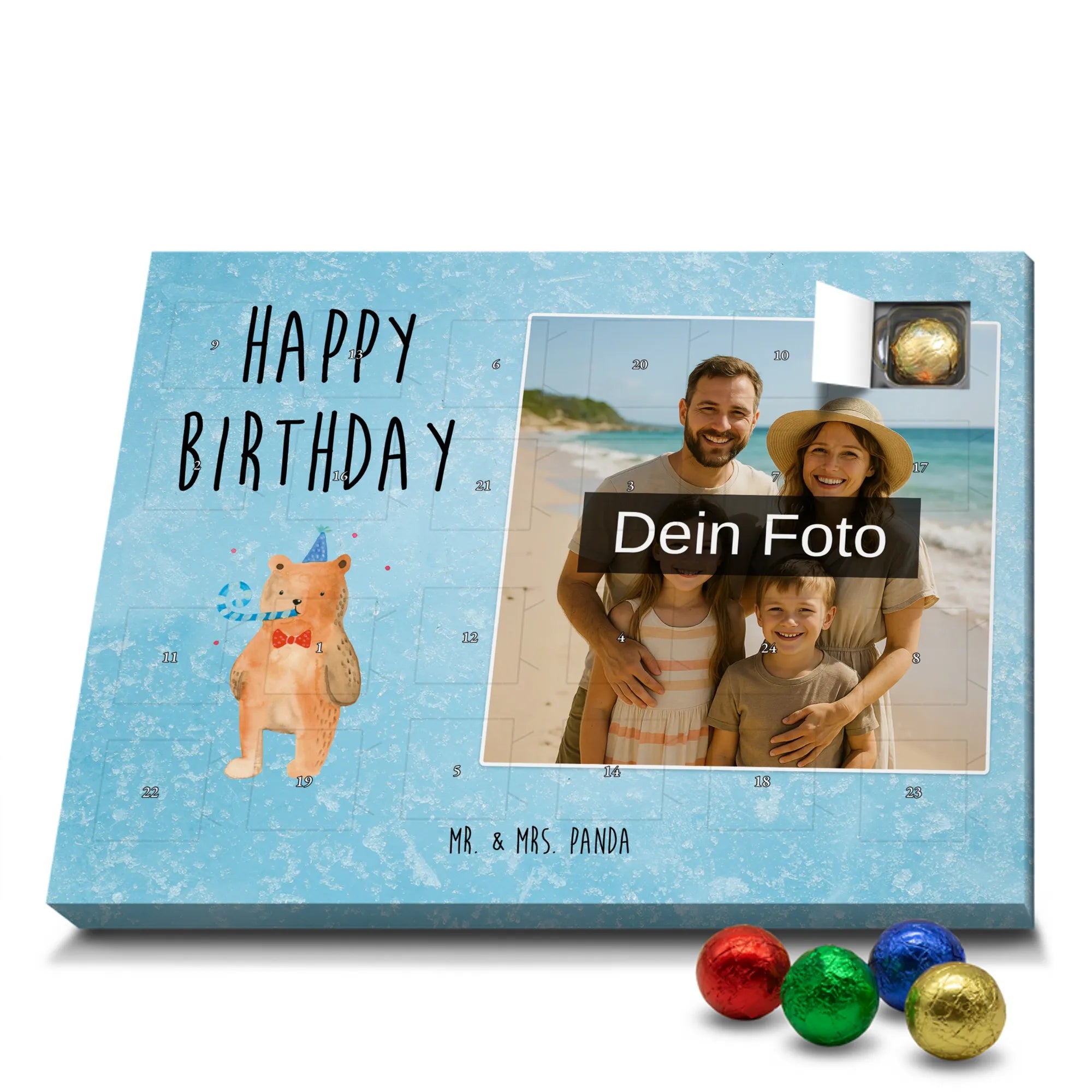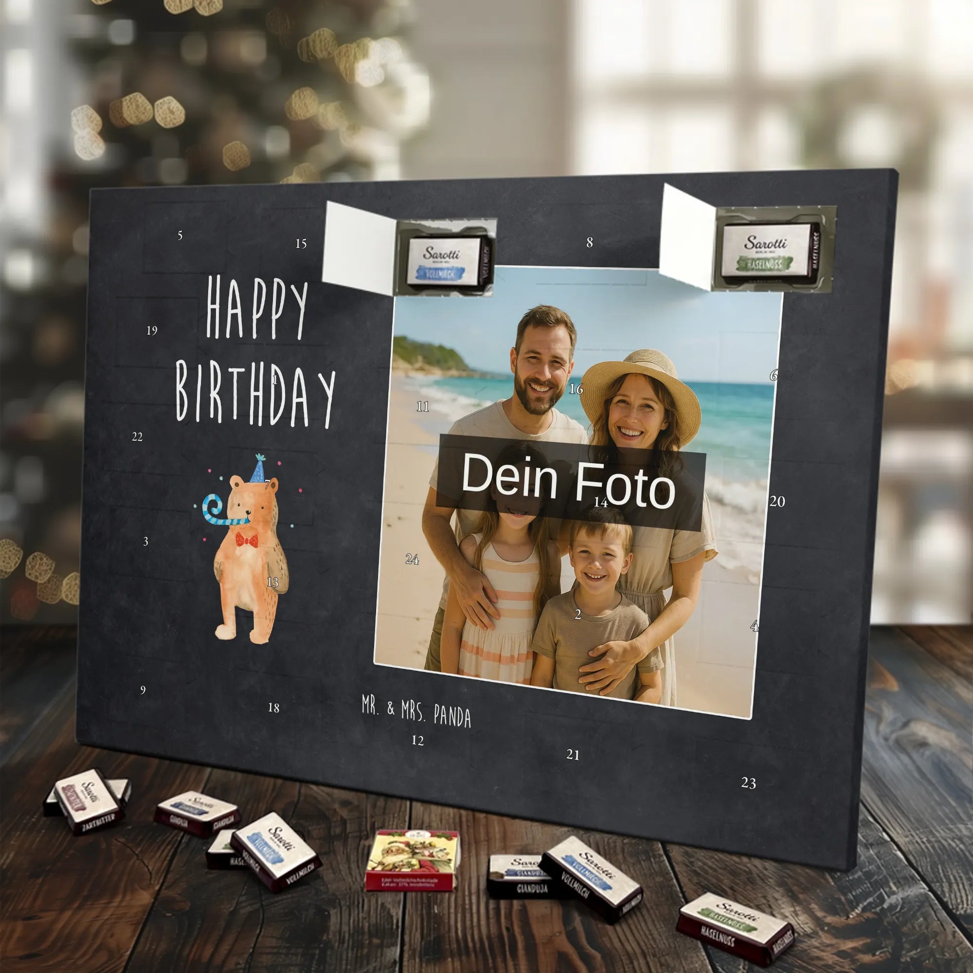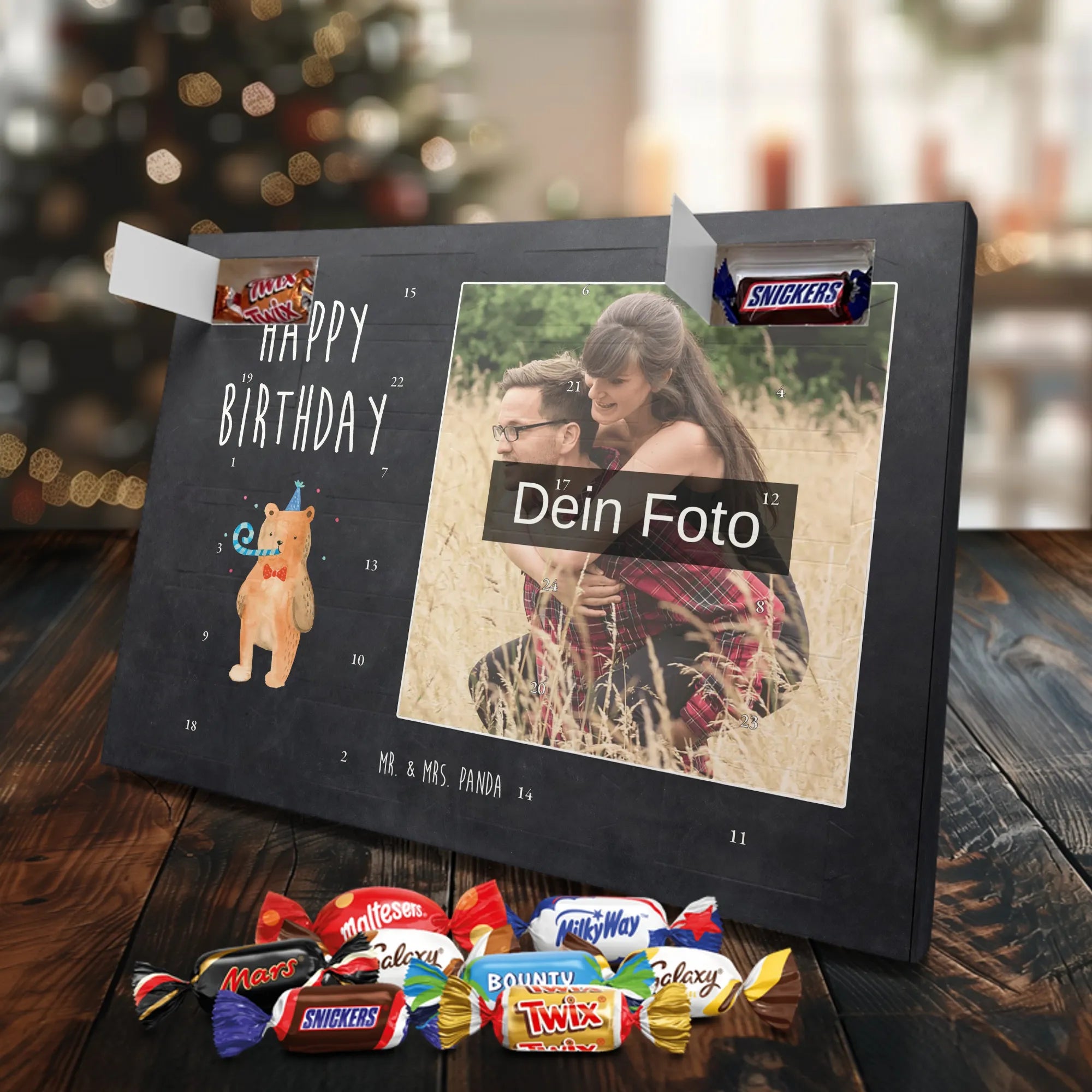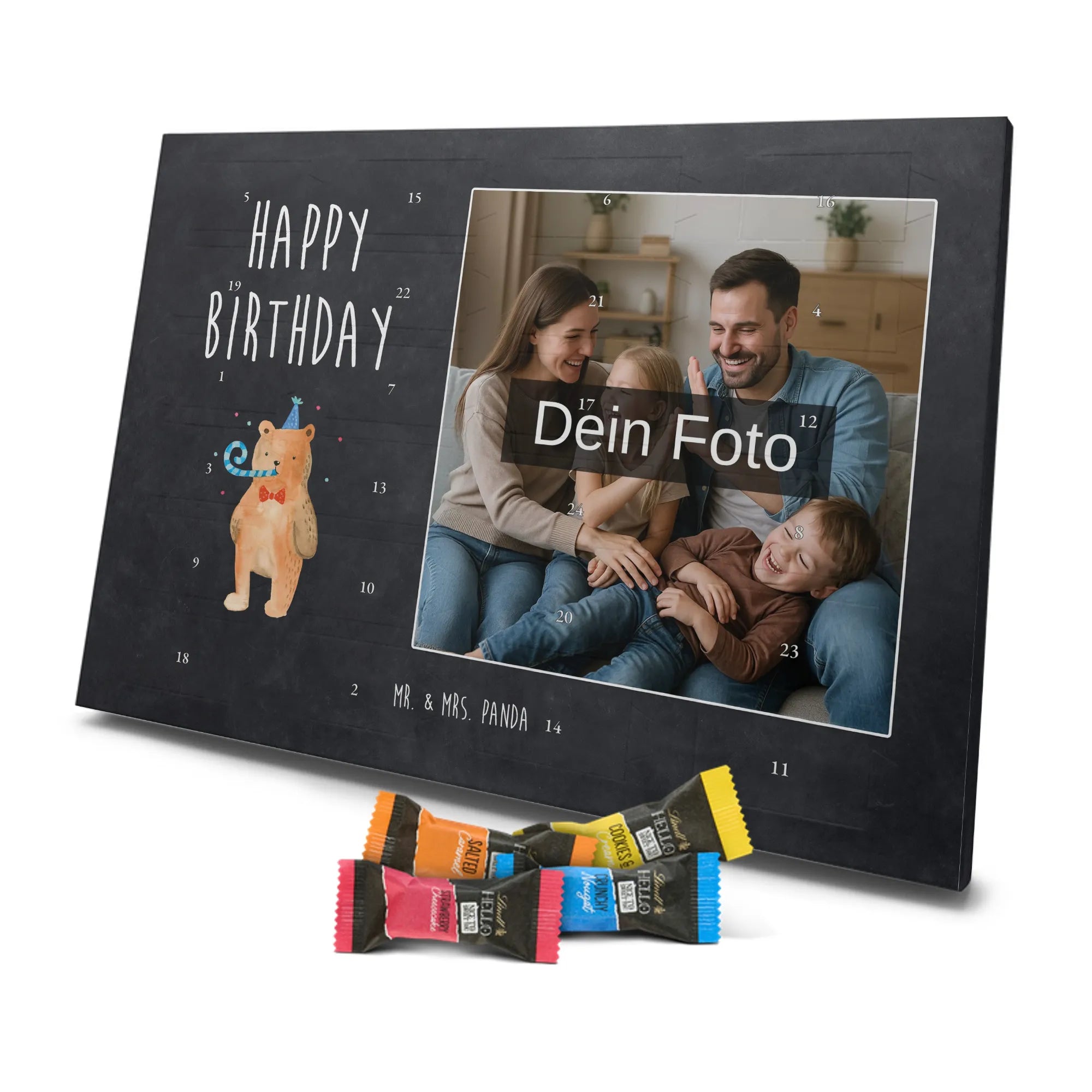 Feiere Geburtstag mit Herz und Süße! Unser Personalisierter Schoko Foto Adventskalender im niedlichen Birthday Bär Design von Mr. & Mrs. Panda ist das ideale Geschenk für alle Bärenfans und Teddybär-Liebhaber. Du kannst ein persönliches Foto einfügen und den Kalender so zu einem ganz besonderen Geburtstagsgeschenk machen. Der fröhliche Bär mit bunten Luftballons und der Slogan „Happy Birthday“ verleiht dem Kalender eine fröhliche, festliche Note. 🎉
