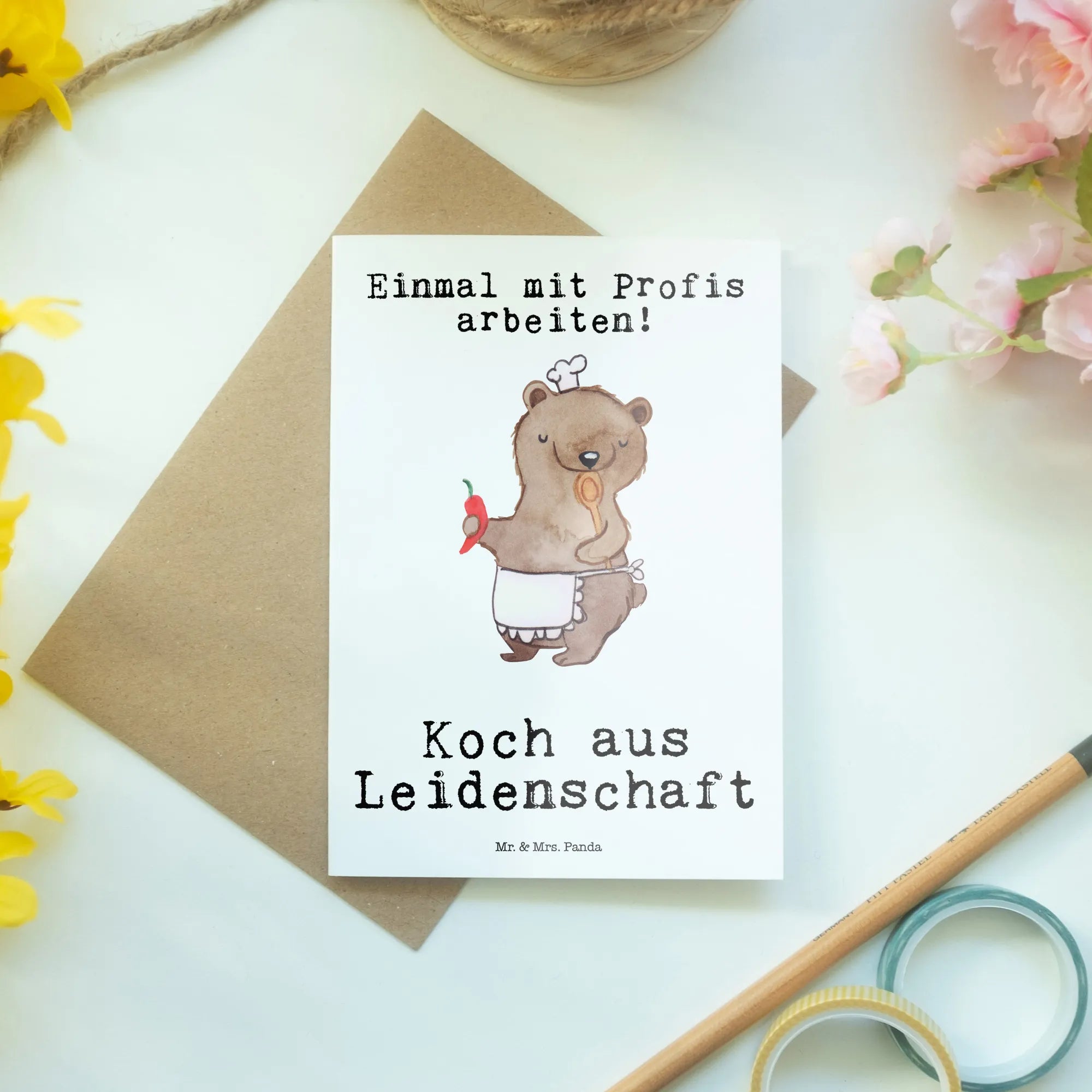 Entdecke die bezaubernde Grußkarte "Koch aus Leidenschaft" von Mr. & Mrs. Panda! Diese wunderschöne und einzigartige Karte ist nicht nur ein perfektes kleines Kunstwerk, sondern auch ein ideales Geschenk für all jene, die das Kochen und Genießen von gutem Essen in ihren Herzen tragen. Der süße Bär, der die Karte ziert, trägt eine Kochmütze und hält eine Chili in einer Hand sowie einen Kochlöffel in der anderen, um die Leidenschaft für das Kochen perfekt zum Ausdruck zu bringen.