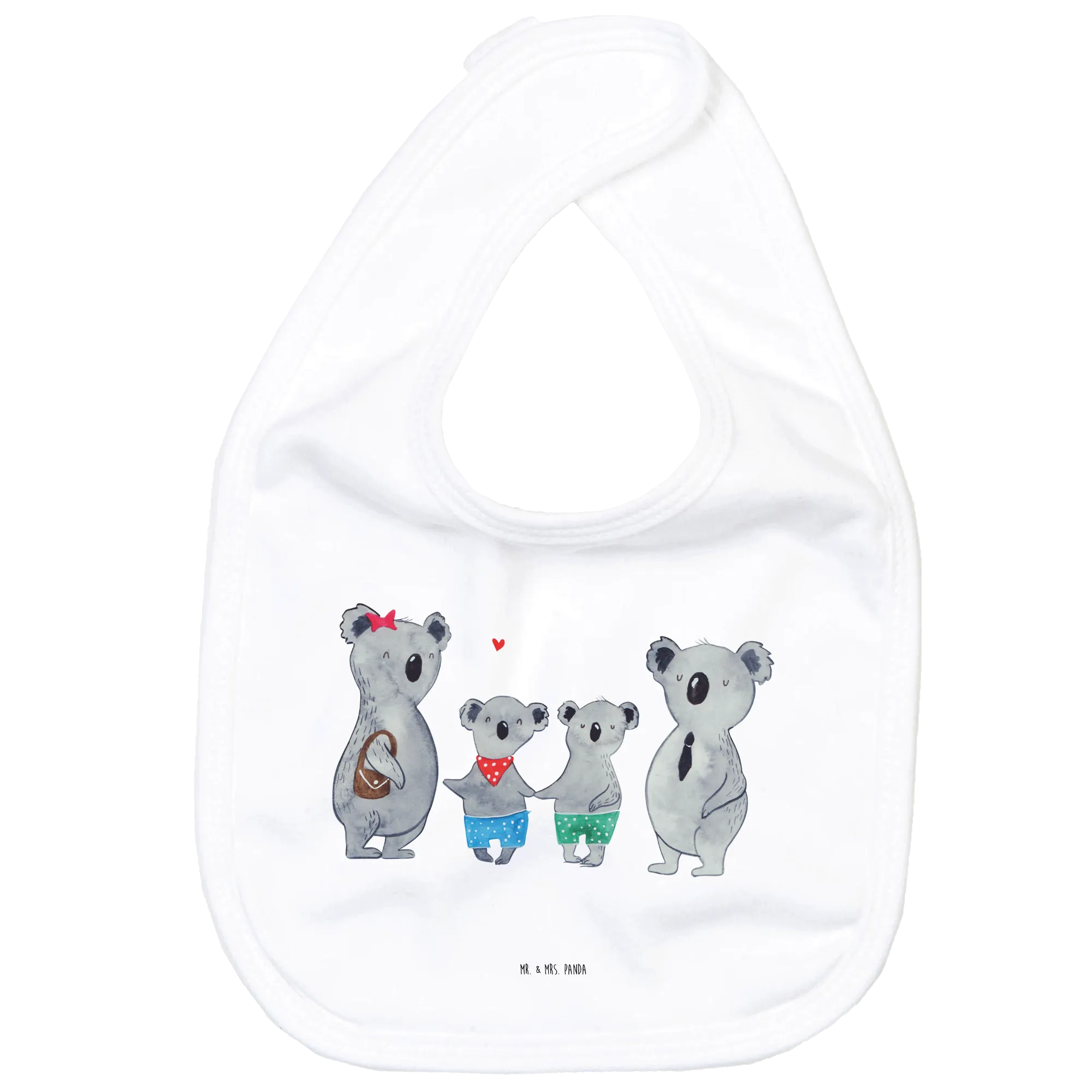 Imagine a soft cotton bib adorned with a lovingly designed motif featuring a playful Koala family. In this delightful illustration, the Koala mom, complete with a cute red star in her hair, carries a charming brown handbag, while the dad, charming in his suit and tie, offers a gentle smile. The two cheerful children in their colorful shorts capture the essence of family joy, making this bib a perfect companion for mealtimes and beyond.