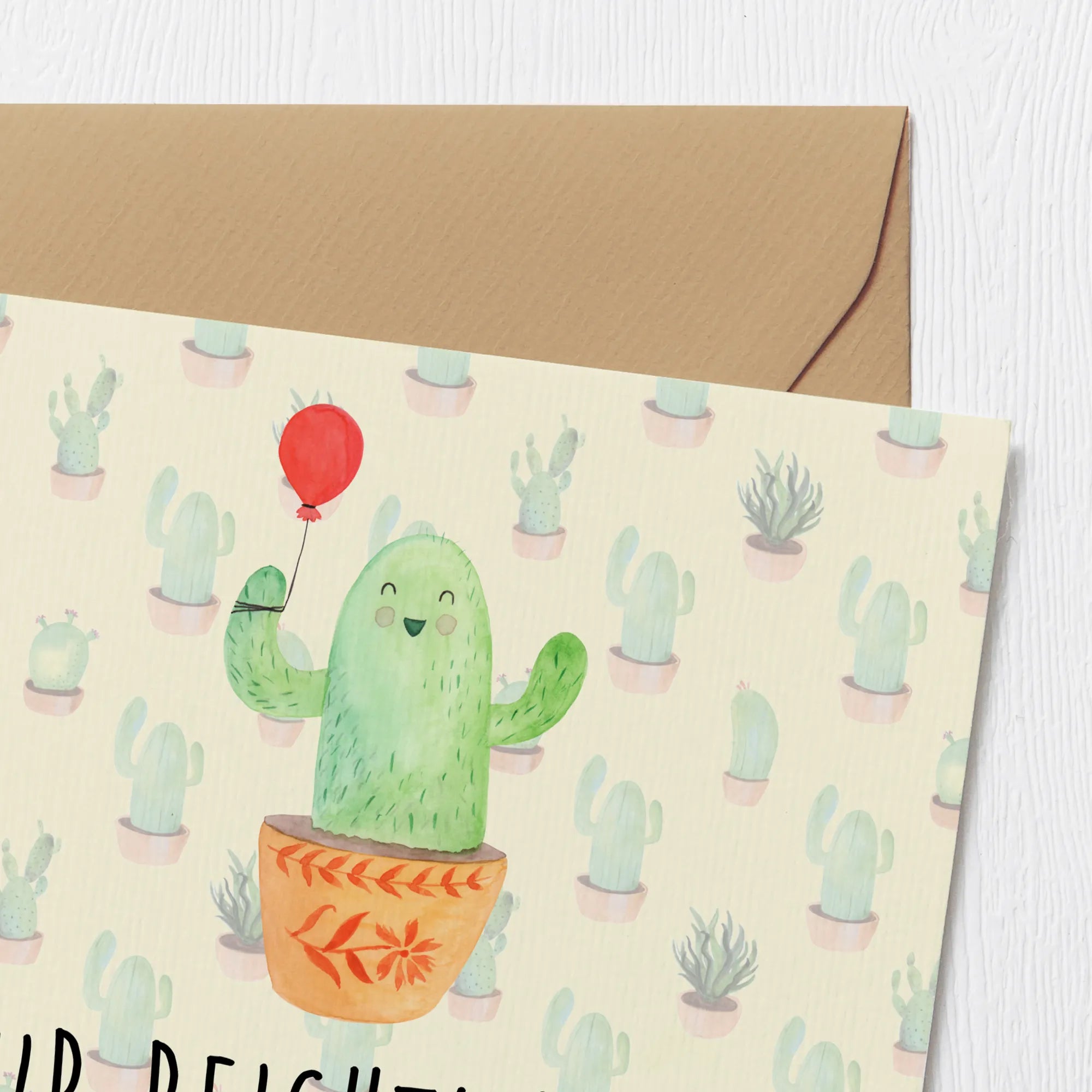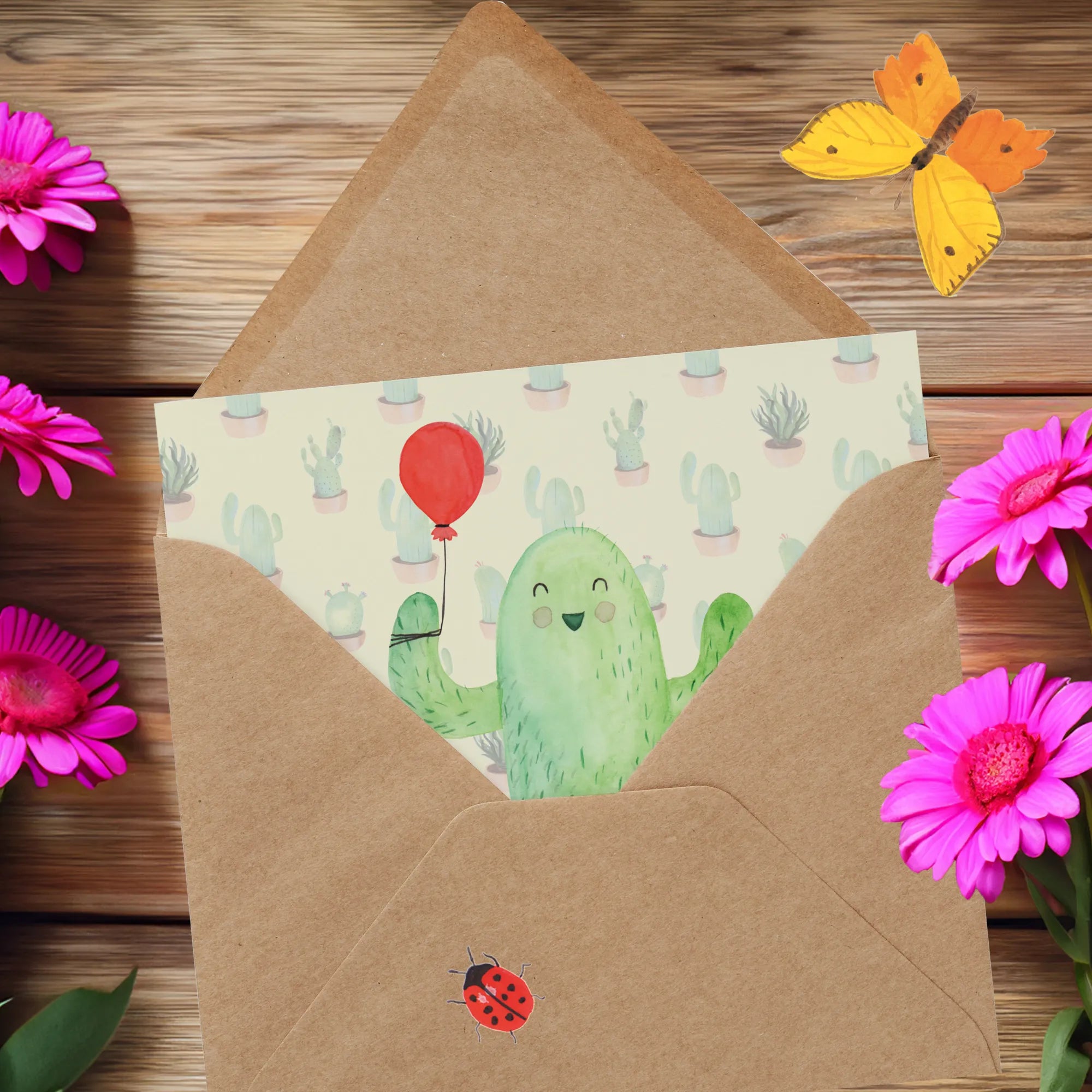 The vibrant design showcases a cheerful cactus holding a balloon, bringing a splash of creativity and a touch of whimsy to every occasion. The Cactus Balloon card belongs to our delightful Cactus - Collection, where each card is a unique piece of art that brings good vibes. Mrs. Panda has hand-painted these lovable cacti with watercolors, capturing their playful spirit.