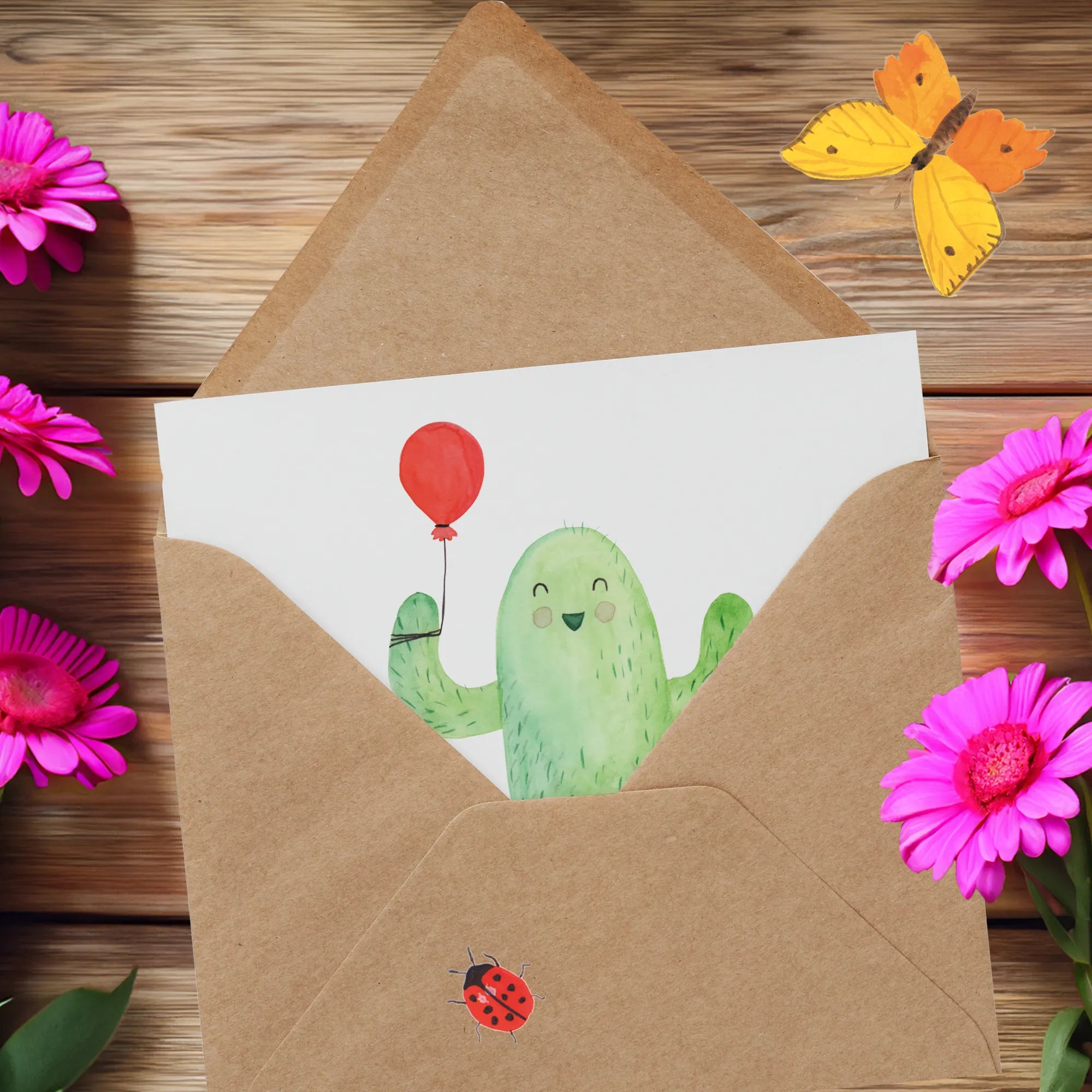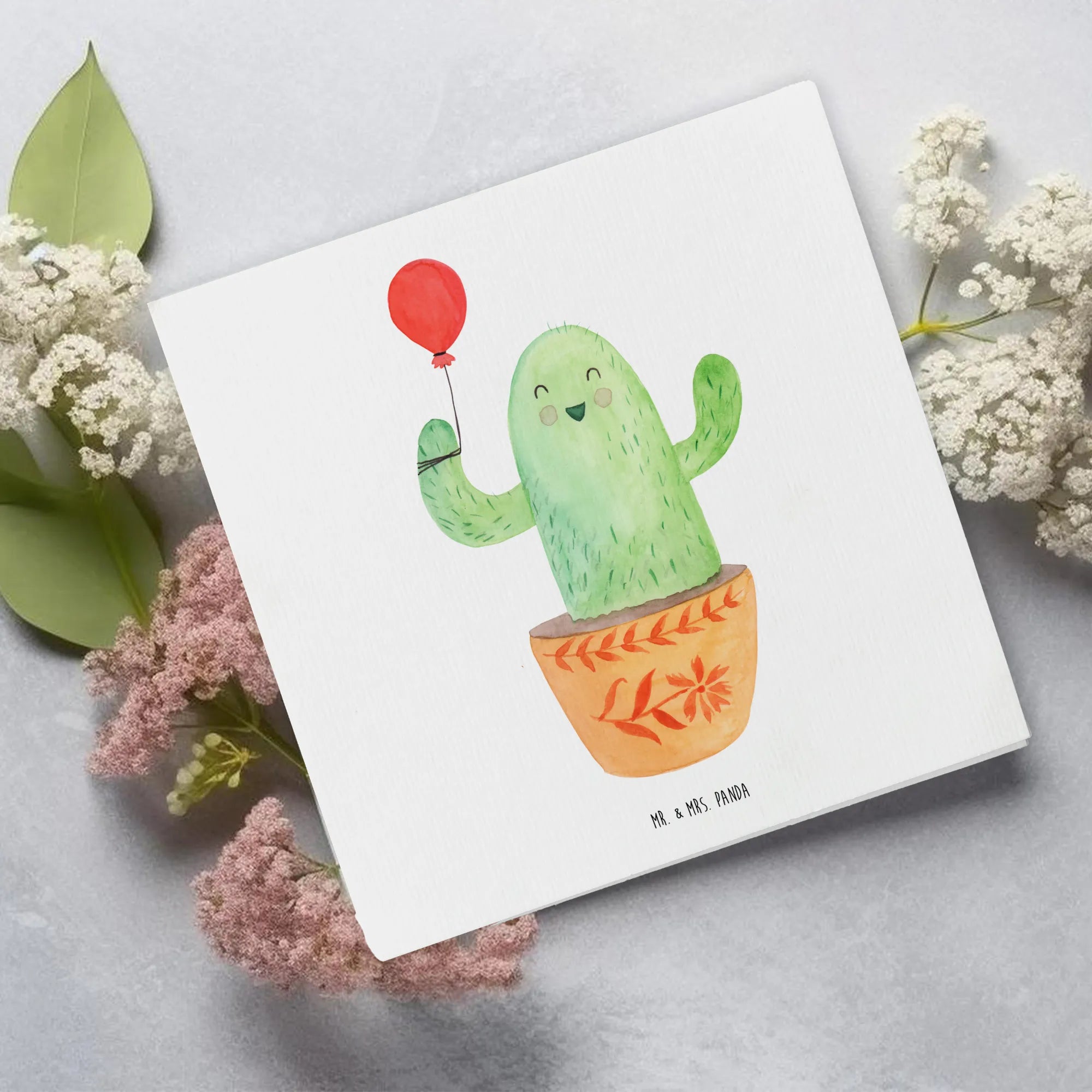 The whimsical design showcases a cheerful cactus holding a cute balloon, hand-painted in watercolor by the talented Mrs. Panda. The vibrant colors and playful motifs make it a perfect choice for those who want to brighten someone’s day or express their warmest wishes.