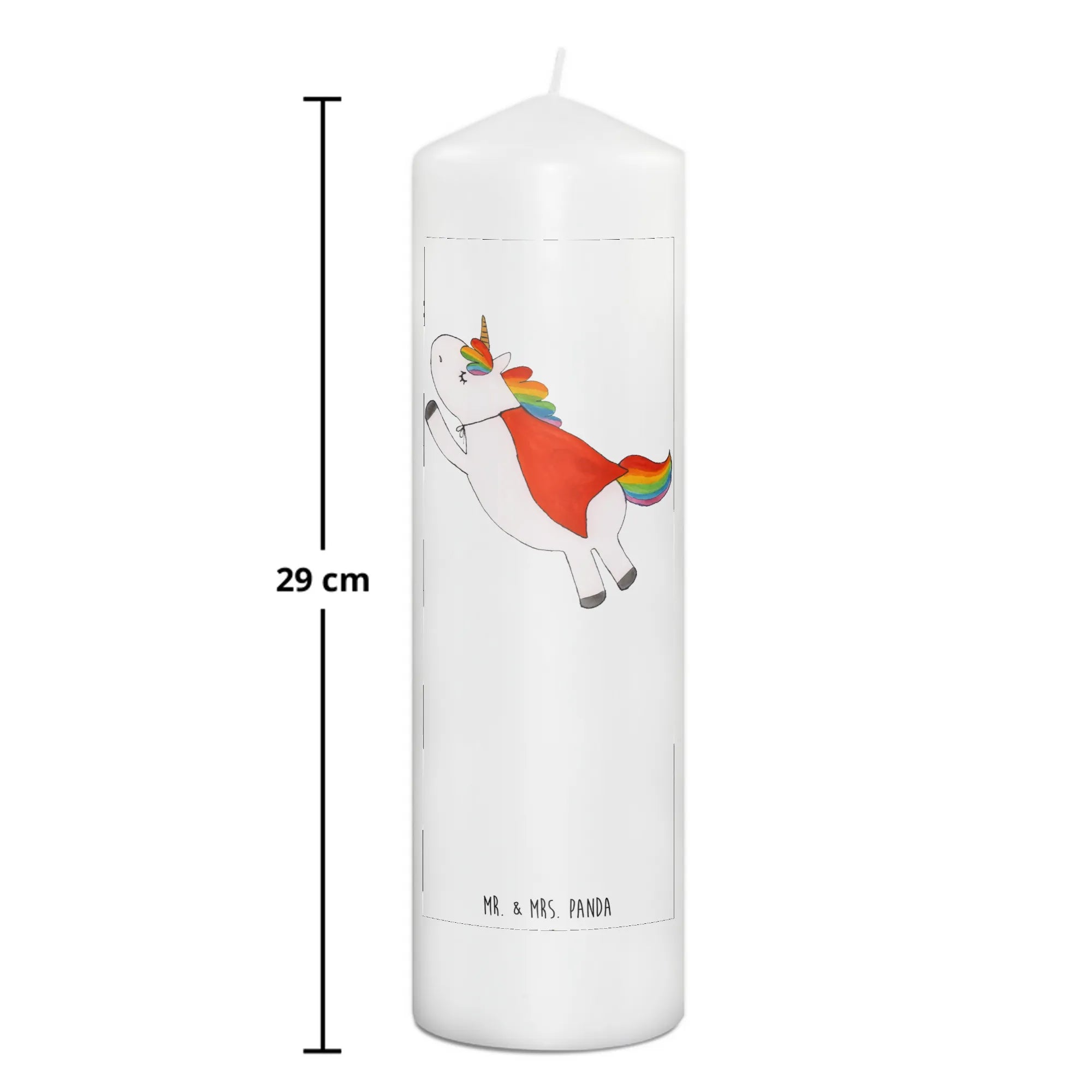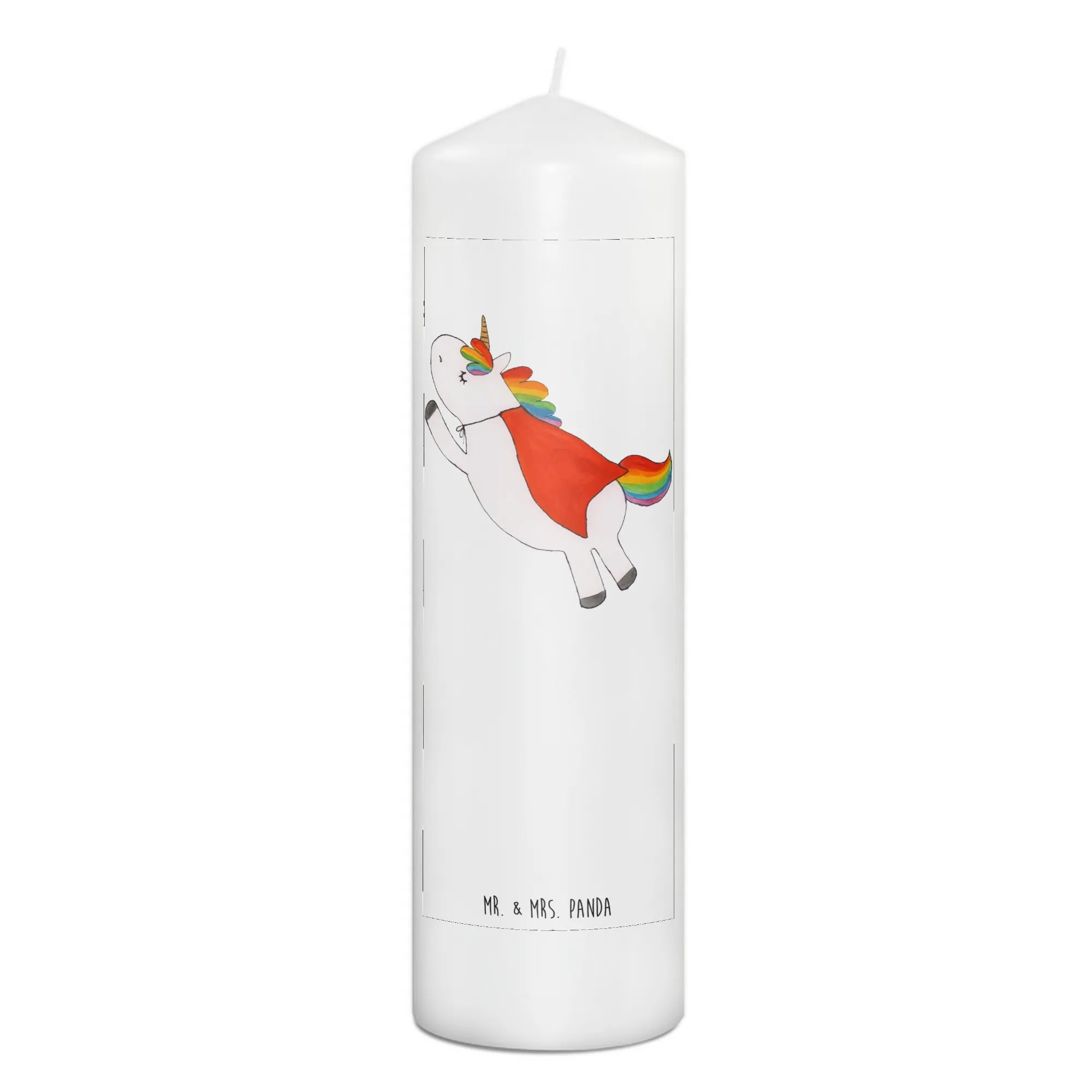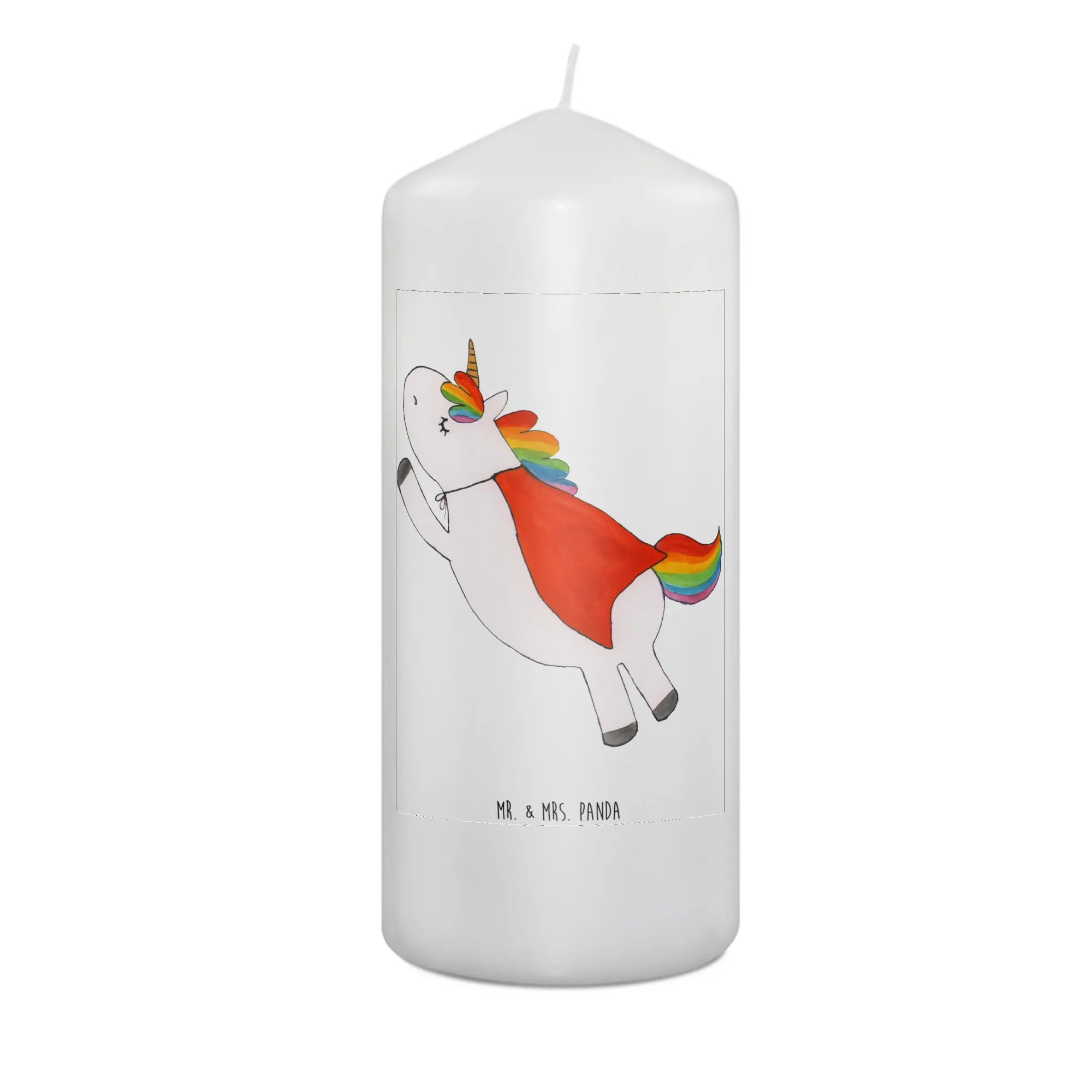 What makes the Unicorn Superman Birthday Candle extra special? Every piece in our exclusive Unicorn Collection by Mr. & Mrs. Panda is designed with love in Hanover, Germany. Each motif is hand-drawn by Mrs. Panda, resulting in a unique color experience that transforms every candle into a special art piece. The design features a whimsical superhero unicorn that will catch the eye of every young superhero fan and inspire boundless imagination with each flicker.