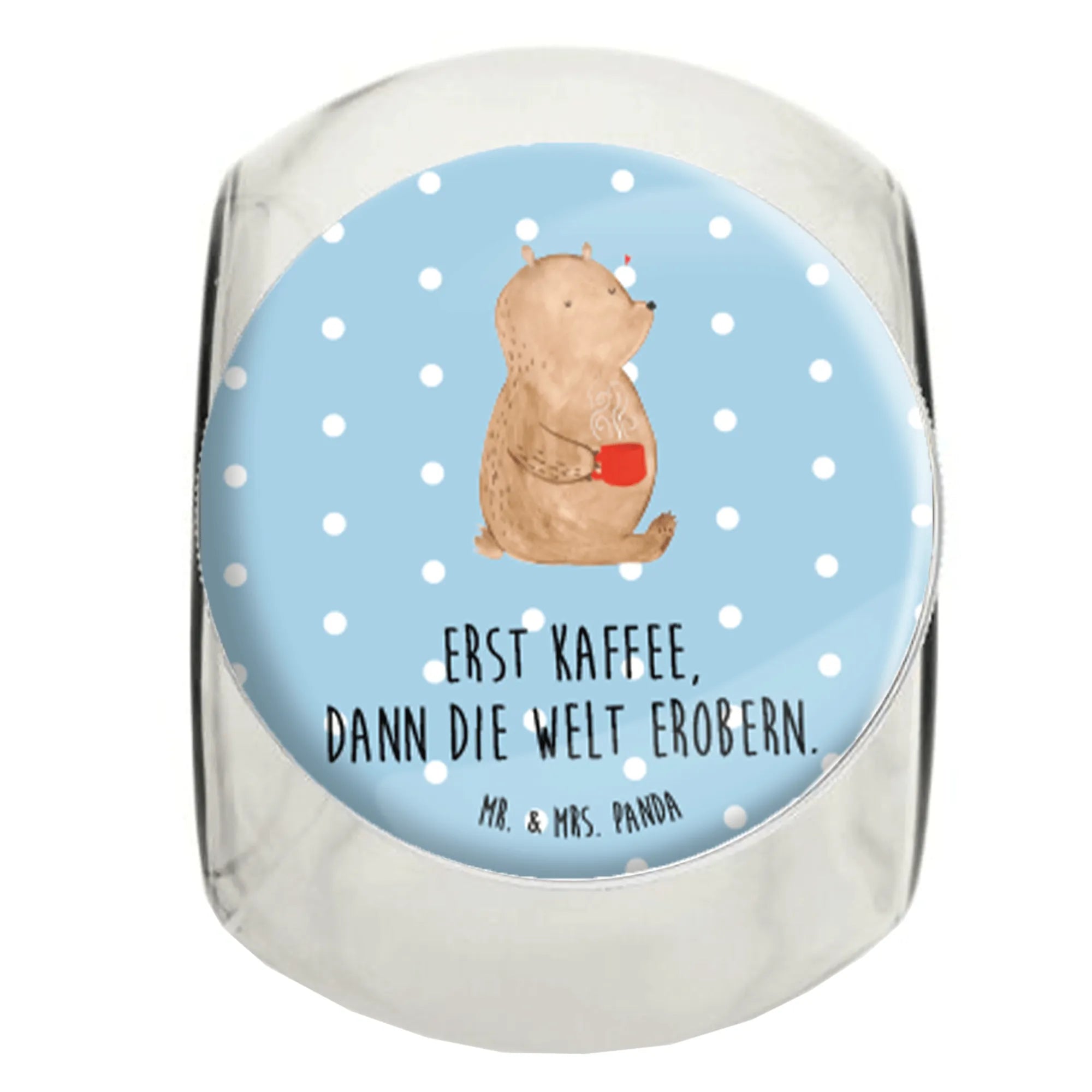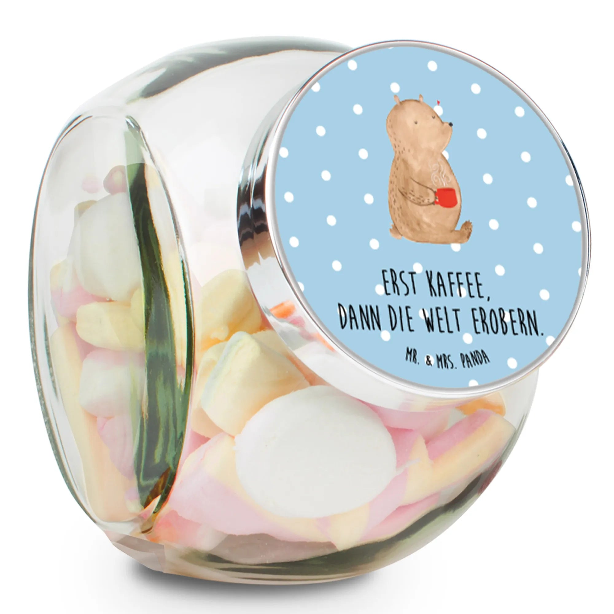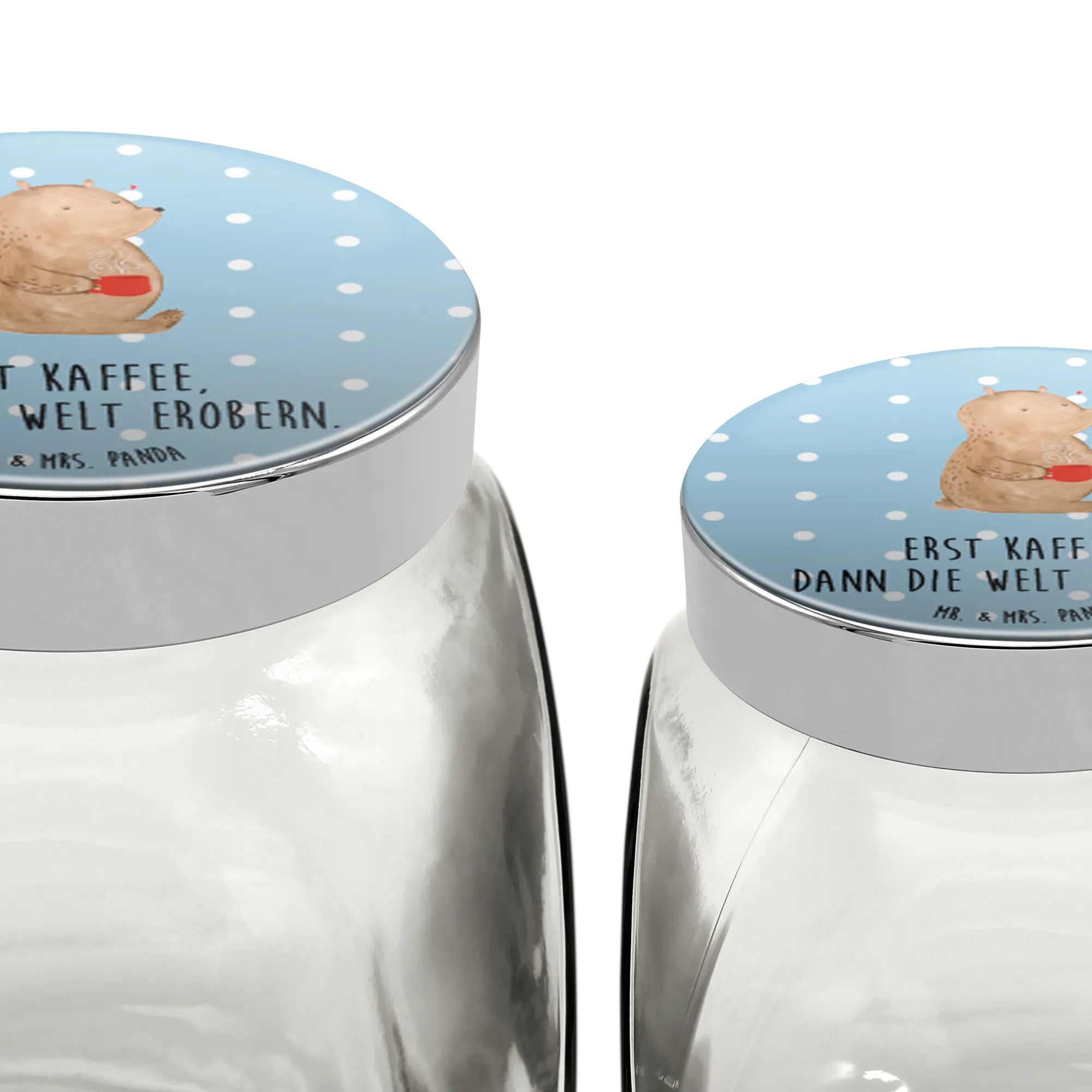 Looking for a thoughtful gift for a birthday, housewarming, or just to cheer someone up? This candy jar is an ideal choice! It resonates beautifully with coffee lovers who appreciate cuddly bears and have a cheerful morning routine. The sweet and cozy illustration makes it a perfect present for anyone who enjoys a little motivation as they sip their morning brew: “First coffee, then conquer the world!”