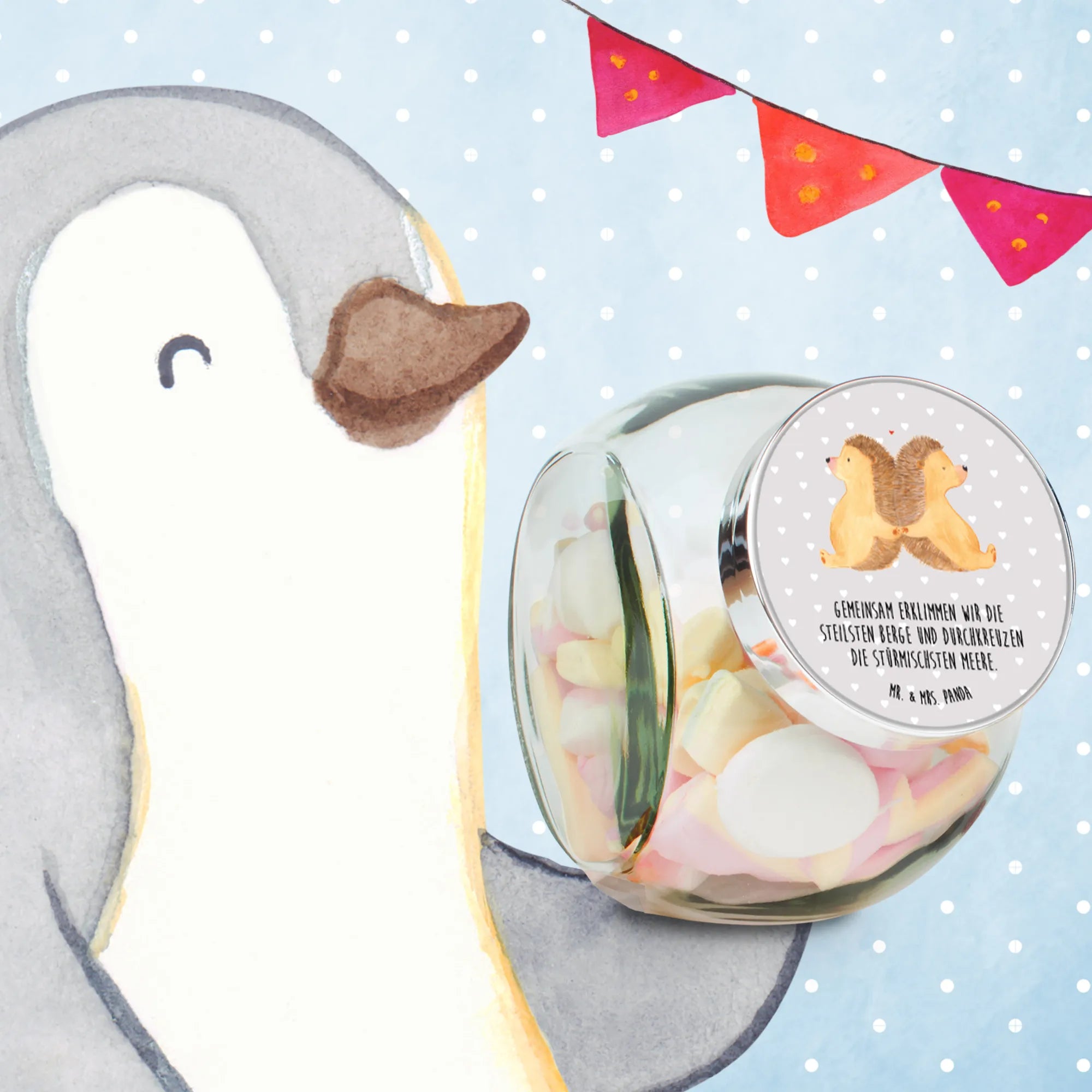 Candy Jar Hedgehogs holding hands - L 870ml - with saying - Pastel Gray