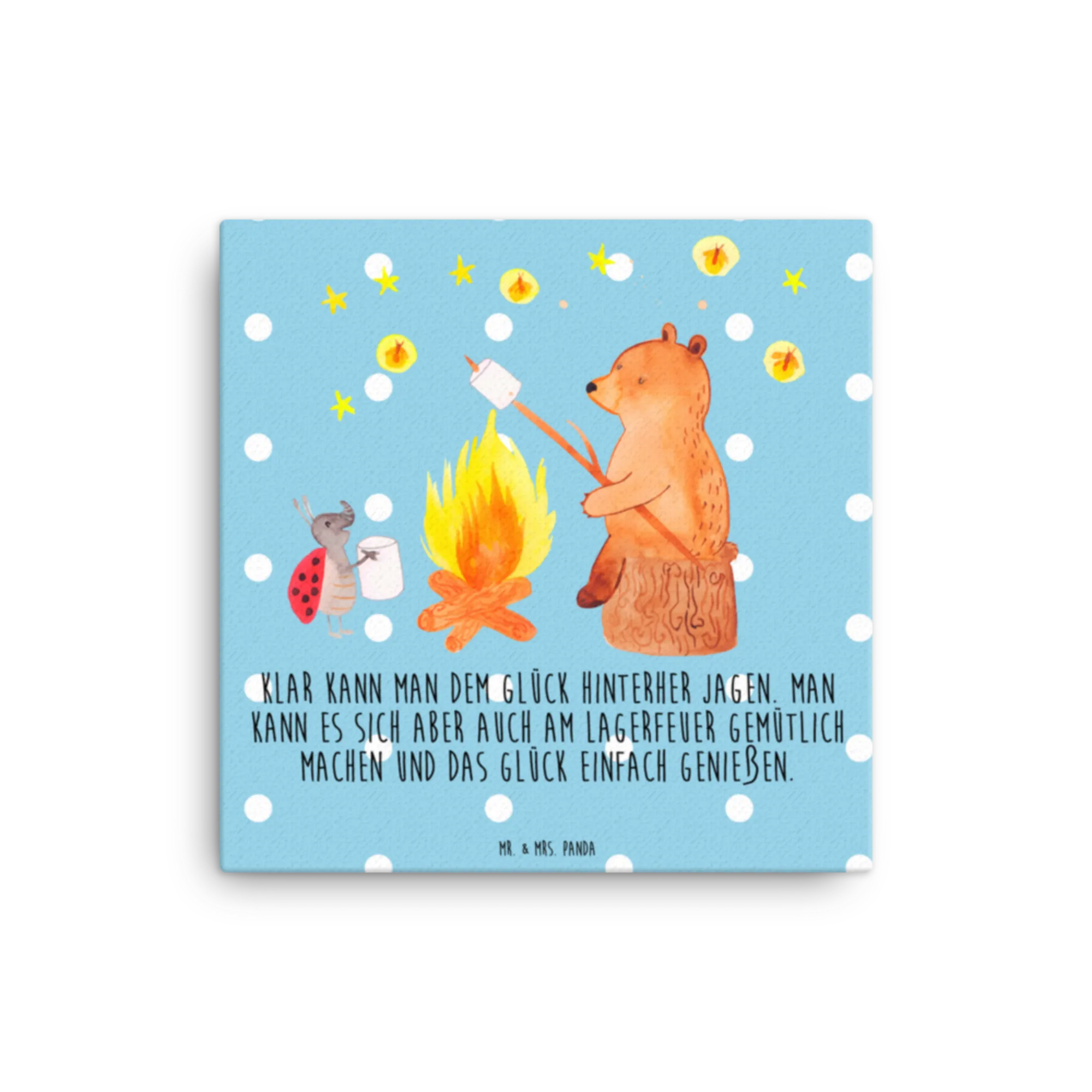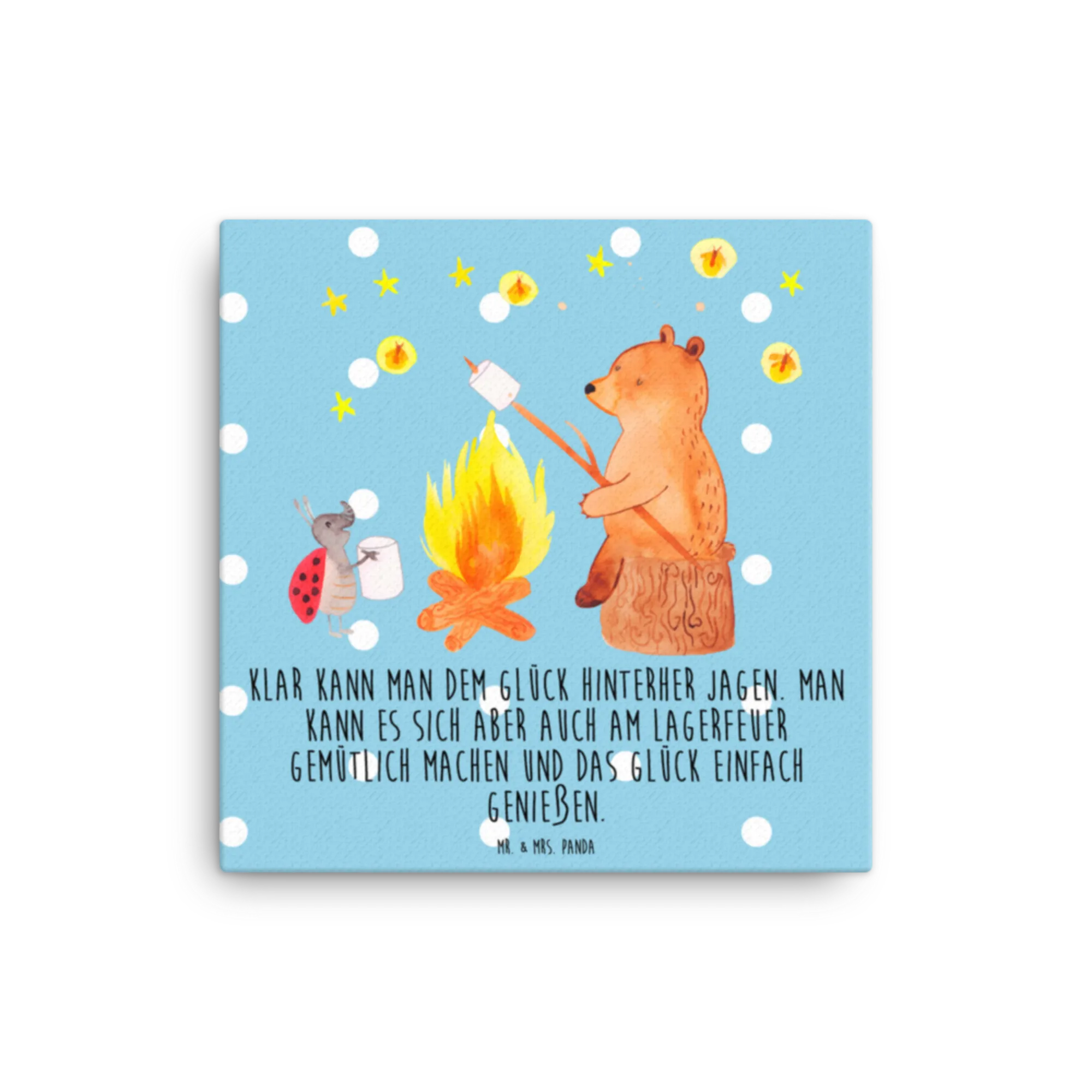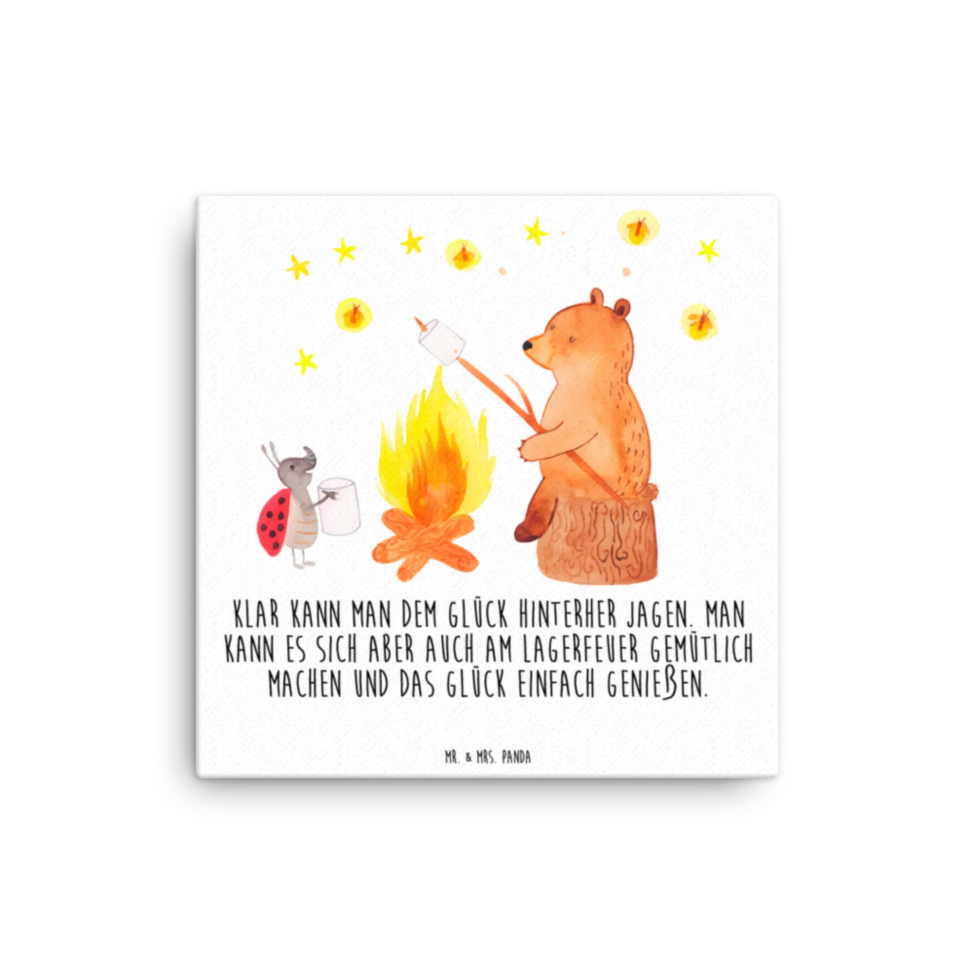 Canvas picture Bear & Ladybird campfire - 40 x 40 cm - with a saying - White