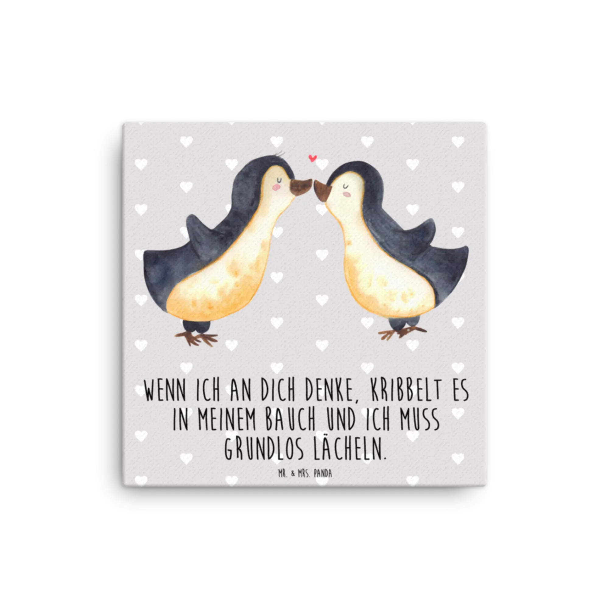 This charming motif of penguins sharing a kiss speaks volumes about love in its most innocent form. Their tender expressions and the sweet floating heart evoke a warmth that anyone can relate to. With soft shades of yellow and gray, this design isn't just visually appealing; it's a heartwarming reminder of what love truly feels like. It serves as an incredible Valentine’s Day gift or a touching wedding anniversary keepsake, perfectly highlighted by the slogan: 'When I think of you, I get butterflies in my stomach and can’t help but smile.'