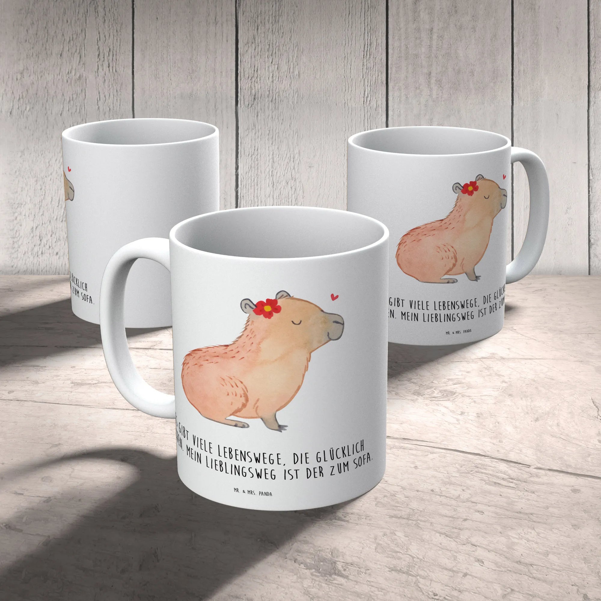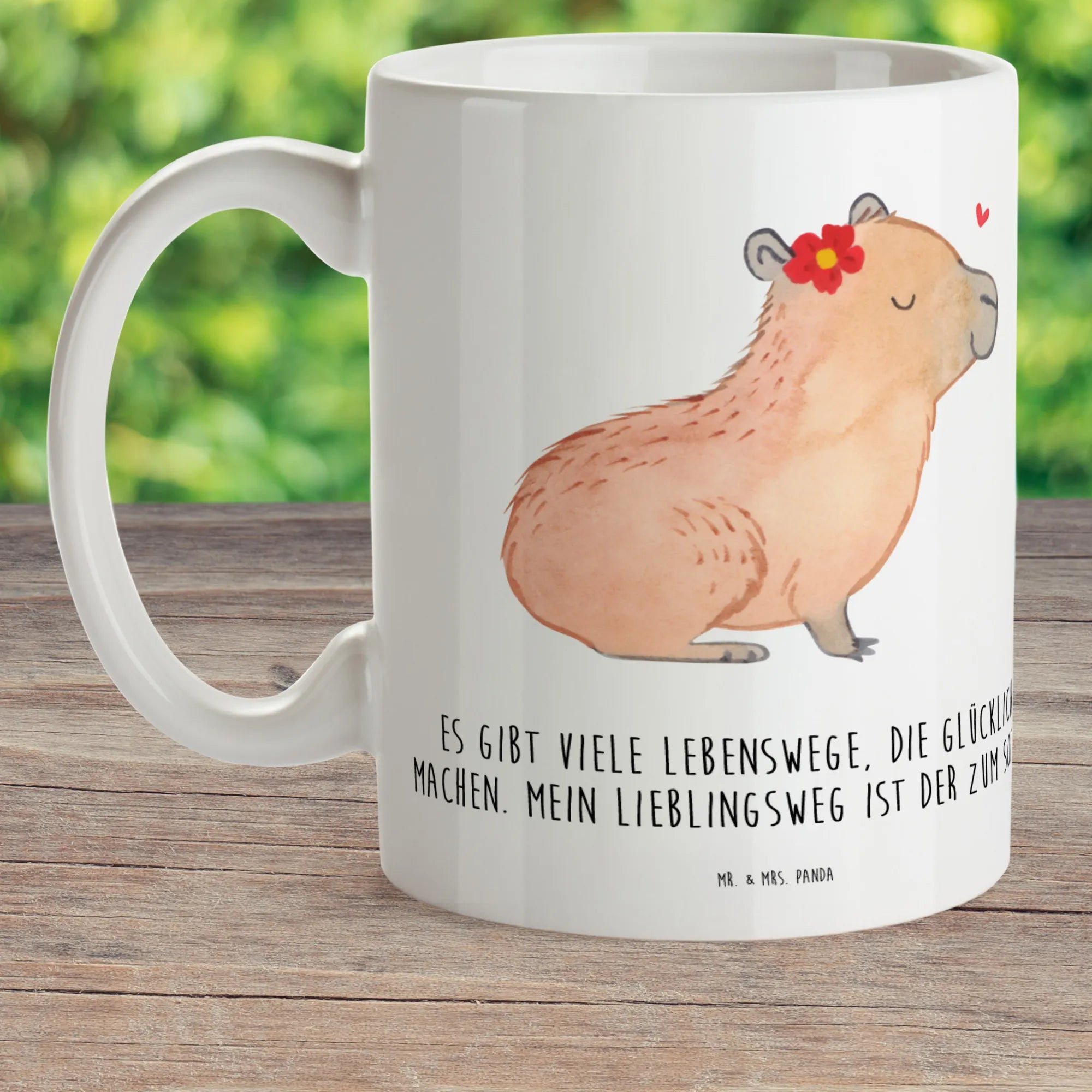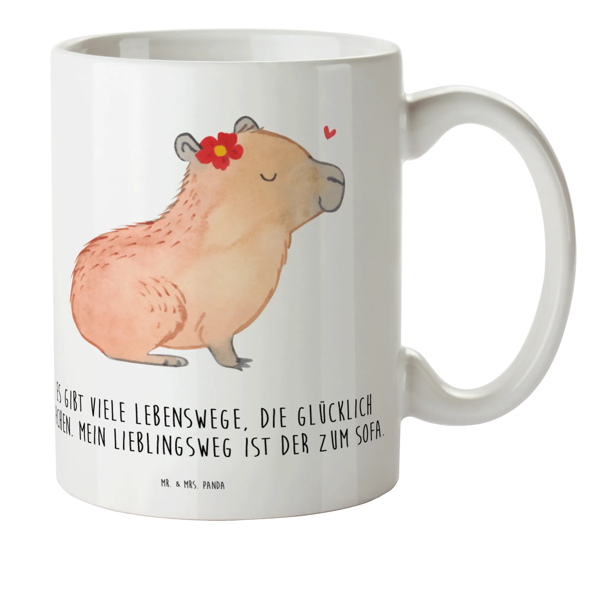 Introducing the delightful Capybara Flower! This cheerful motif features a happy, blissed-out capybara, deeply relaxed with a radiant red flower balancing on its head. The splash of yellow at the center of the flower adds a playful touch while the heart above hints at the love embedded in simplicity. Calm and content, this capybara embodies the philosophy that Es gibt viele Lebenswege, die glücklich machen. Mein Lieblingsweg ist der zum Sofa. So take a break, find your spot, and let joy embrace you!