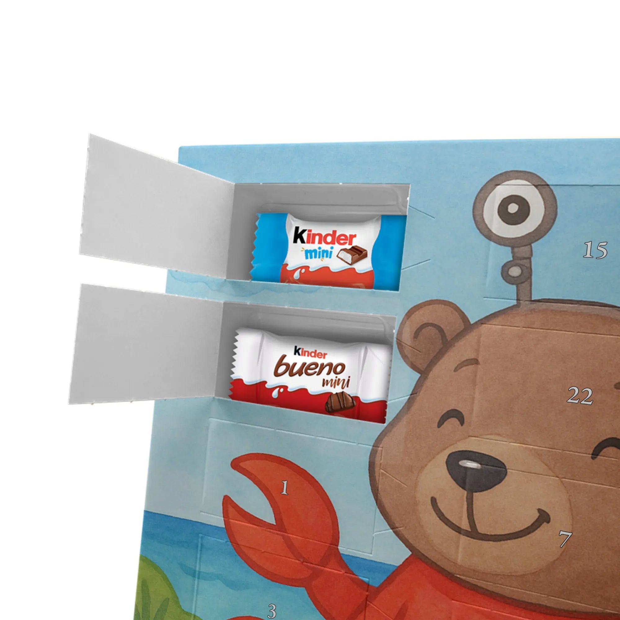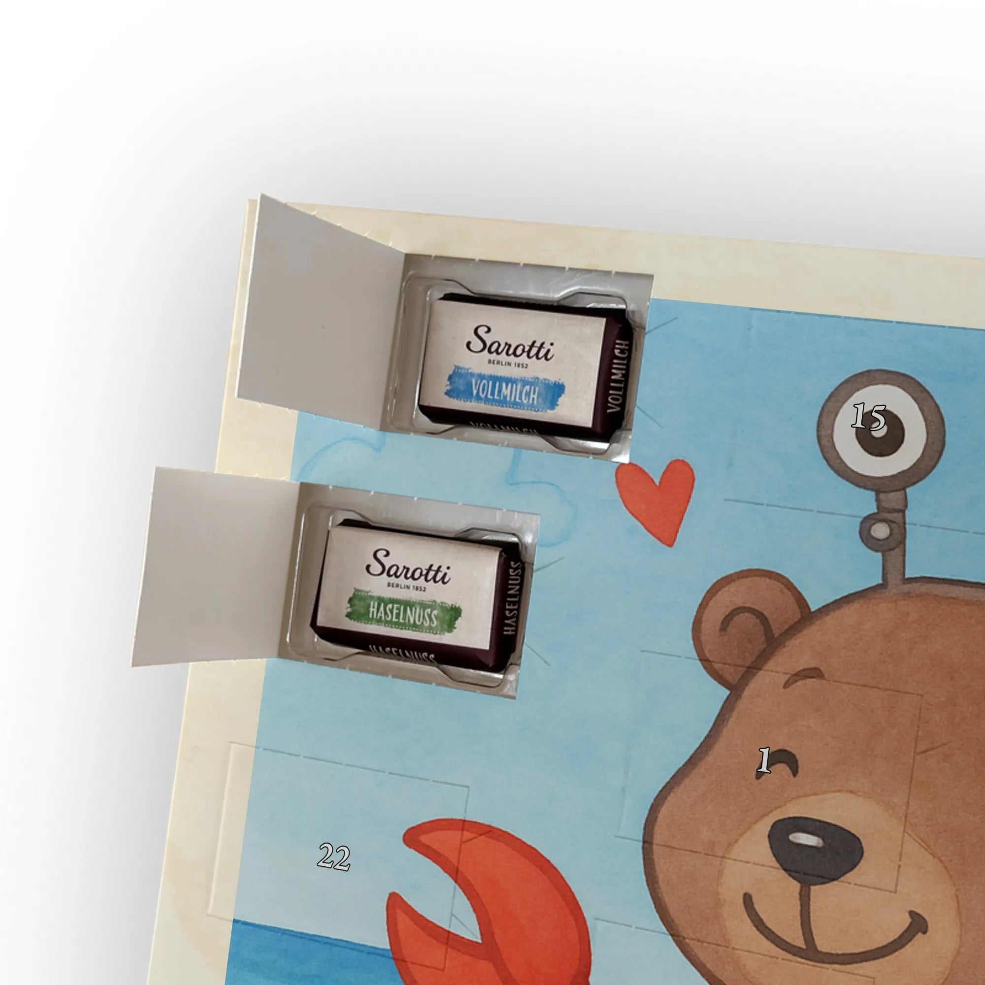 Stell Dir vor, wie jeden Adventstag ein kleines Türchen geöffnet wird und darunter ein köstlicher Ritter Sport Schokowürfel wartet. Unser Adventskalender mit Schokolade vereint liebevolle Illustration und feinen Genuss: Ein handgezeichnetes Motiv zeigt einen niedlichen Bären im roten Krebskostüm, der ein orangefarbenes Herz hält. Der sorgsam gesetzte Spruch „Krebs: Sanft wie der Mond, tief wie das Meer.“ macht diesen Weihnachtskalender Schokolade besonders persönlich.