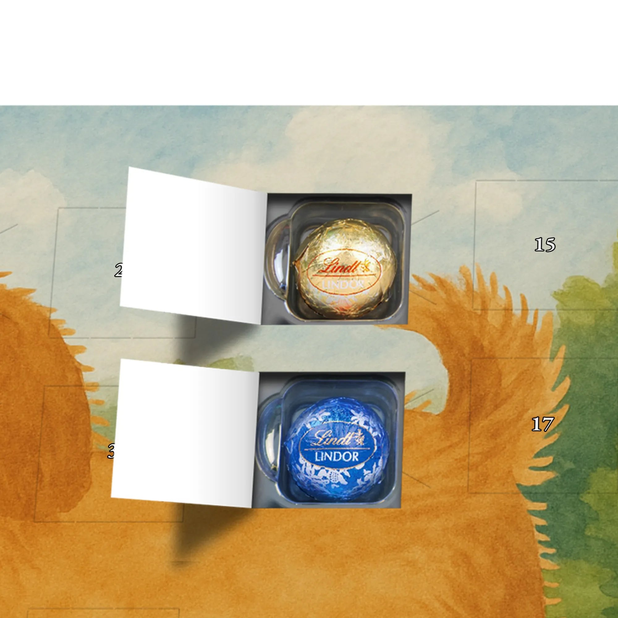 This handy advent calendar 2020 from Mr. & Mrs. Panda is really something very special - it is decorated with wonderful motifs and has the size 24m x 18cm x 2,5cm. It is filled with 24 chocolate balls and costs 14,90€ - the calendar can be hung up or set up using the set-up function on the back. Please note that we also have a larger calendar with delicious chocolate from Hello Lindt.