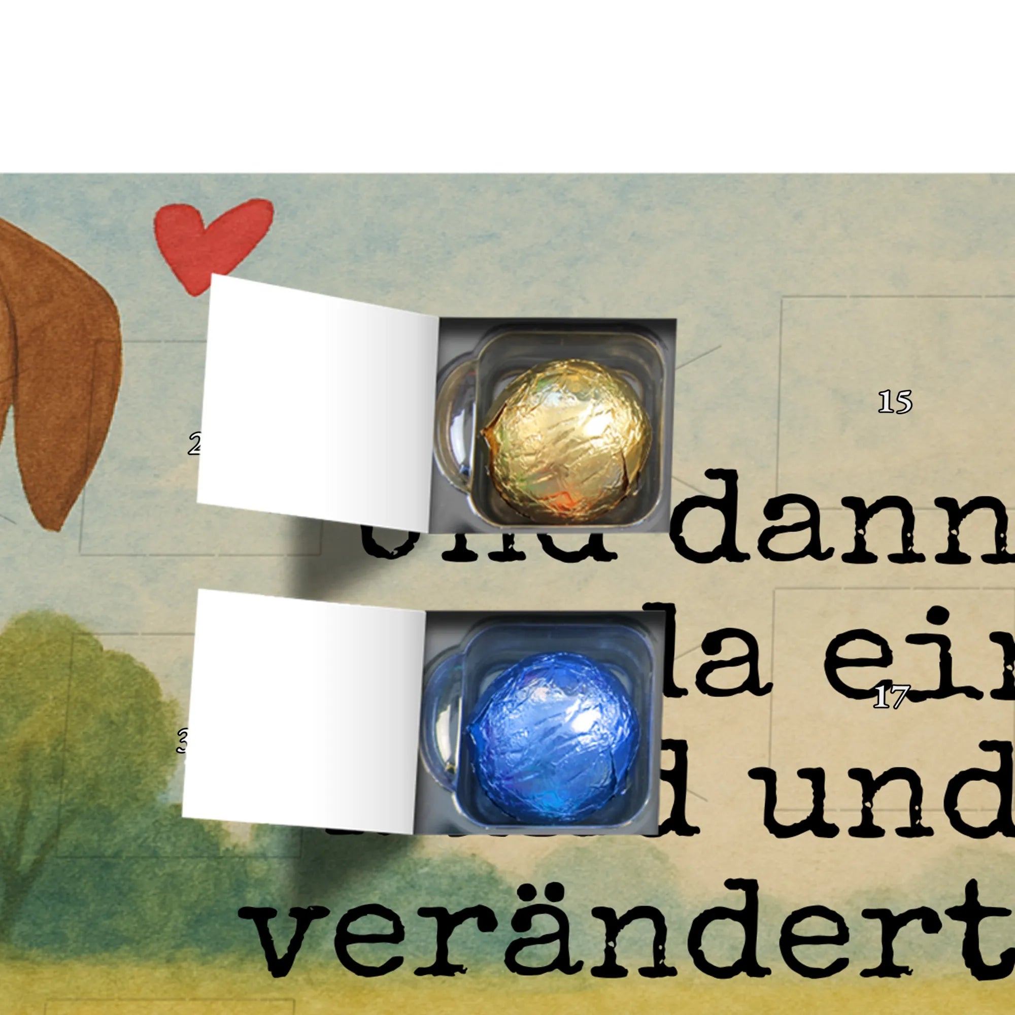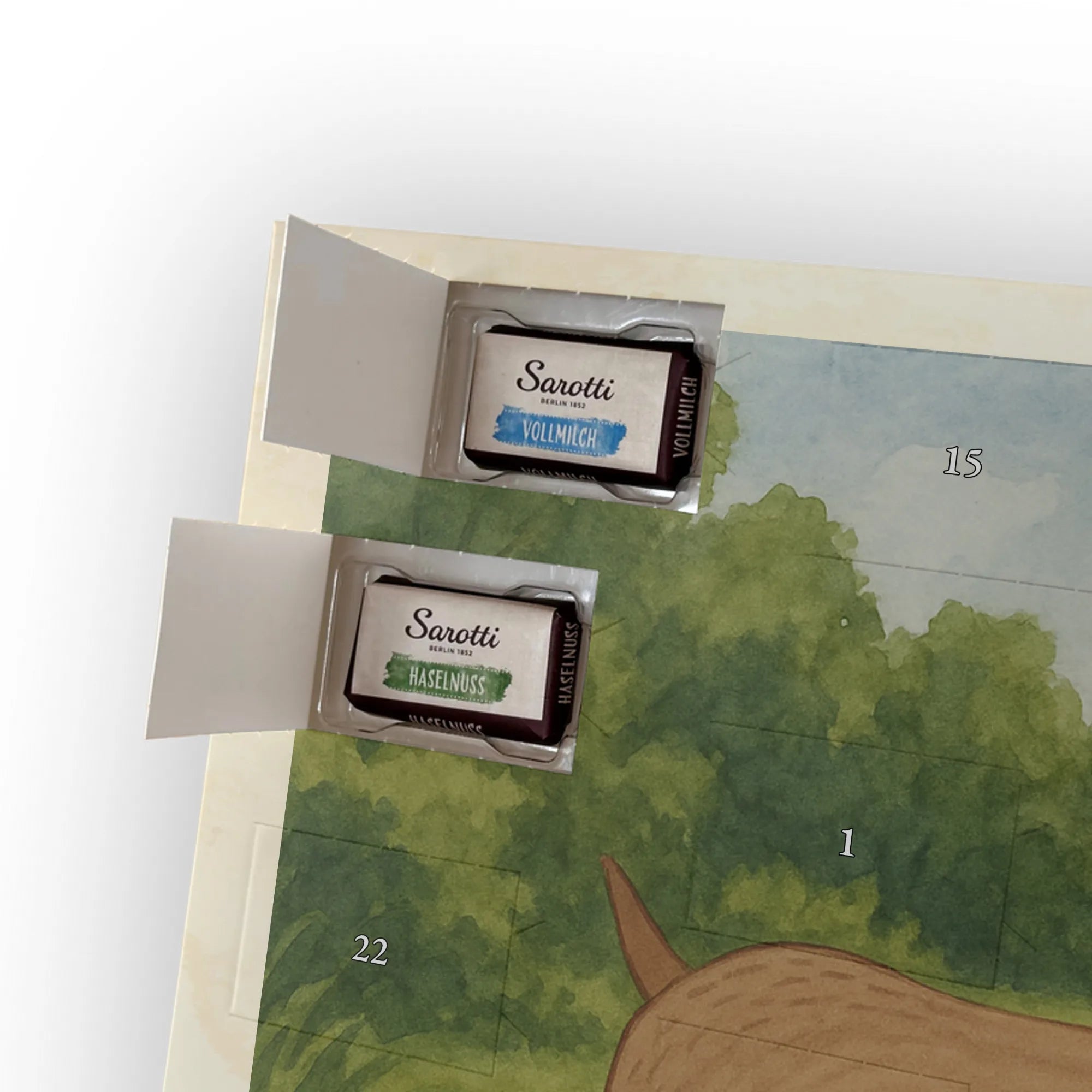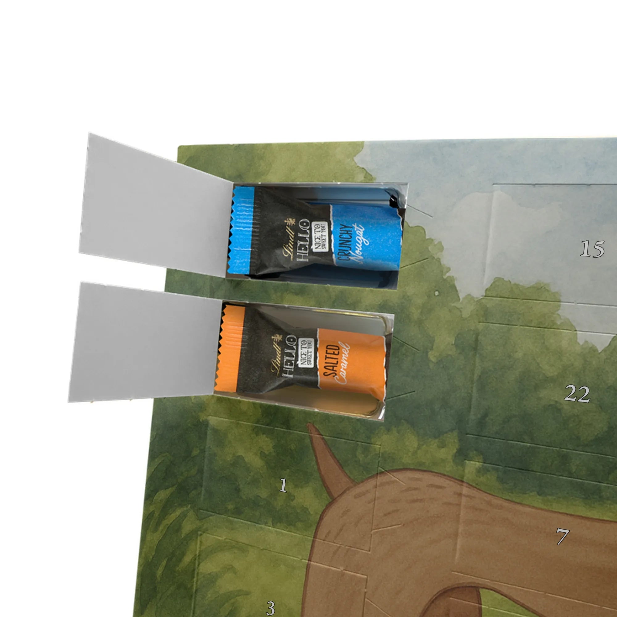 This handy advent calendar 2020 from Mr. & Mrs. Panda is really something very special - it is decorated with wonderful motifs and has the size 24m x 18cm x 2,5cm. It is filled with 24 chocolate balls and costs 14,90€ - the calendar can be hung up or set up using the set-up function on the back. Please note that we also have a larger calendar with delicious chocolate from Hello Lindt.