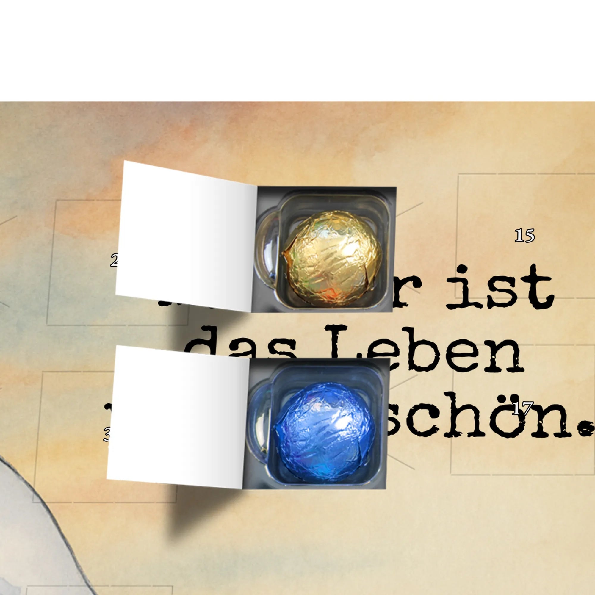 Dieser Schokoladen Adventskalender ist bedruckt mit wunderschönen Motiven & Sprüchen von Mr. & Mrs. Panda in brillanter Druckqualität mit seidenmatter Oberflächenveredelung. Die bedruckten Seitenflächen und das liebevolle Design machen den Kalender zu einer hübschen Deko, die du aufstellen oder aufhängen kannst – perfekt neben dem Weihnachtsbaum, auf der Kommode oder als Überraschung am Frühstückstisch.